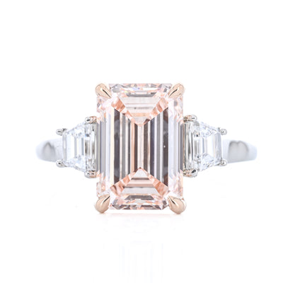 4.35CTW Emerald + Trapezoid Diamond Three Stone Engagement Ring - 18K Rose Gold + 950 Platinum