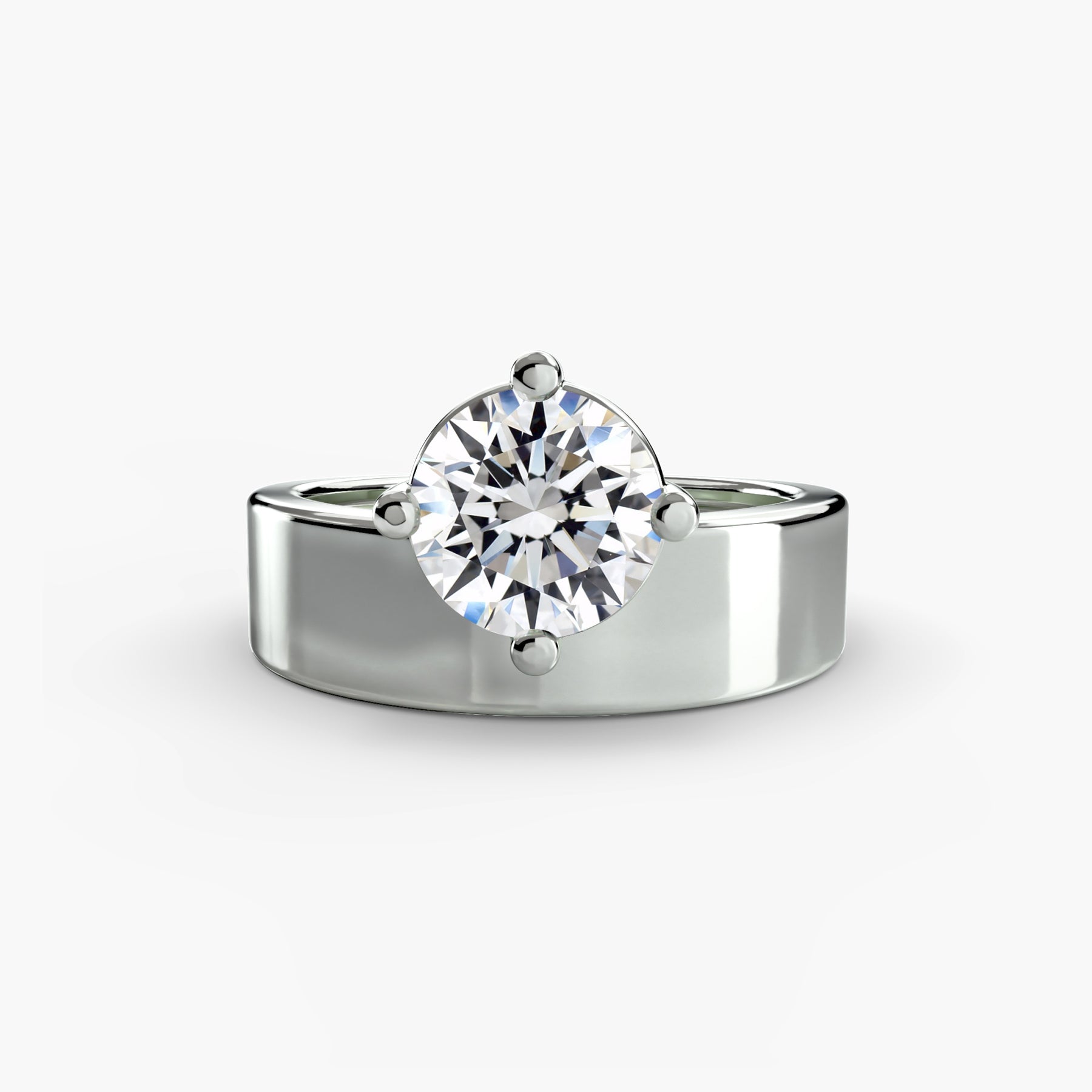 With a bold wide band, this solitaire ring makes a confident statement while highlighting the center stone with timeless elegance.