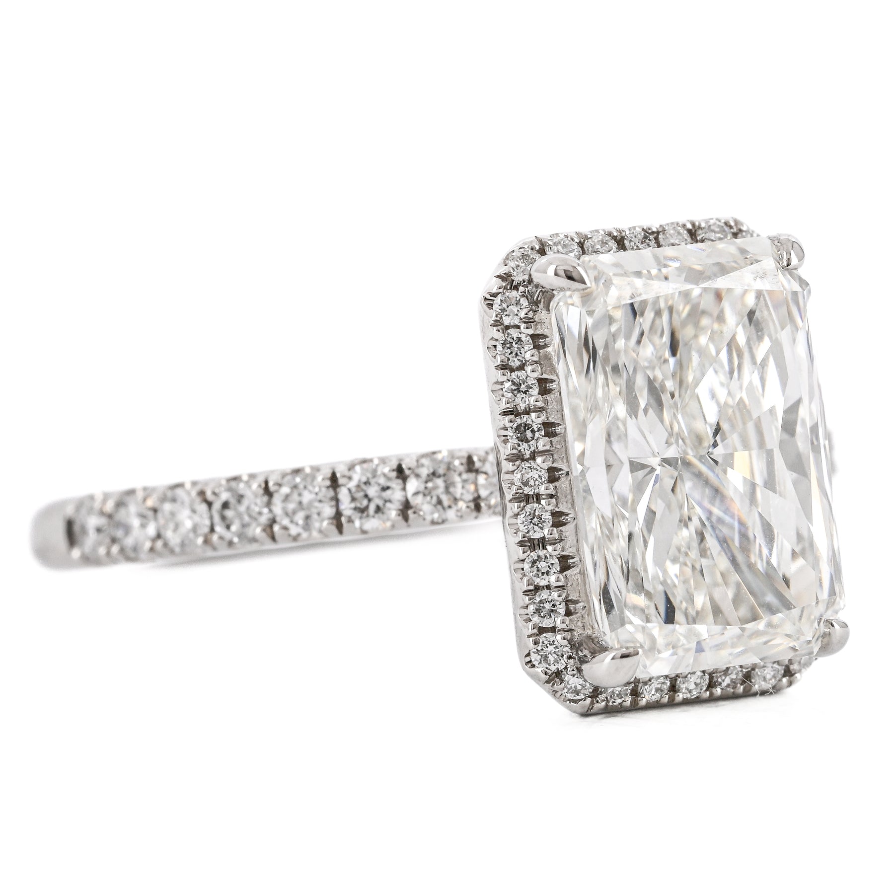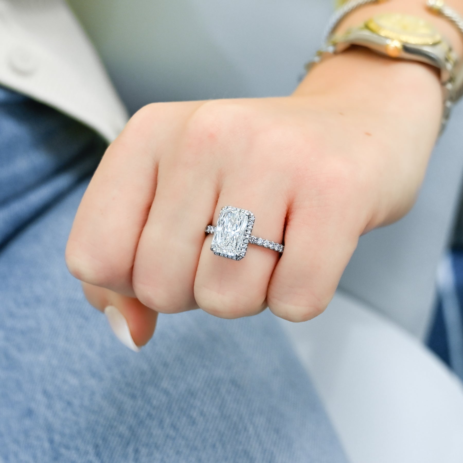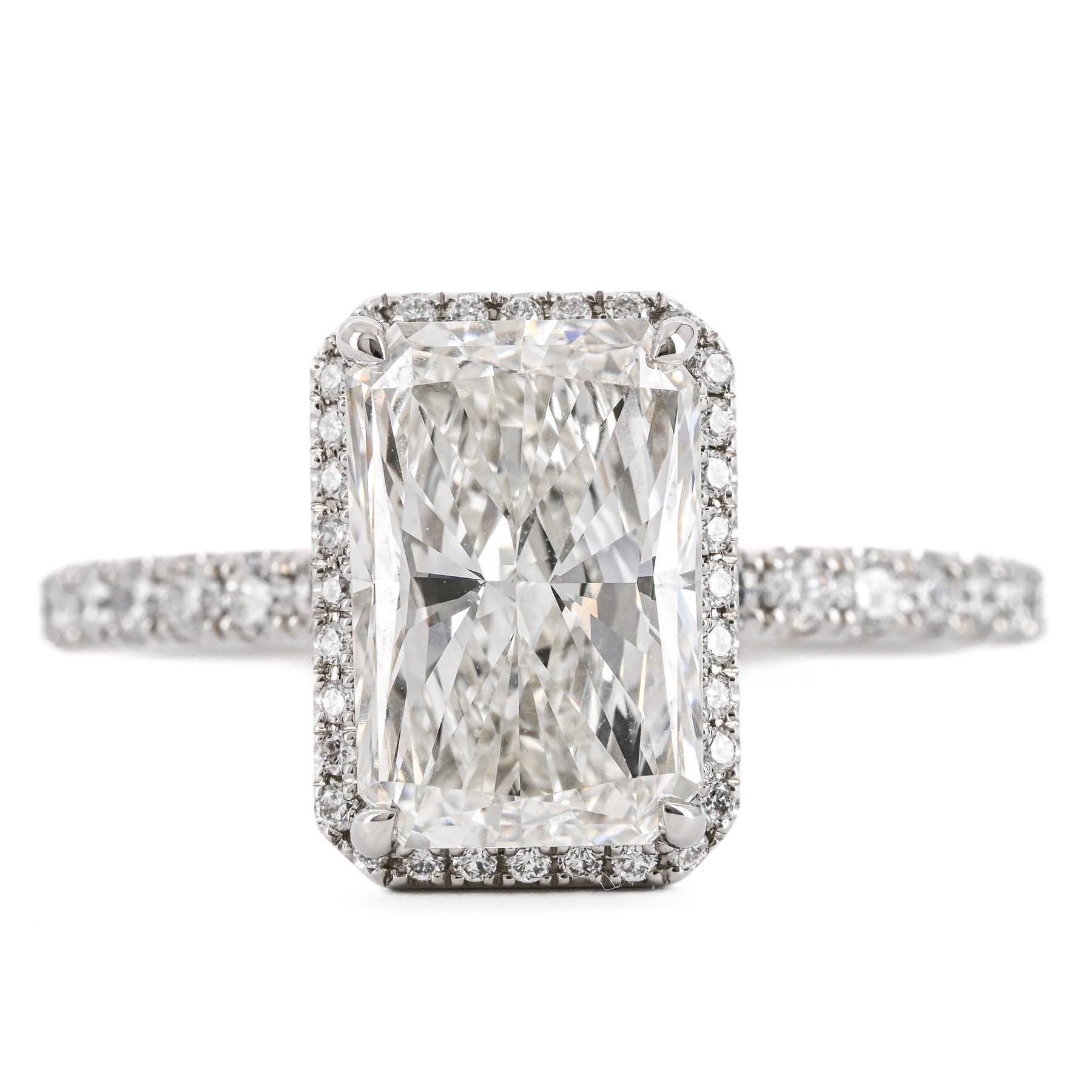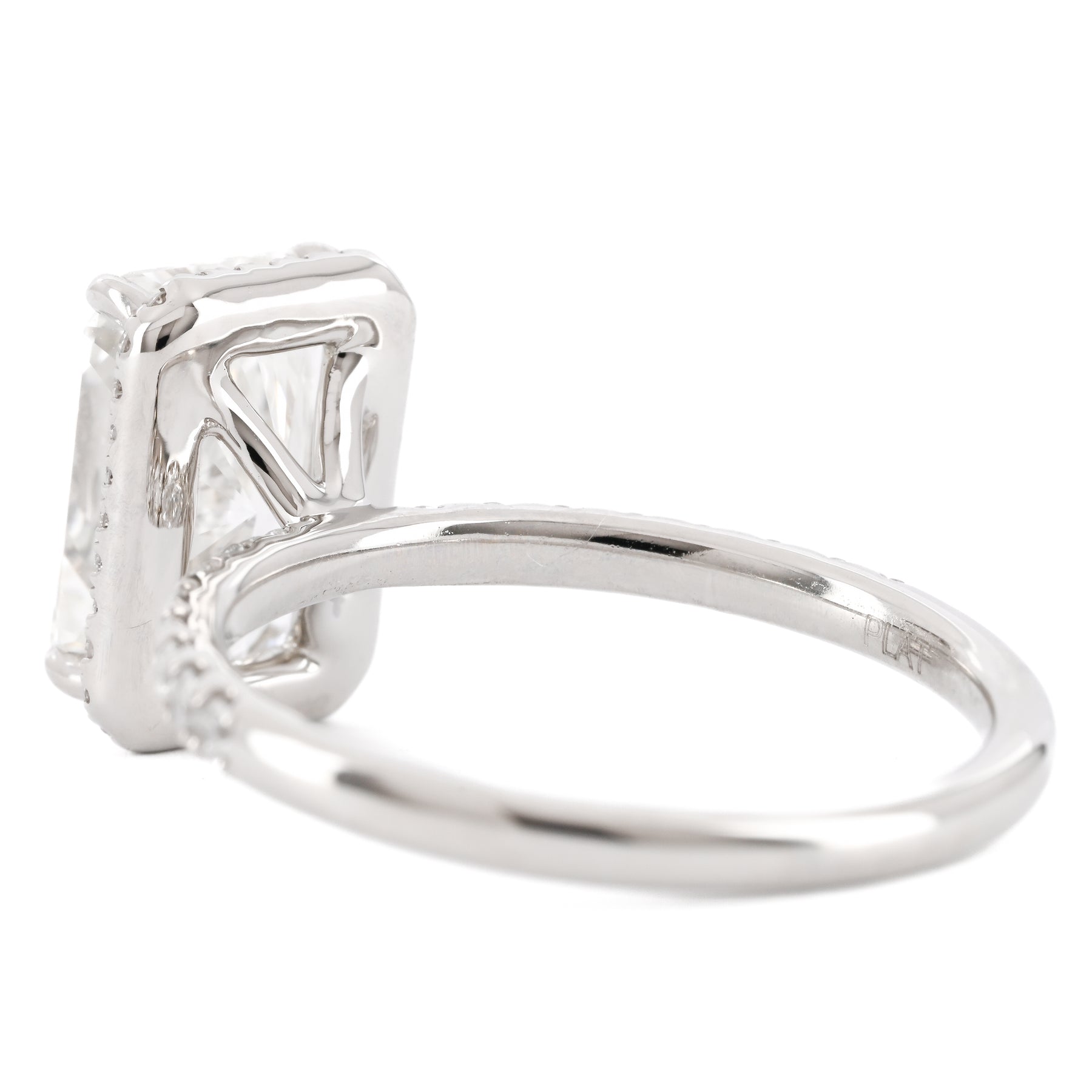 Introducing the 3.08ctw Radiant Cut Natural Diamond Engagement Ring, featuring a diamond halo. Crafted in platinum.