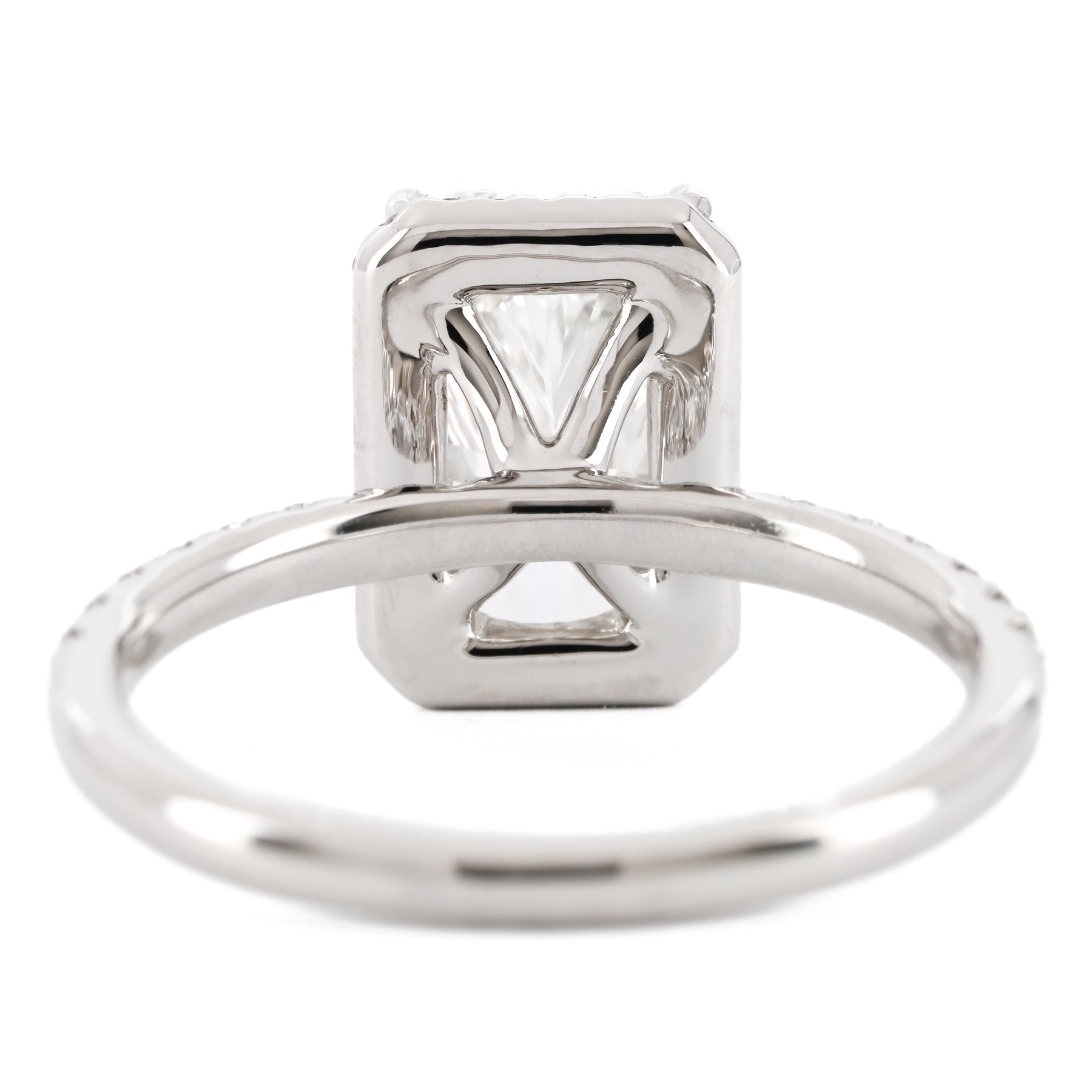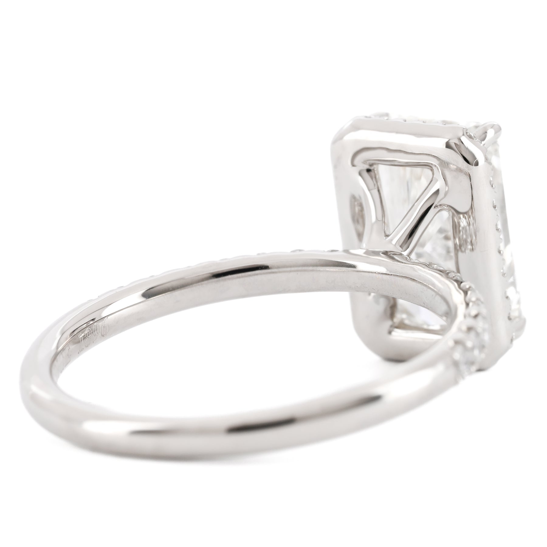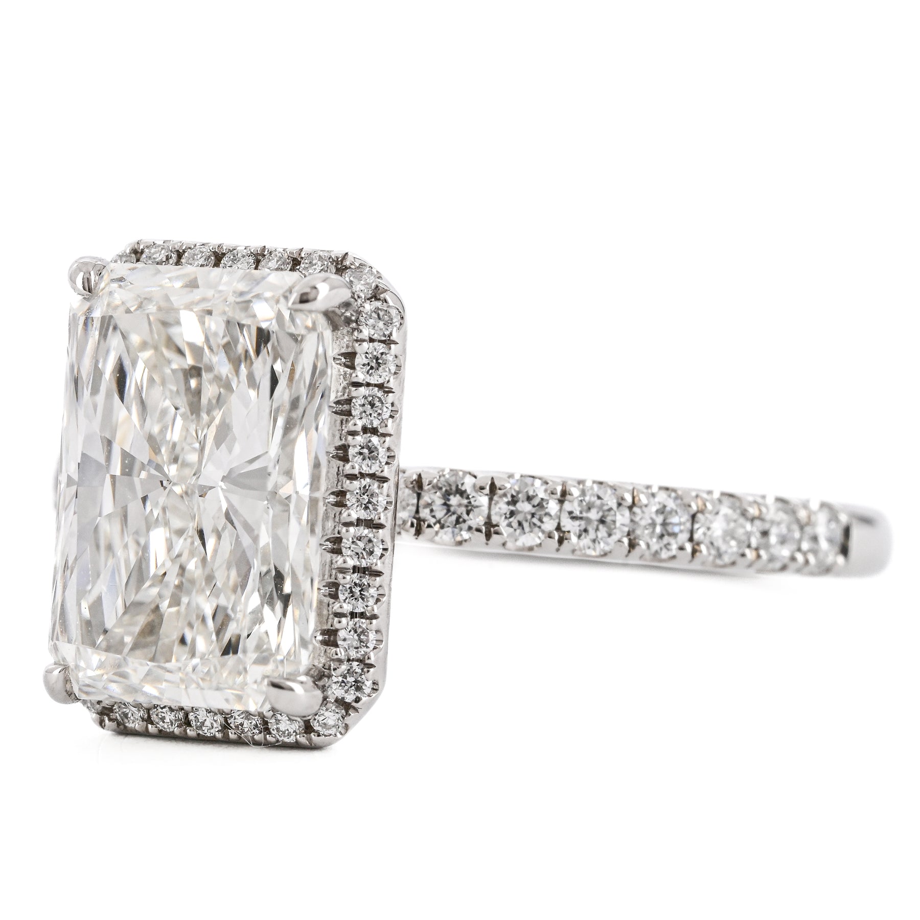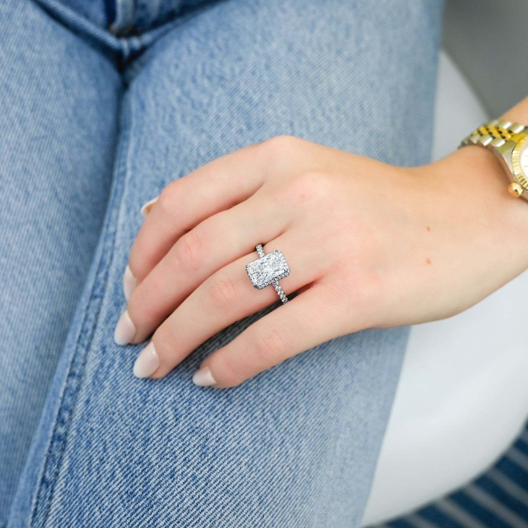 Introducing the 3.08ctw Radiant Cut Natural Diamond Engagement Ring, featuring a diamond halo. Crafted in platinum.