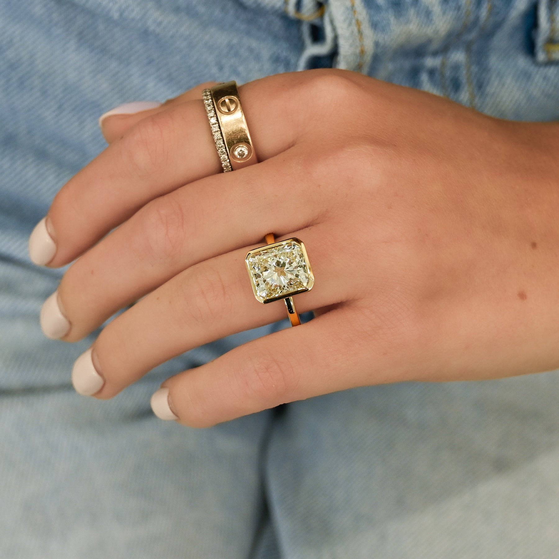 Introducing the 5.02ct Radiant Cut Diamond Bezel-Set Solitaire Ring, featuring a striking GIA-certified center stone secured in a modern 14K yellow gold bezel setting.