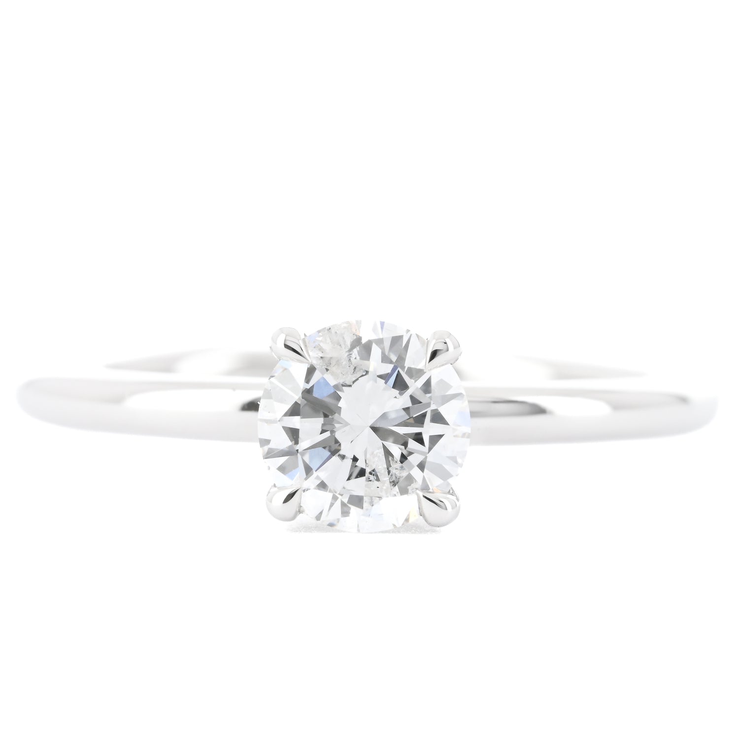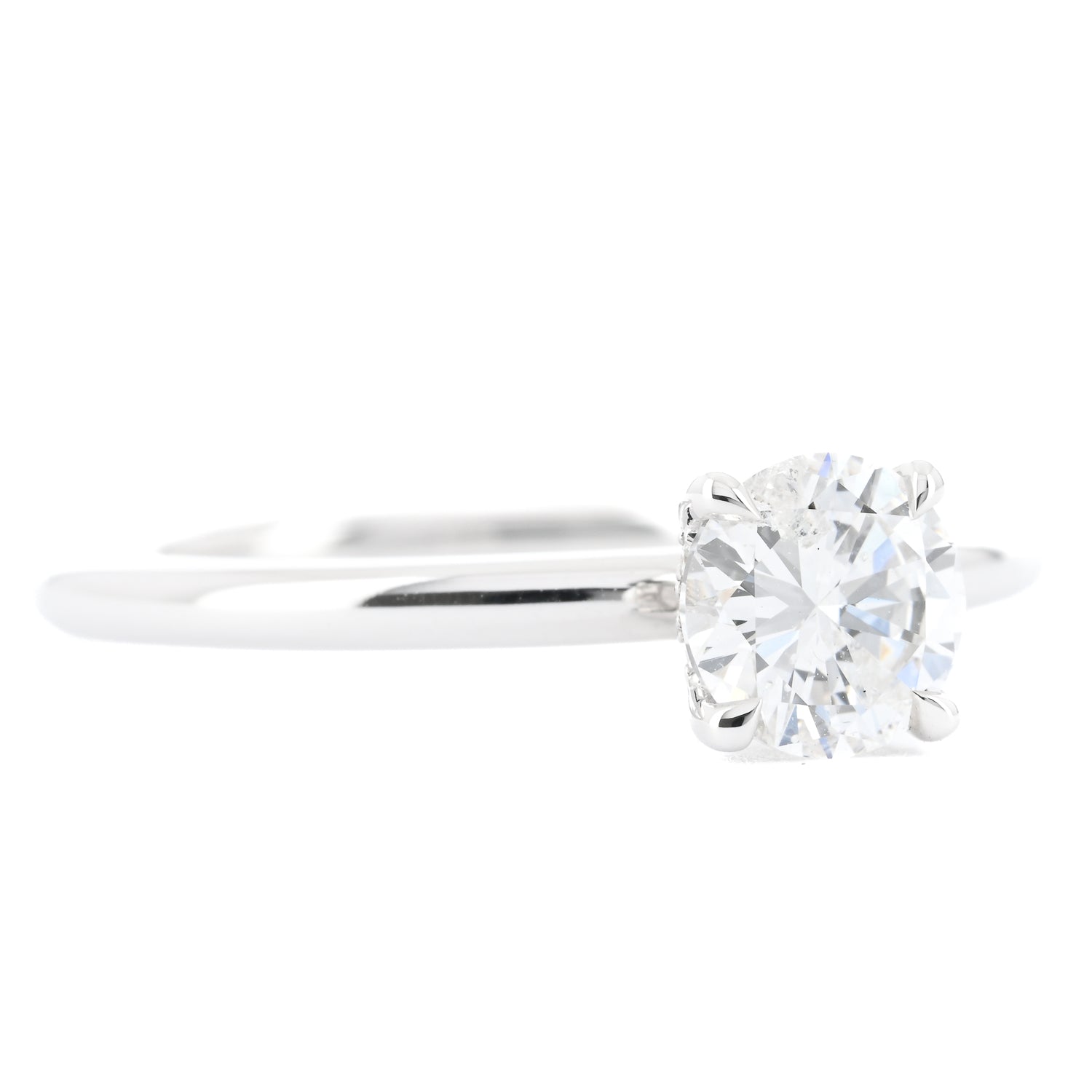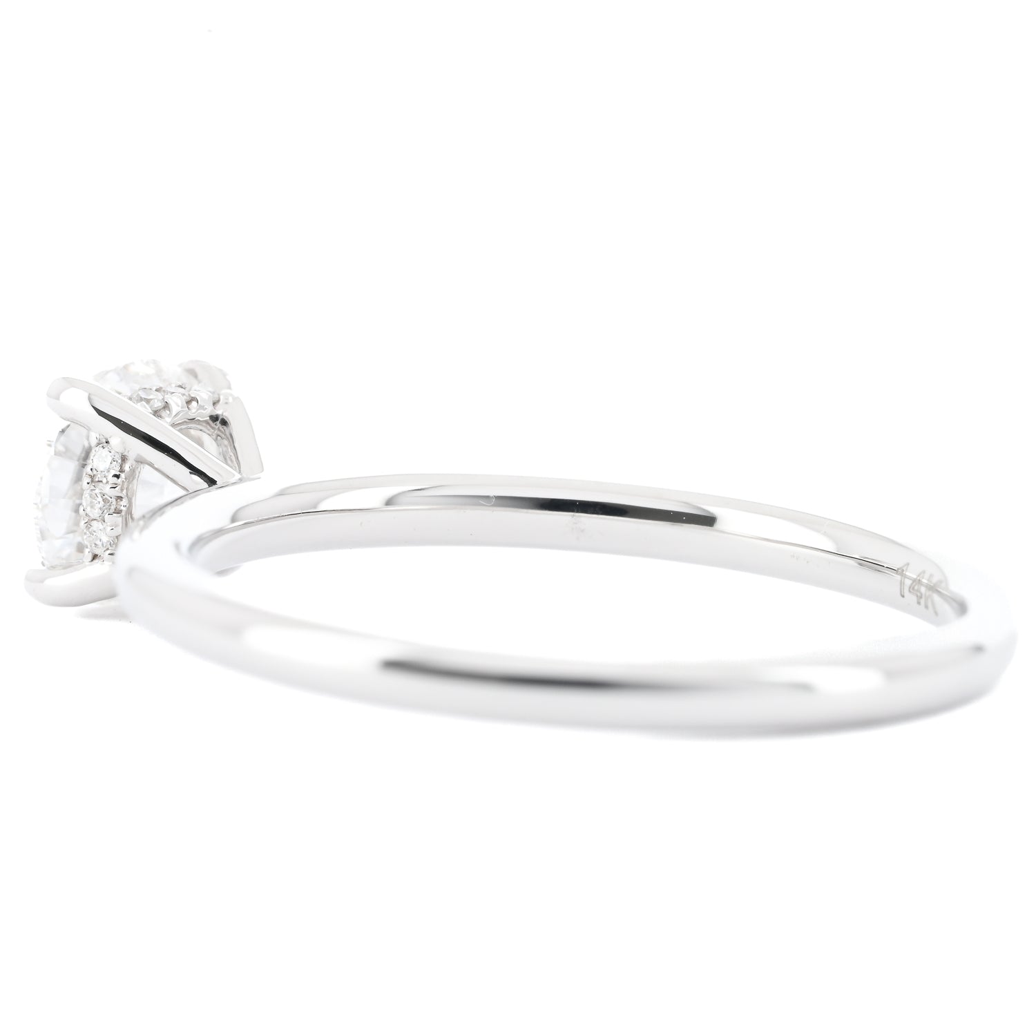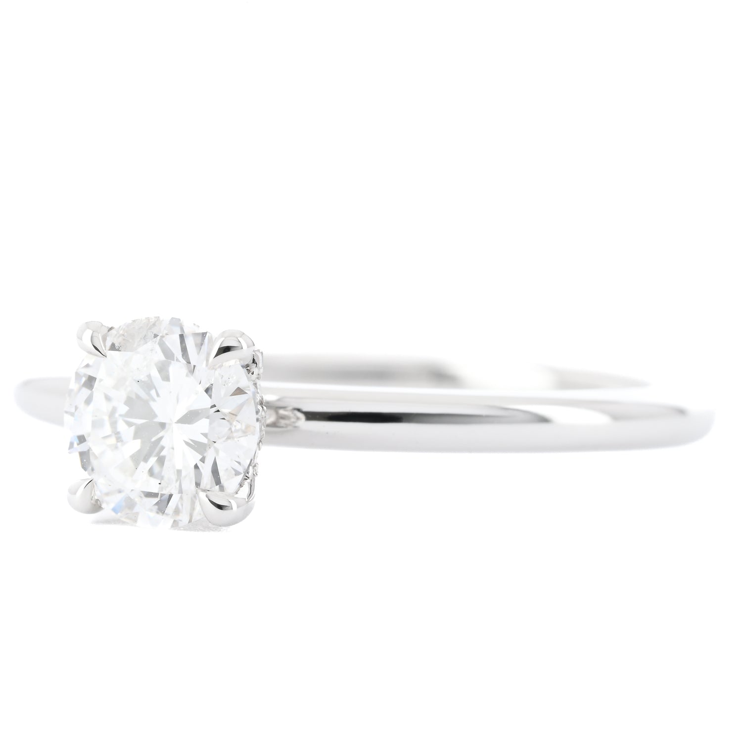 Presenting a .75ctw natural round diamond engagement ring. This solitaire piece features a hidden halo and is crafted with 14K white gold.