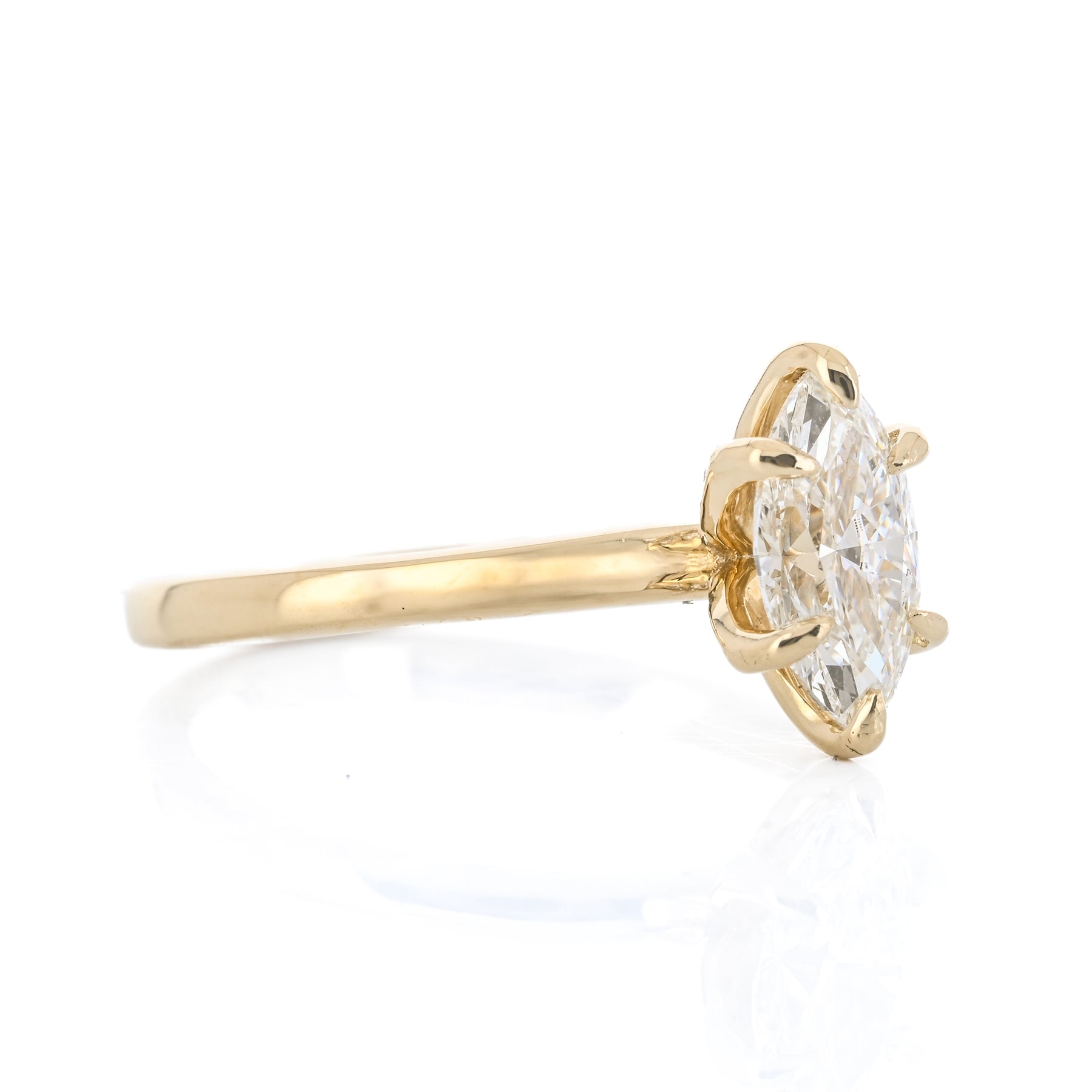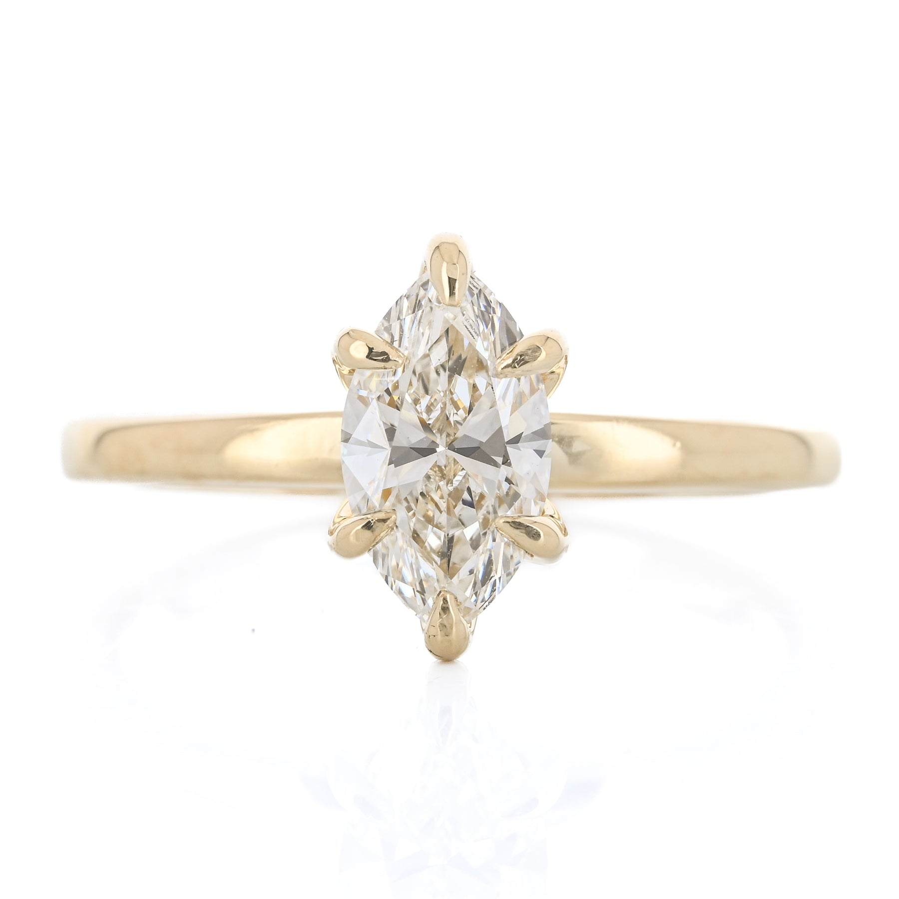 Introducing the 0.83ct Lab Grown Marquise Diamond Ring, featuring a stunning marquise-cut center stone accented with 0.07ct of diamonds in a 6-prong setting. Crafted in 14K yellow gold.