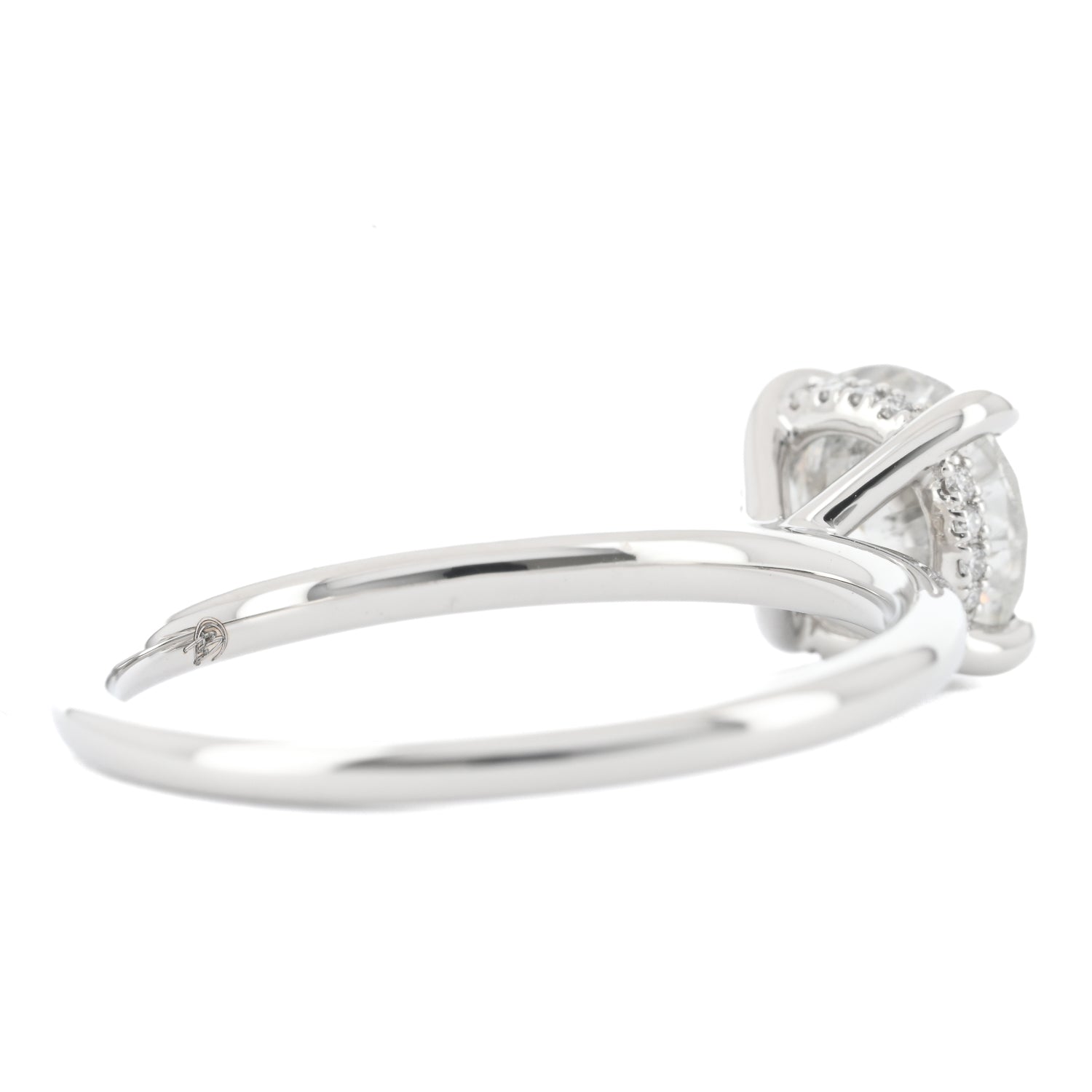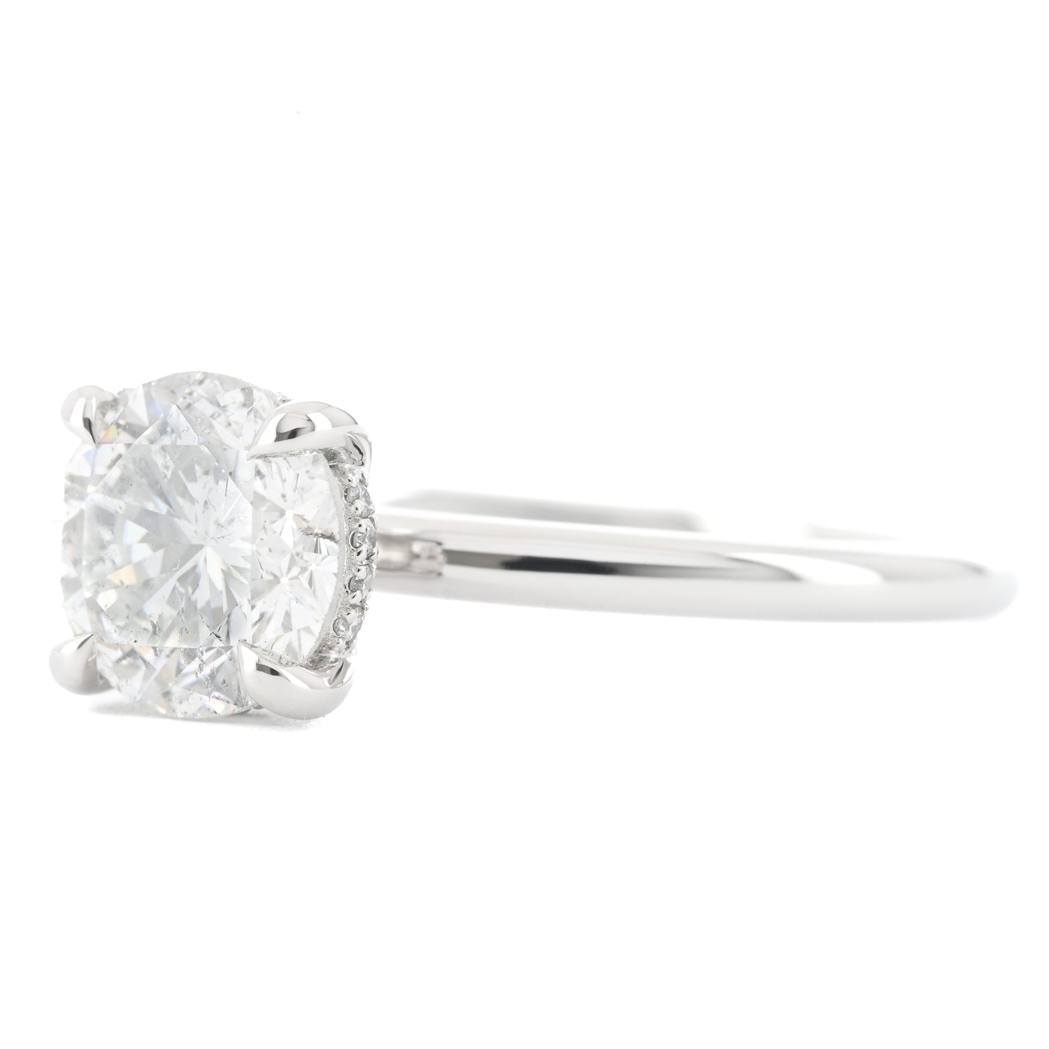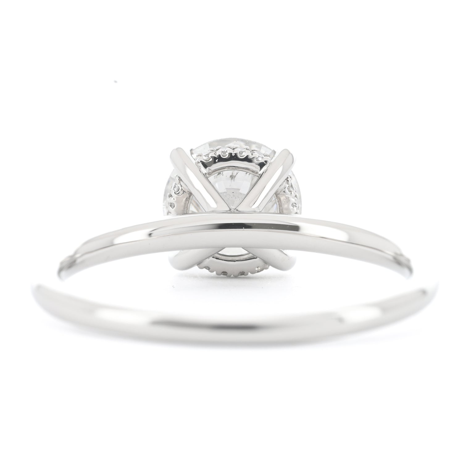 Presenting a 1.49ctw natural round diamond engagement ring. This solitaire piece features a hidden halo and is crafted with 950 Platinum.