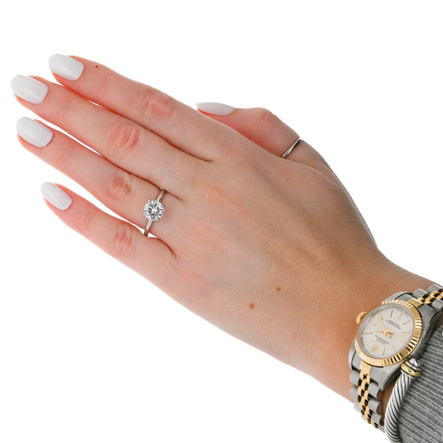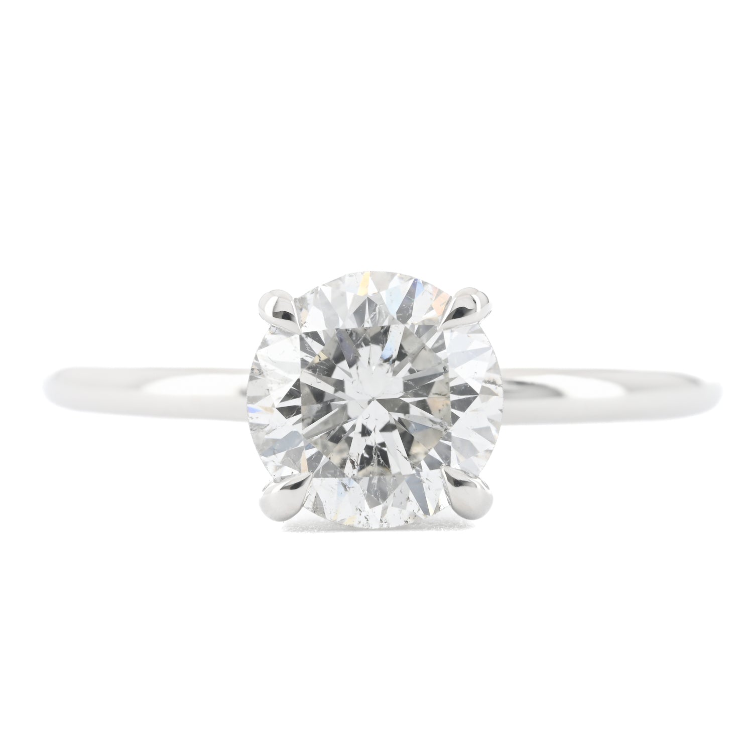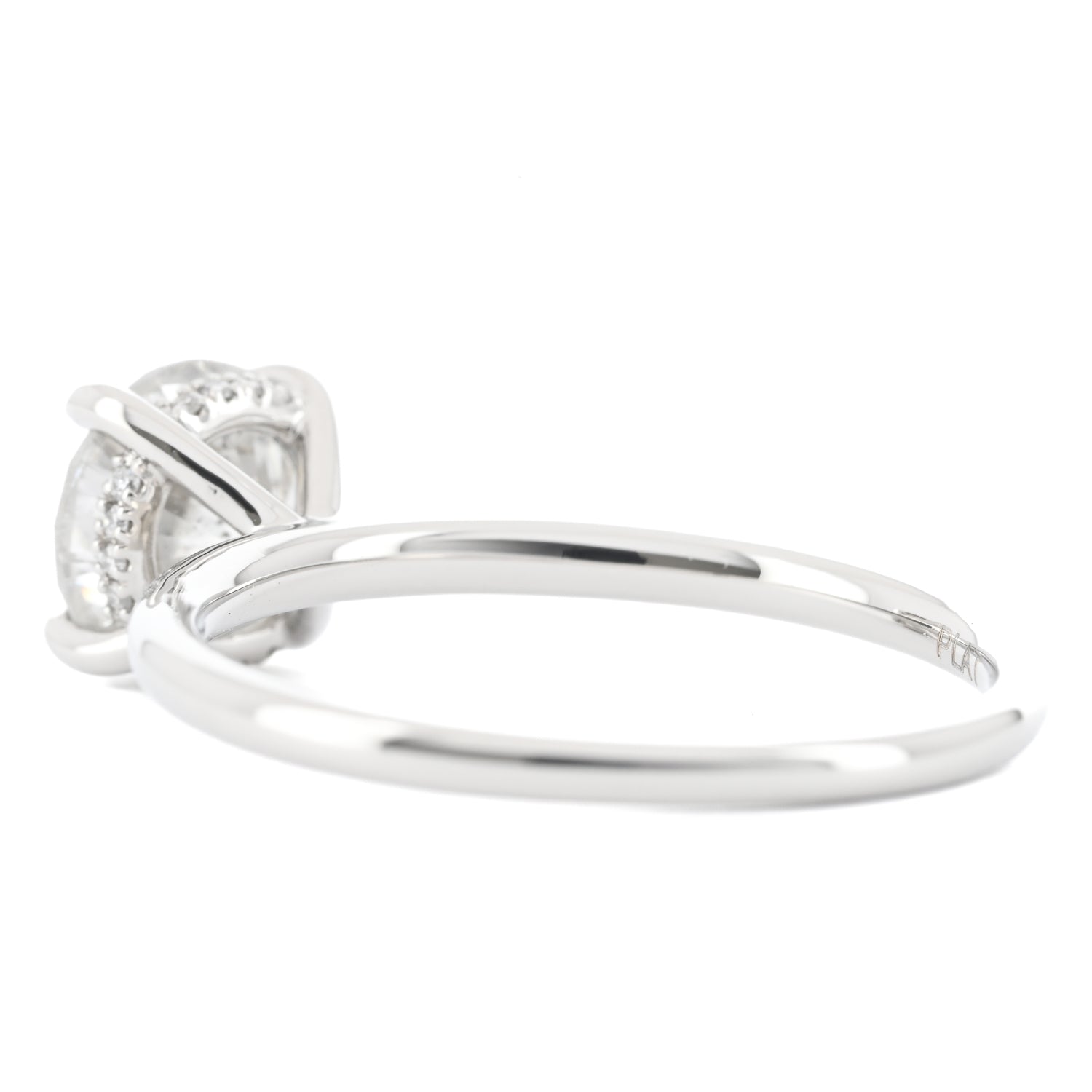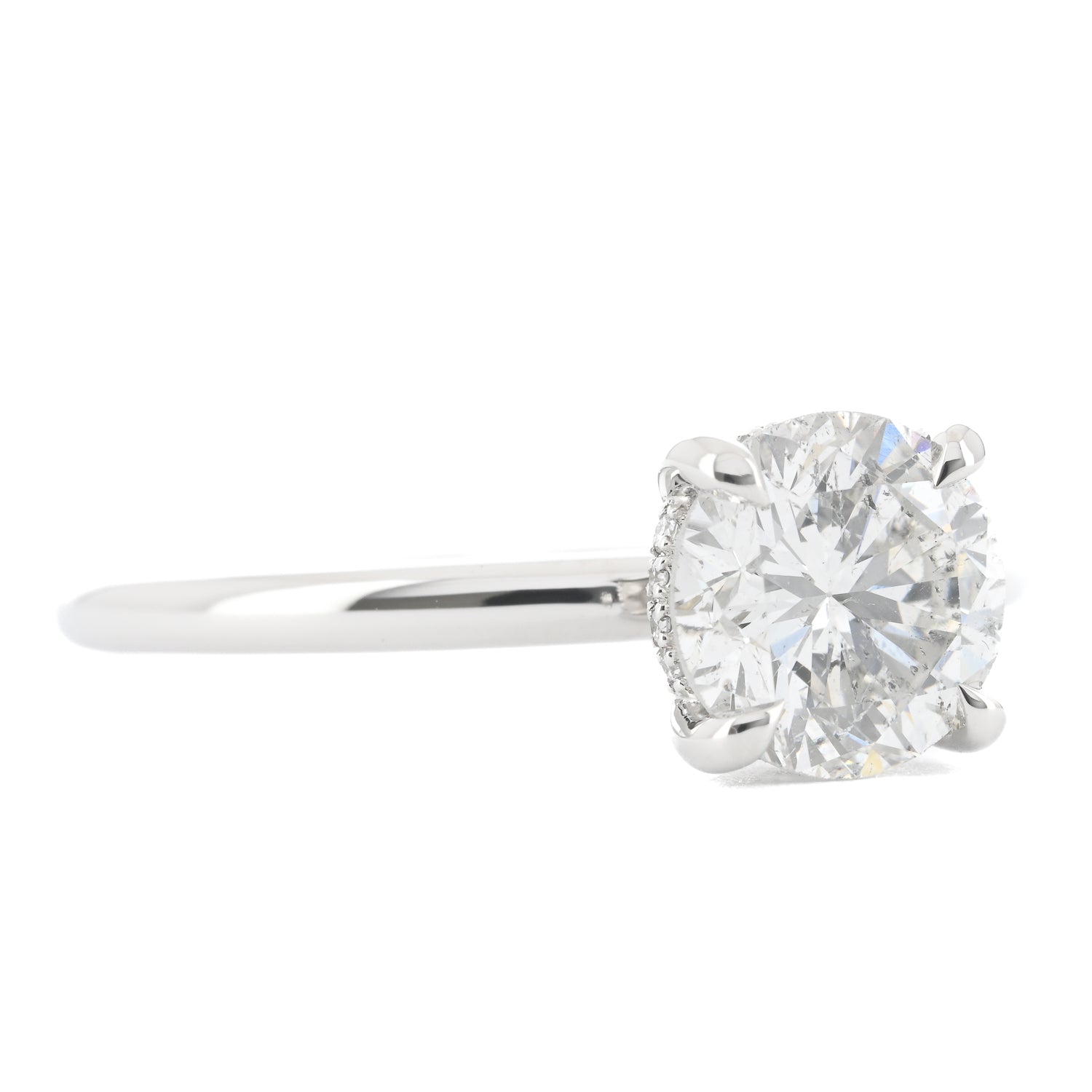 Presenting a 1.49ctw natural round diamond engagement ring. This solitaire piece features a hidden halo and is crafted with 950 Platinum.