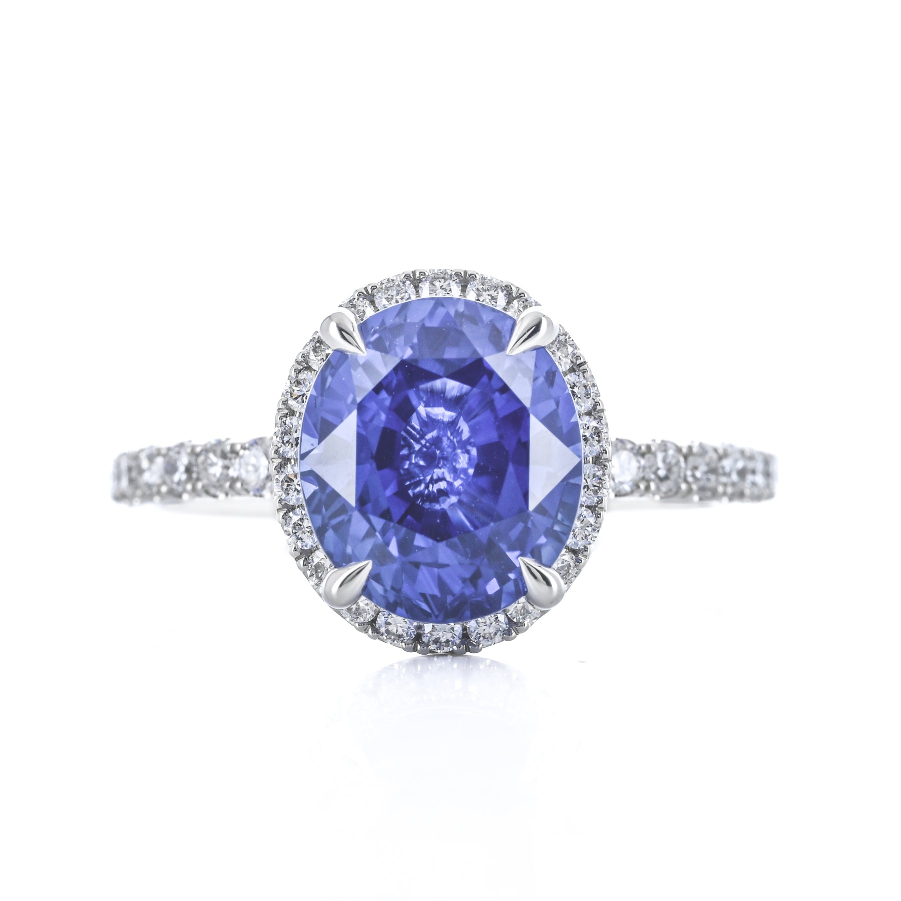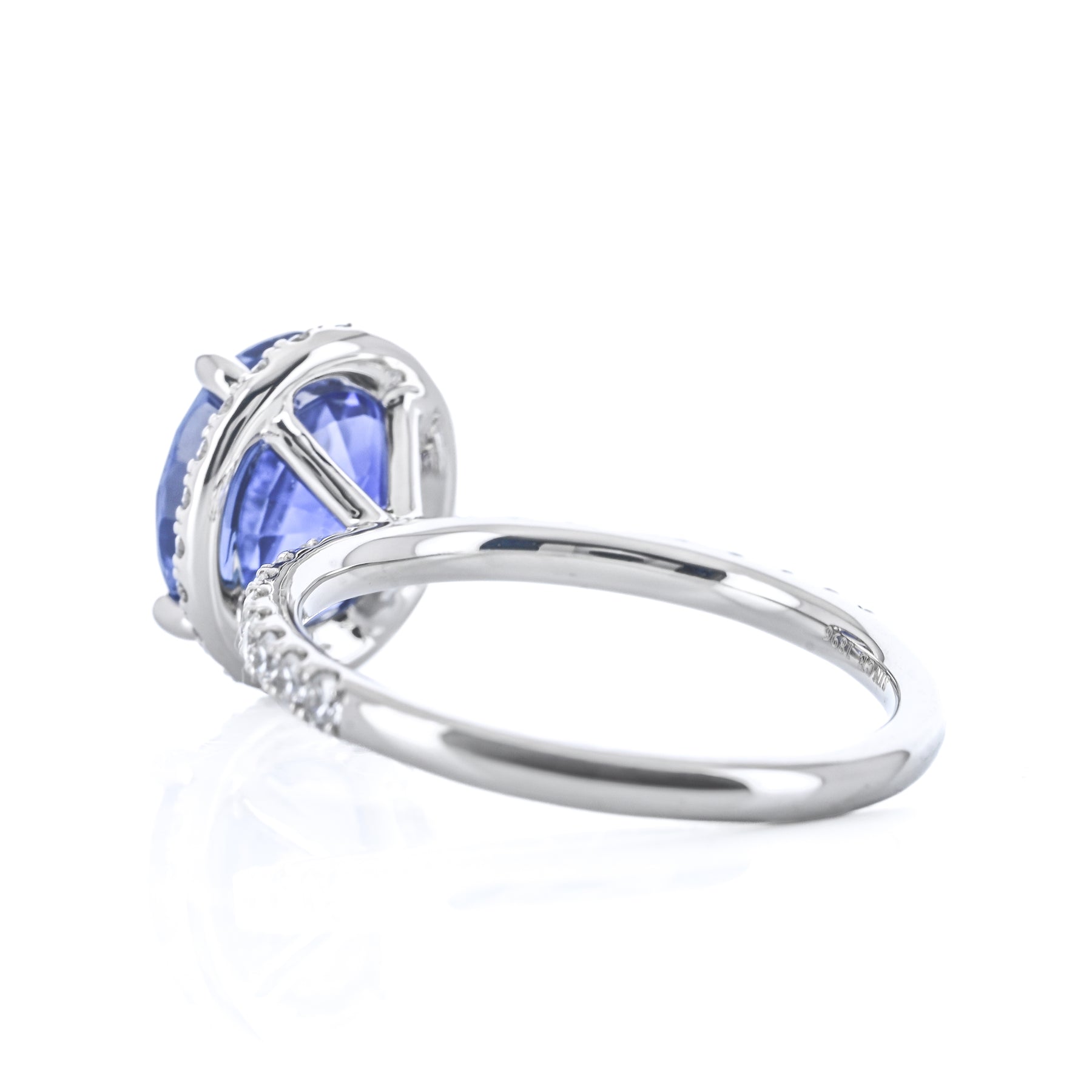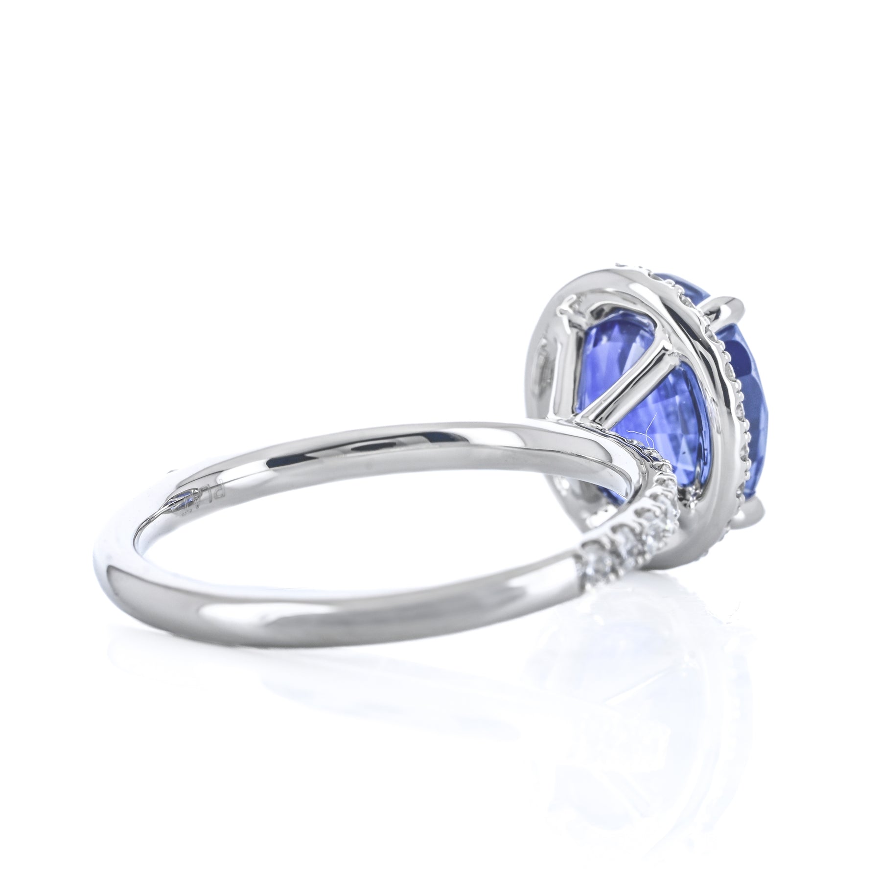 Introducing the 4.14ct Blue Sapphire Diamond Halo Ring, featuring a stunning Sri Lanka–sourced oval blue sapphire center accented by .49ct total weight round brilliant diamonds in a halo setting. Expertly crafted in platinum for timeless elegance.