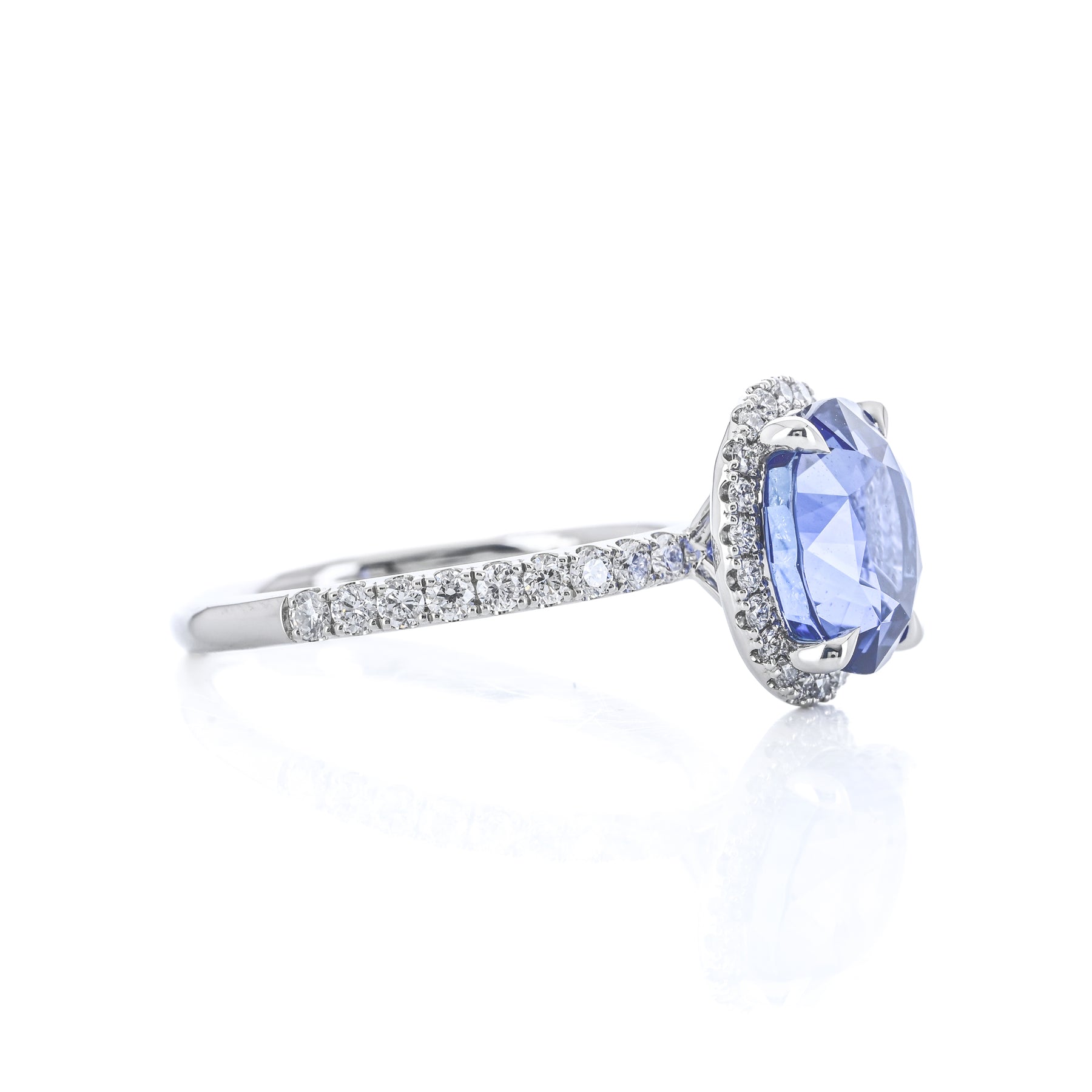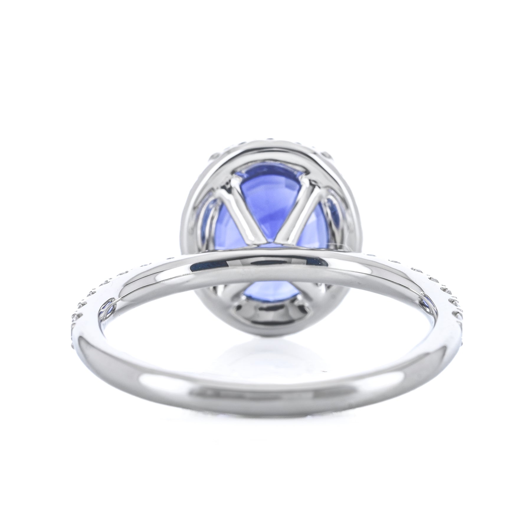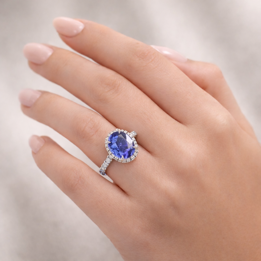 Introducing the 4.14ct Blue Sapphire Diamond Halo Ring, featuring a stunning Sri Lanka–sourced oval blue sapphire center accented by .49ct total weight round brilliant diamonds in a halo setting. Expertly crafted in platinum for timeless elegance.