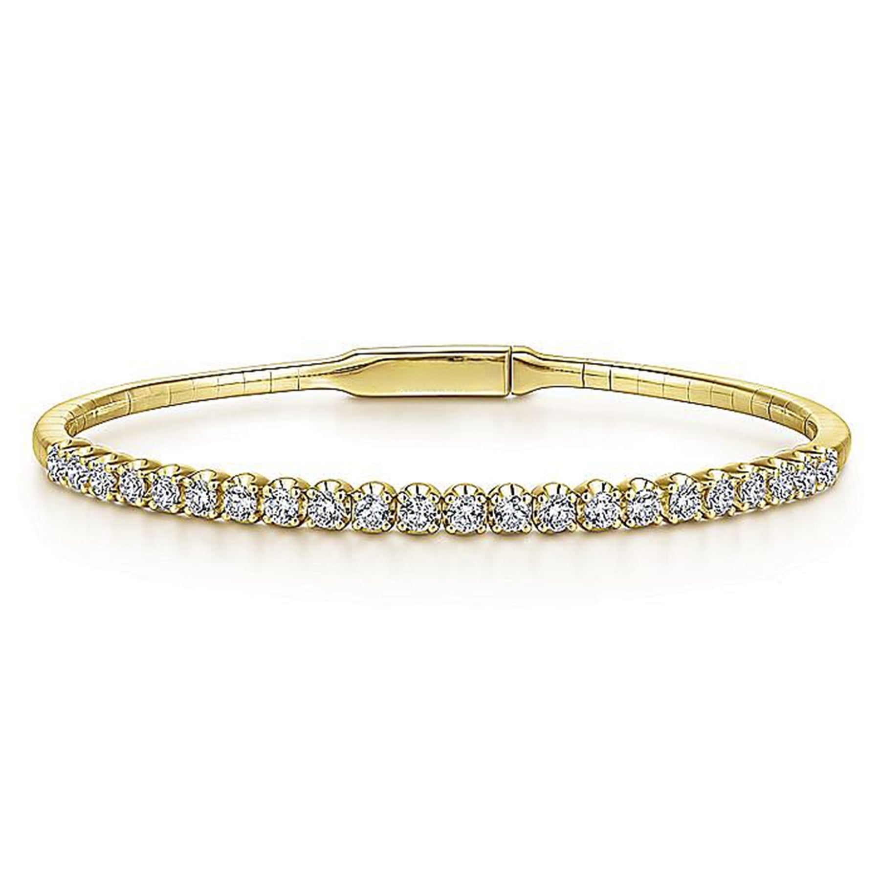Introducing the 0.94ctw Round Diamond Bangle in Yellow Gold. The featured diamonds are in J color and SI2 clarity.