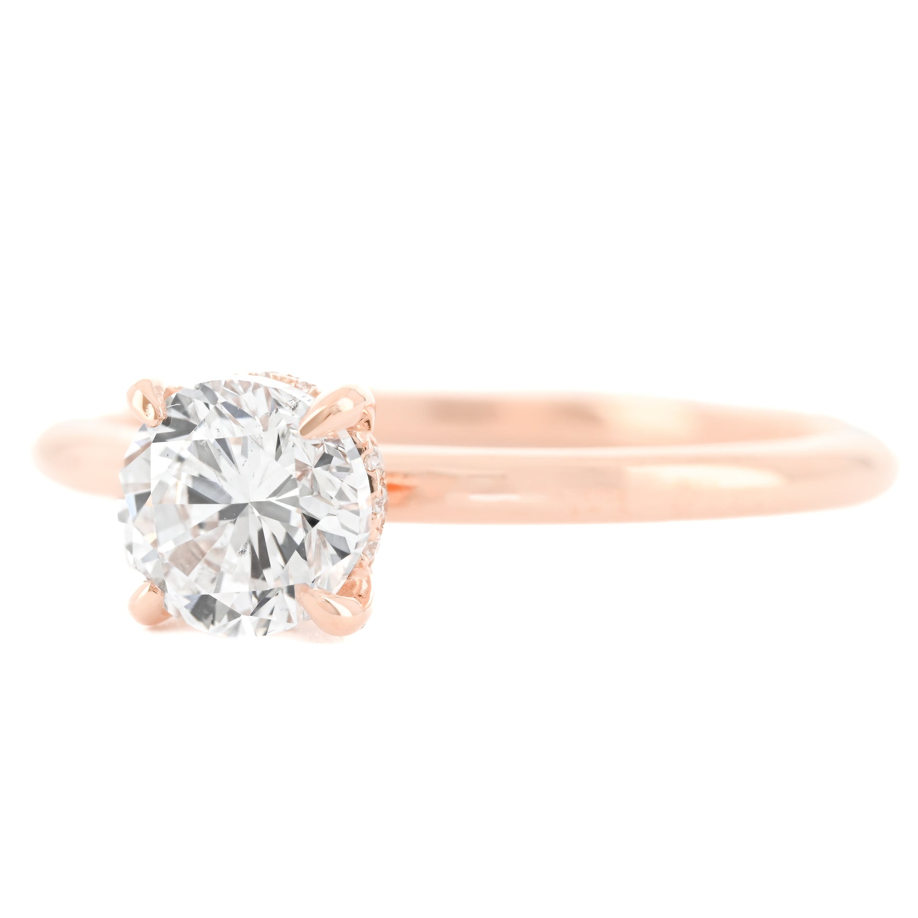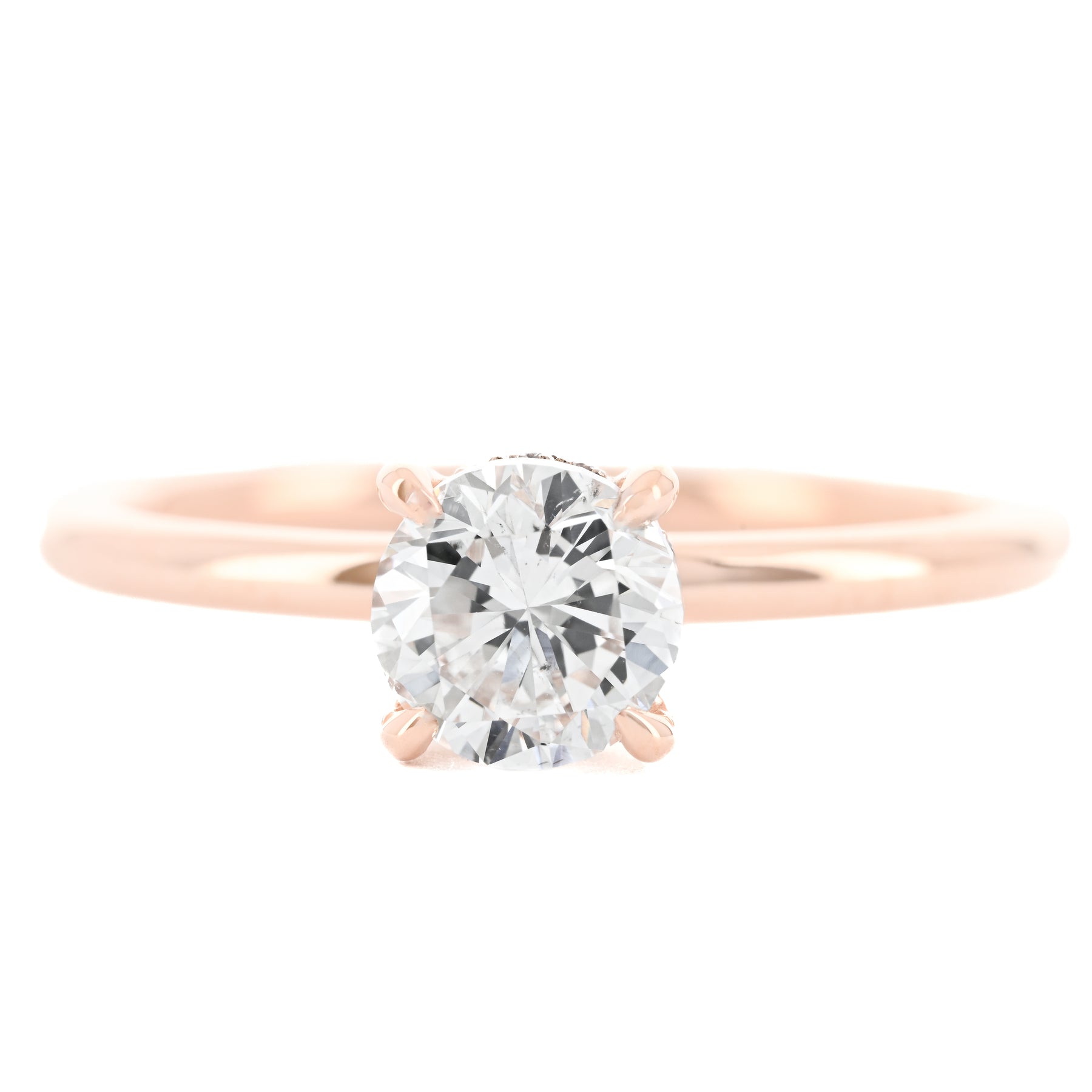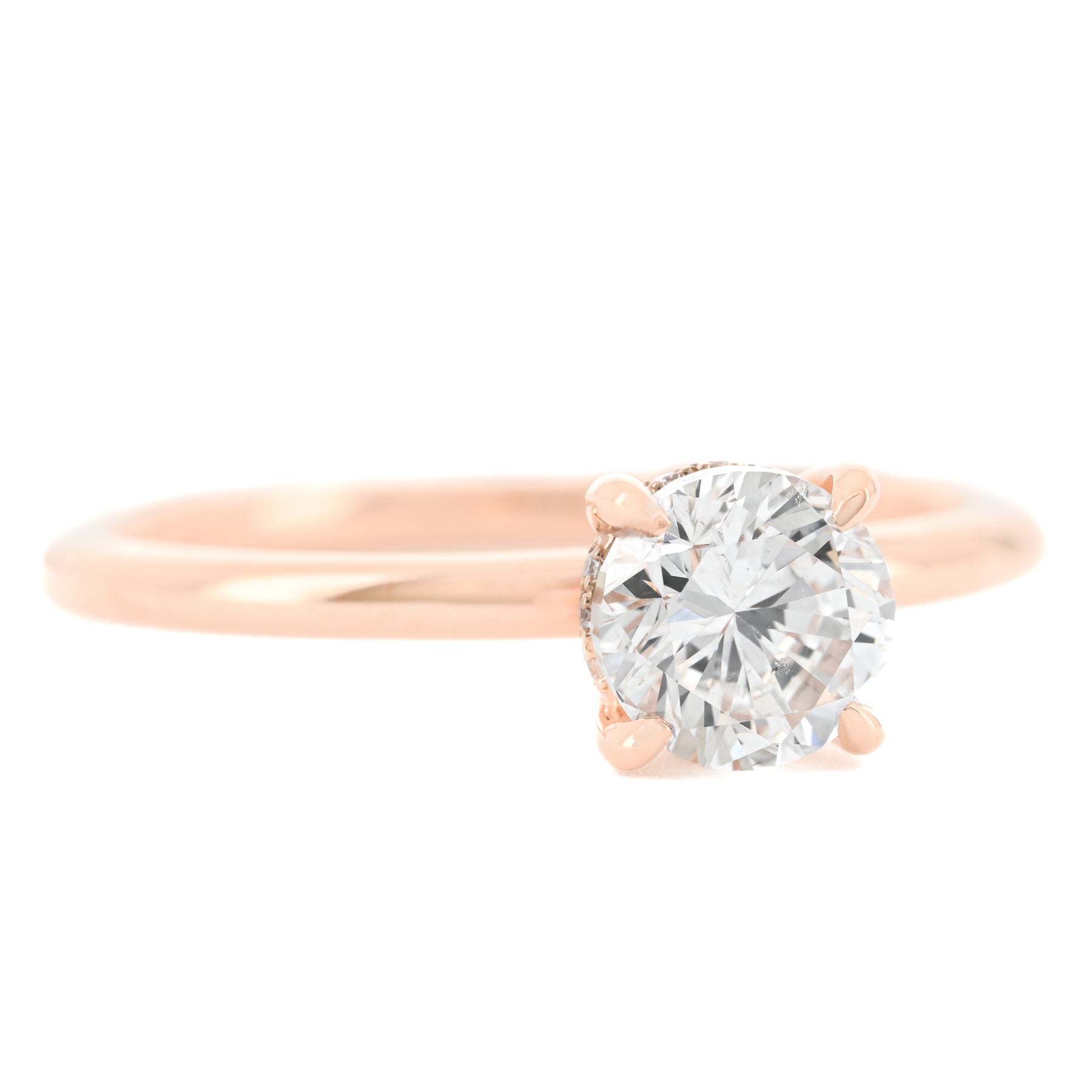 Presenting a 0.98CTW Round natural diamond engagement ring. This Buchroeders Jewelers engagement ring is set in a 14k Rose Gold Solitaire custom mounting featuring a hidden halo.