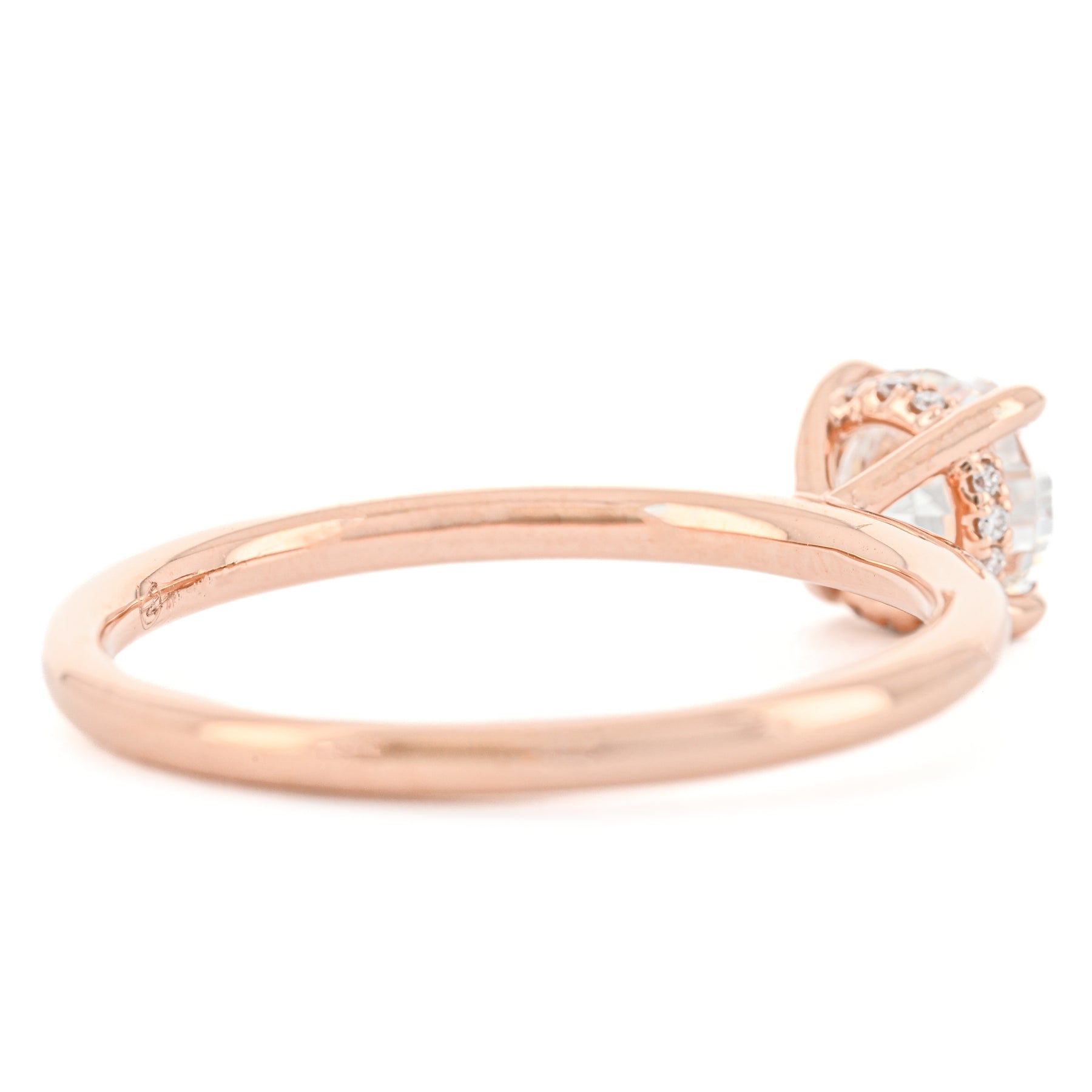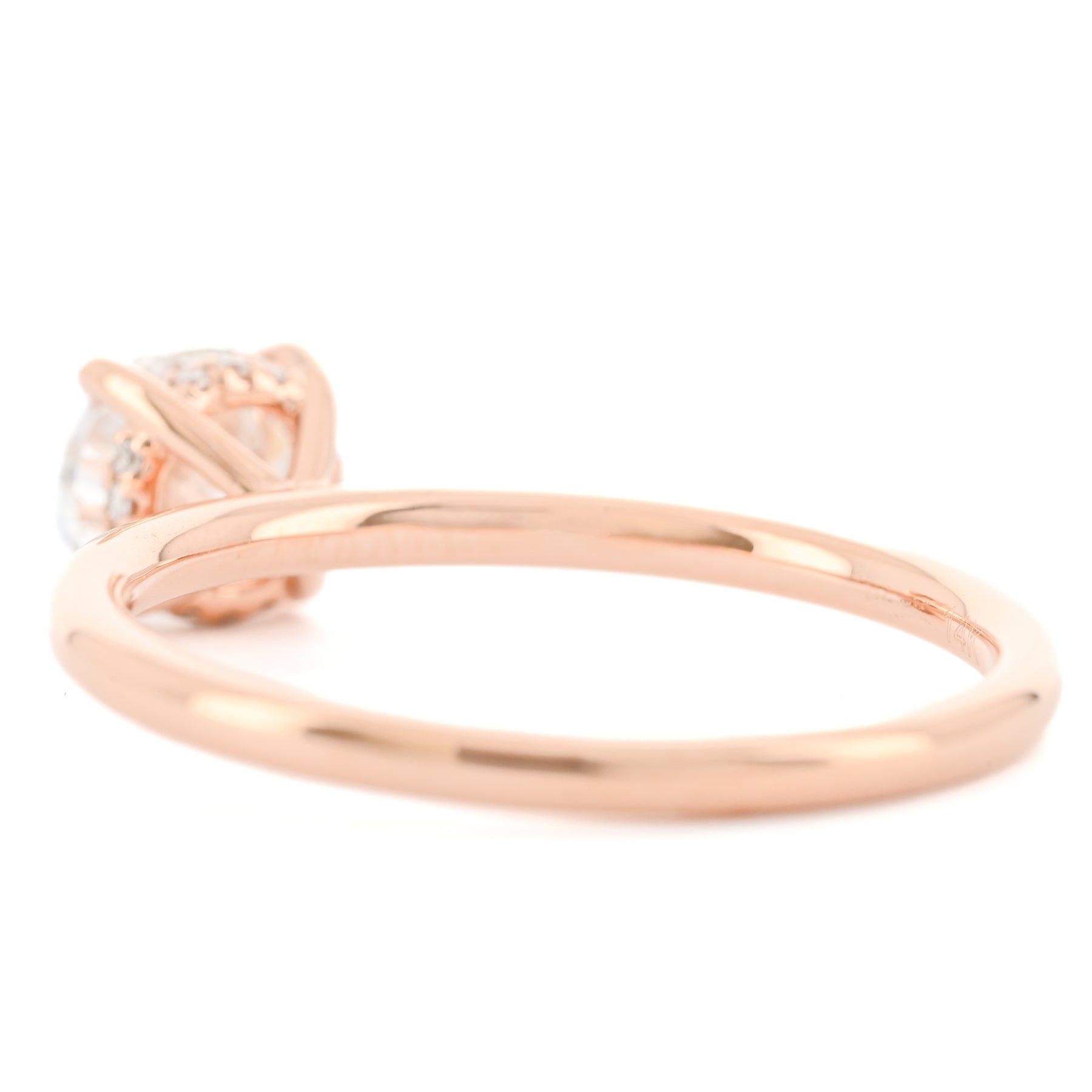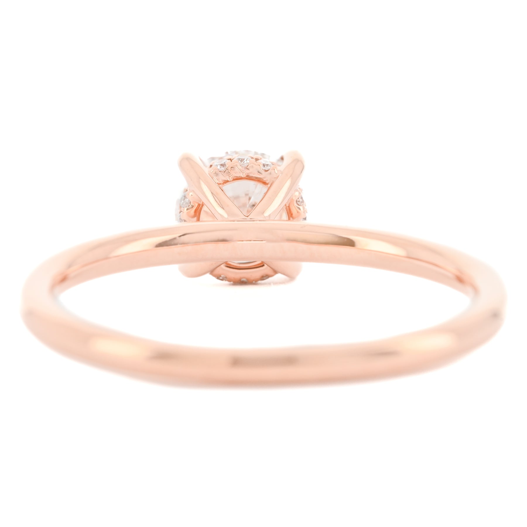 Presenting a 0.98CTW Round natural diamond engagement ring. This Buchroeders Jewelers engagement ring is set in a 14k Rose Gold Solitaire custom mounting featuring a hidden halo.