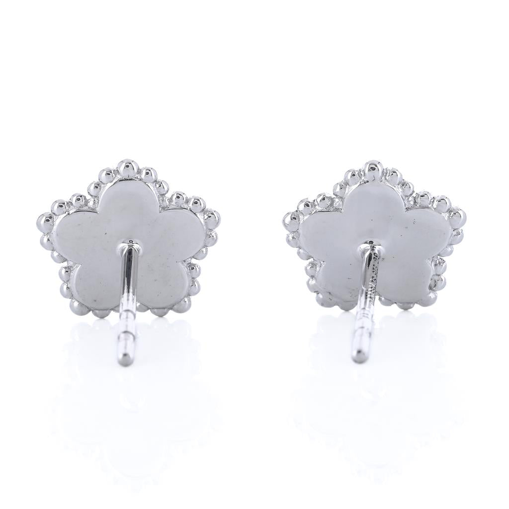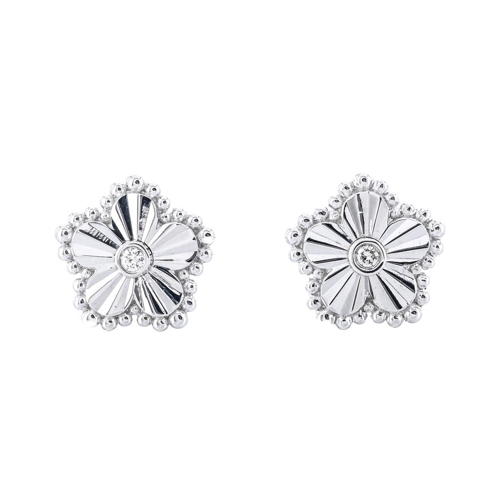 These sterling silver Bujukan flower frame stud earrings feature diamonds totaling 0.03 carats, secured with butterfly backs.
