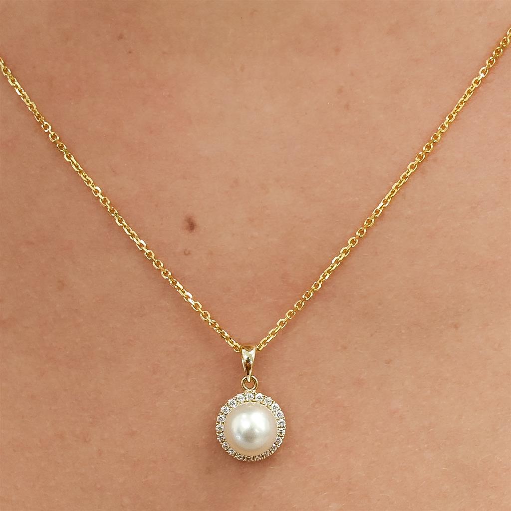 This 14K yellow gold pendant features a 6.5mm cultured freshwater pearl accented by a diamond halo totaling 0.08 carats. Chain not included.