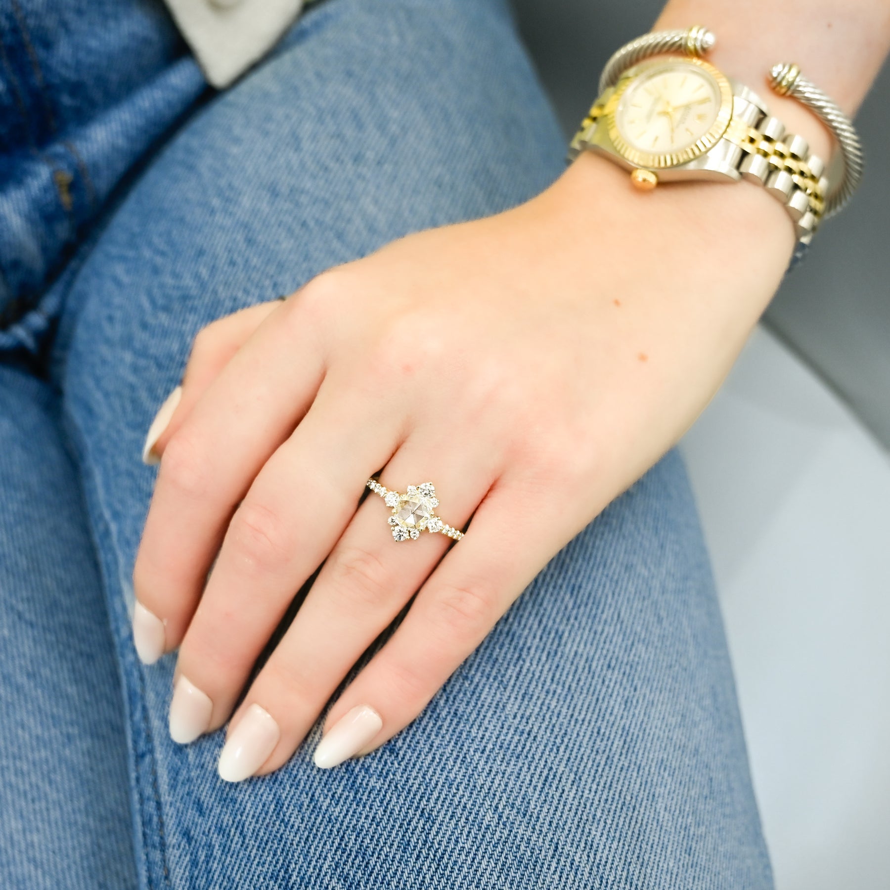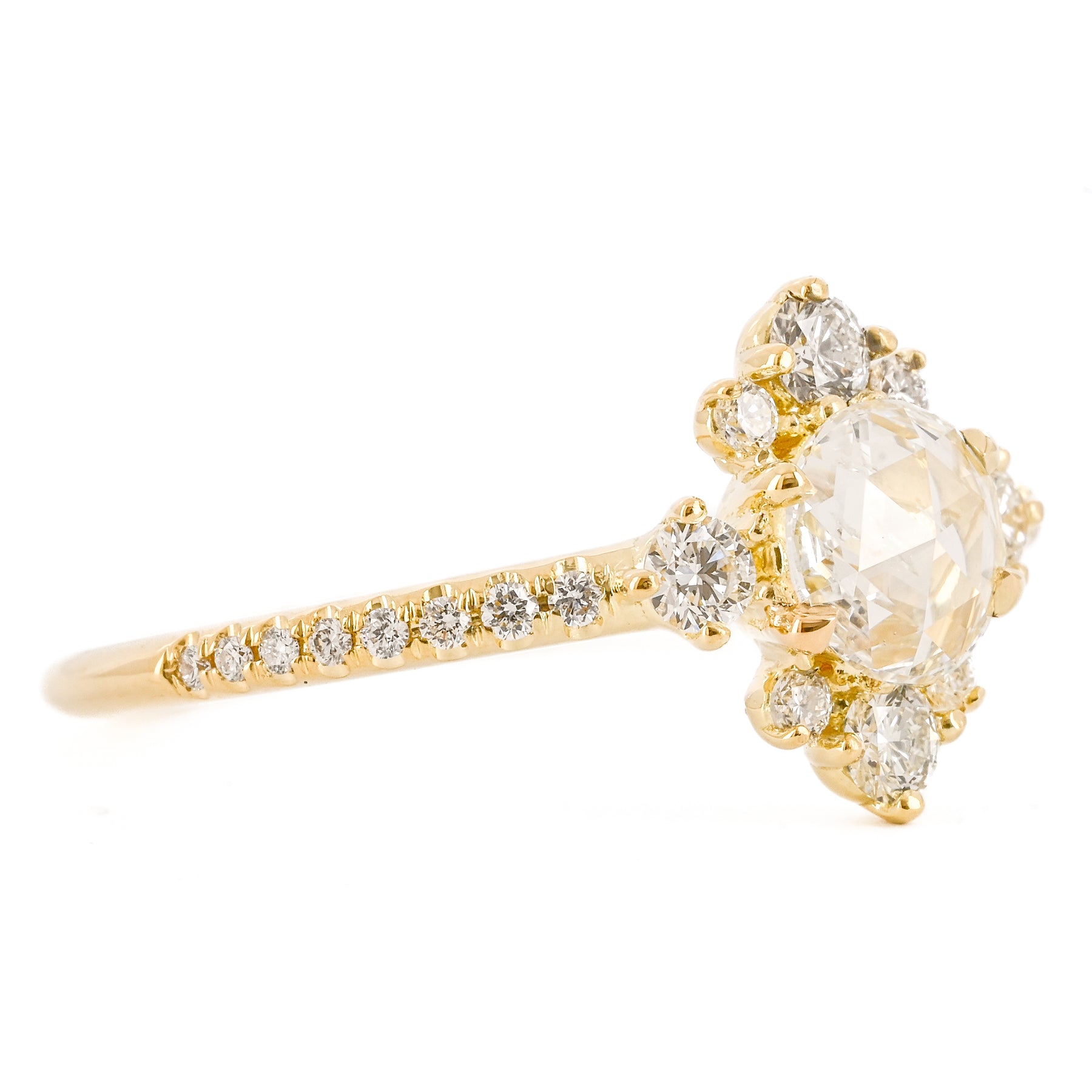 Introducing the 1.02ctw Rose Cut Diamond Engagement Ring, featuring a rose cut center diamond. Crafted in 18K yellow gold.