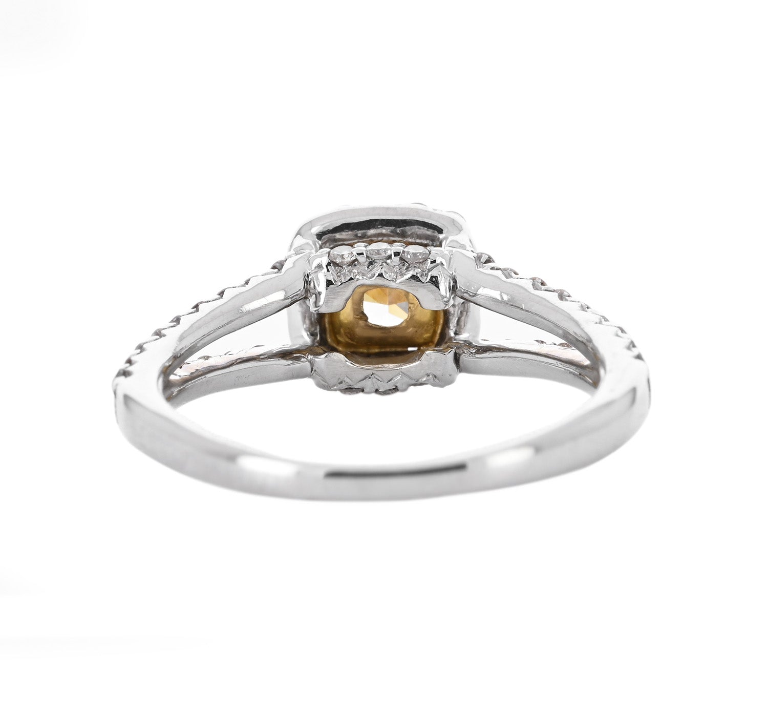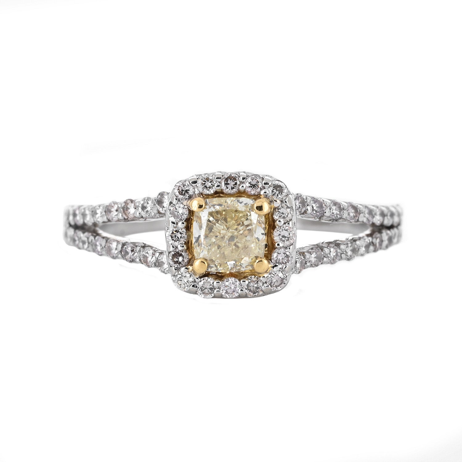 Introducing the 1.13ctw cushion natural diamond engagement ring in white gold. This ring showcases a stunning 0.58ct canary-colored natural diamond at its center with a SI1 clarity. The diamond is surrounded by a square halo and set upon a split pavê shank, creating a unique design.