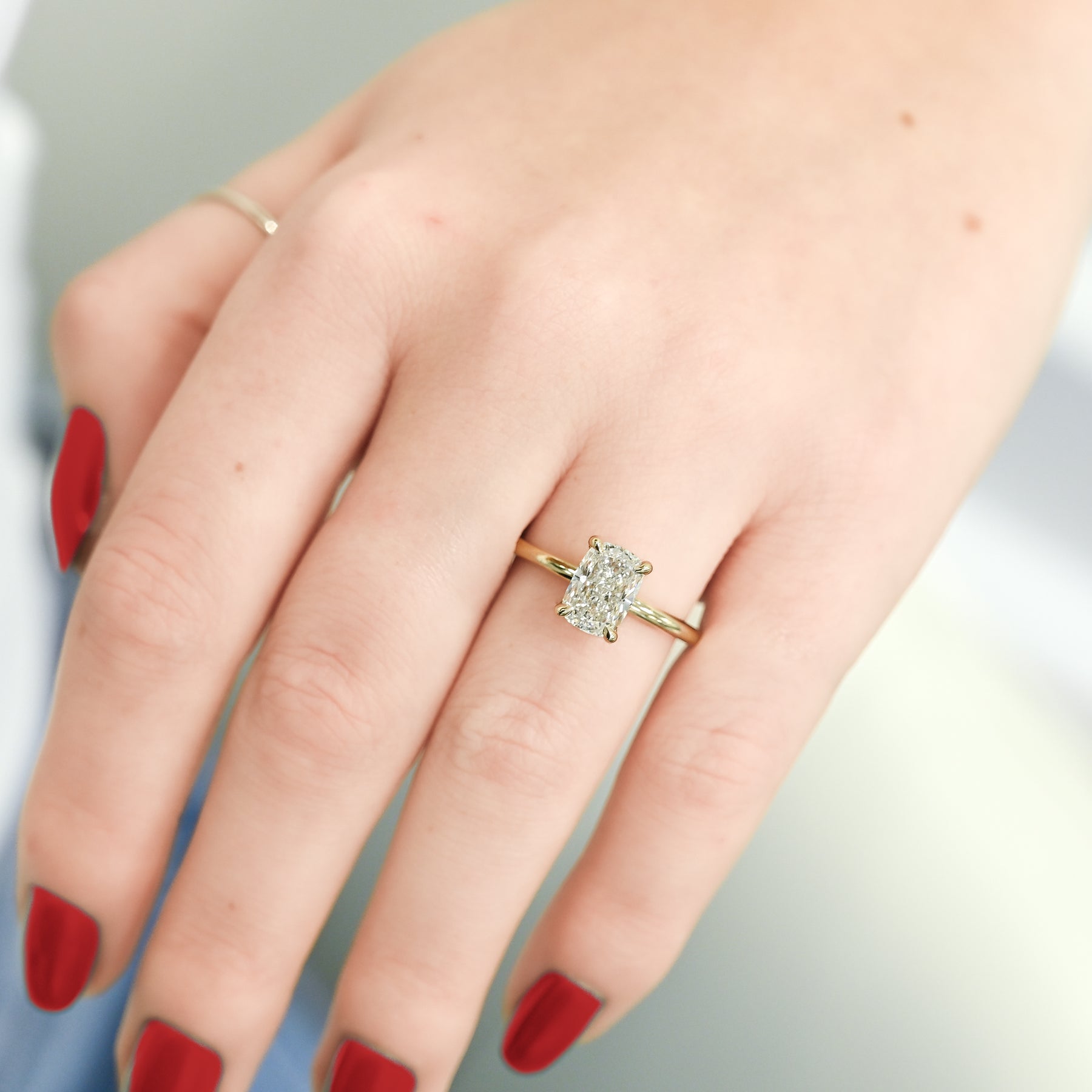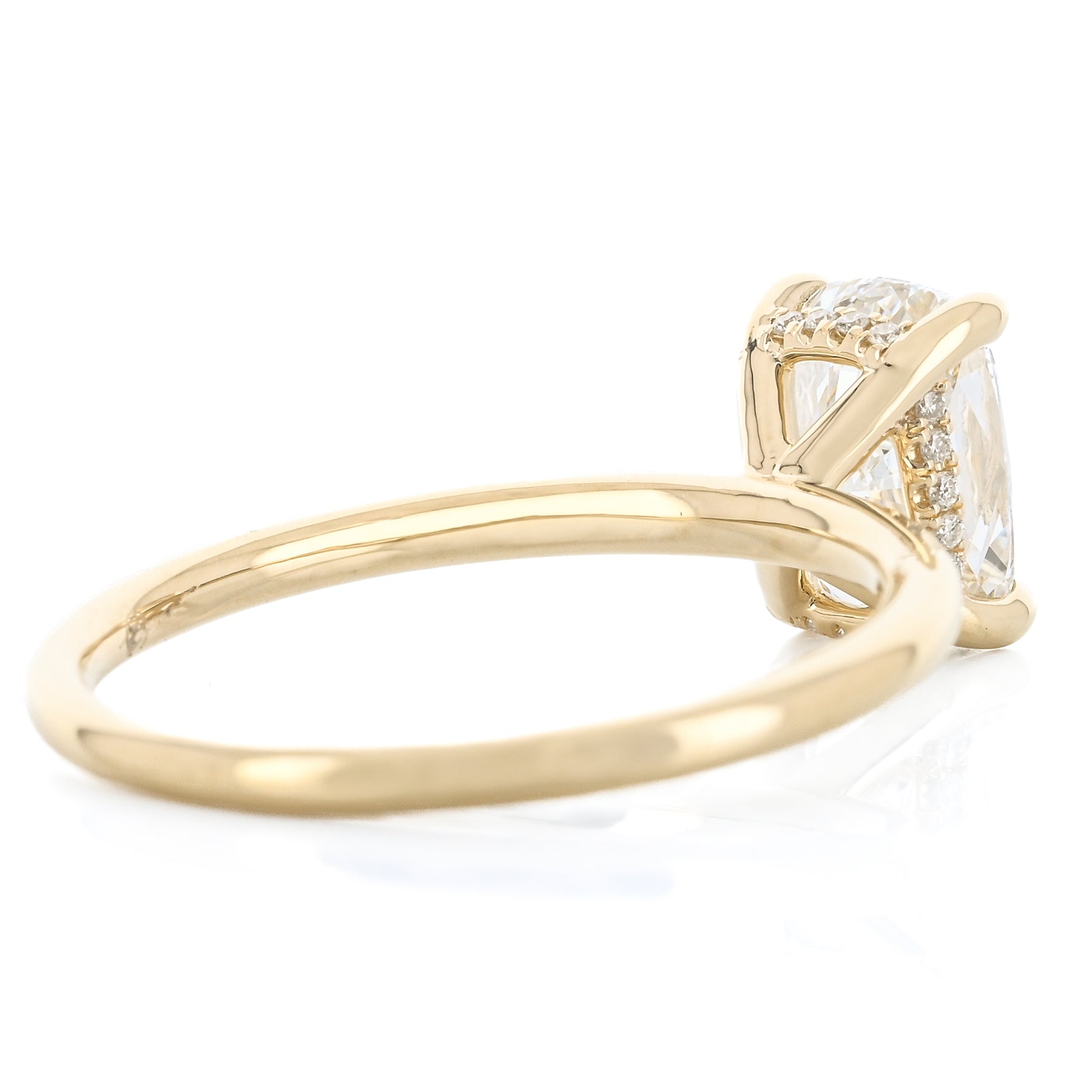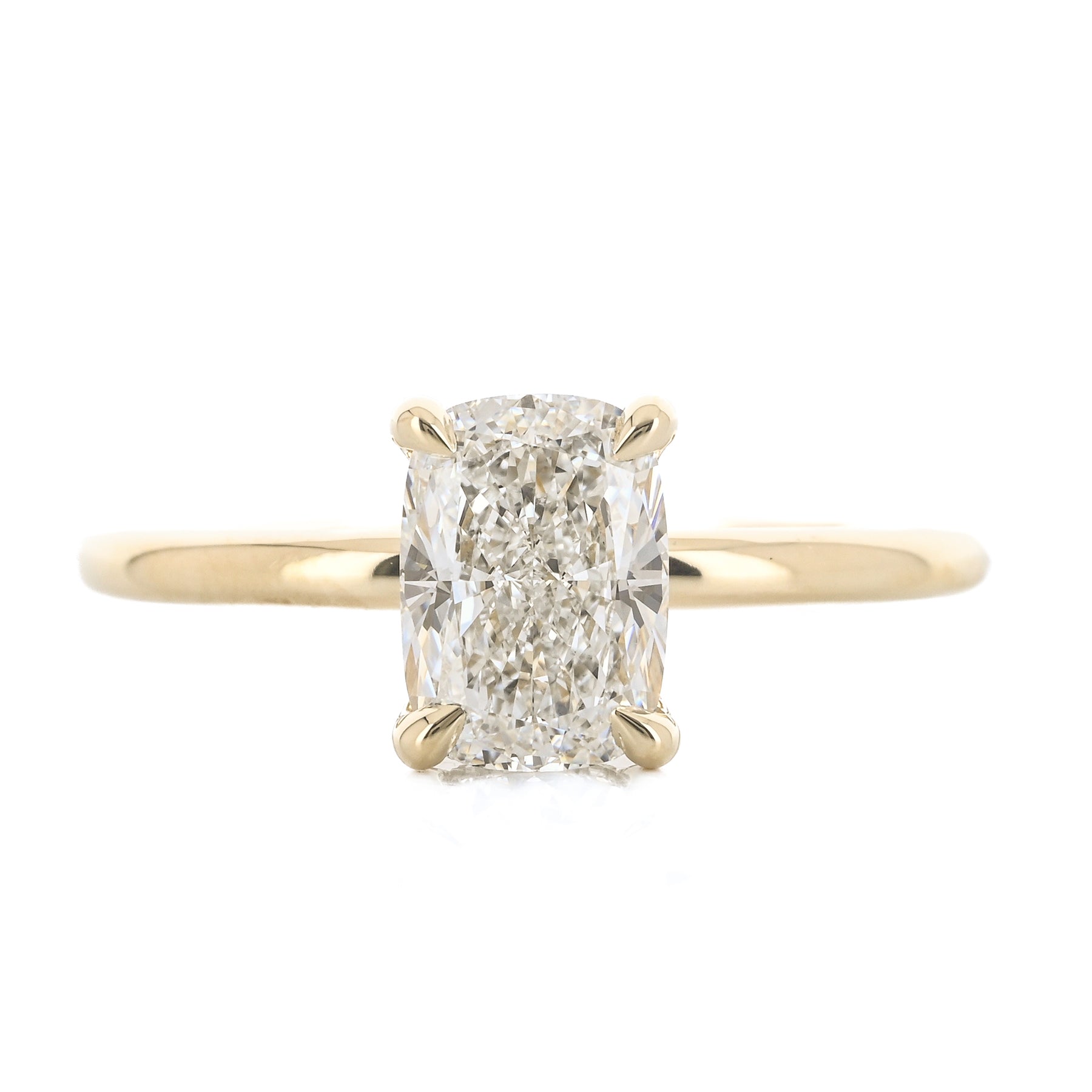 Introducing the 1.58ctw Lab Grown Cushion Cut Diamond Hidden Halo Ring, featuring a brilliant 1.53ct cushion-cut center diamond set within a refined hidden halo design. Expertly crafted in 14K yellow gold for timeless elegance.