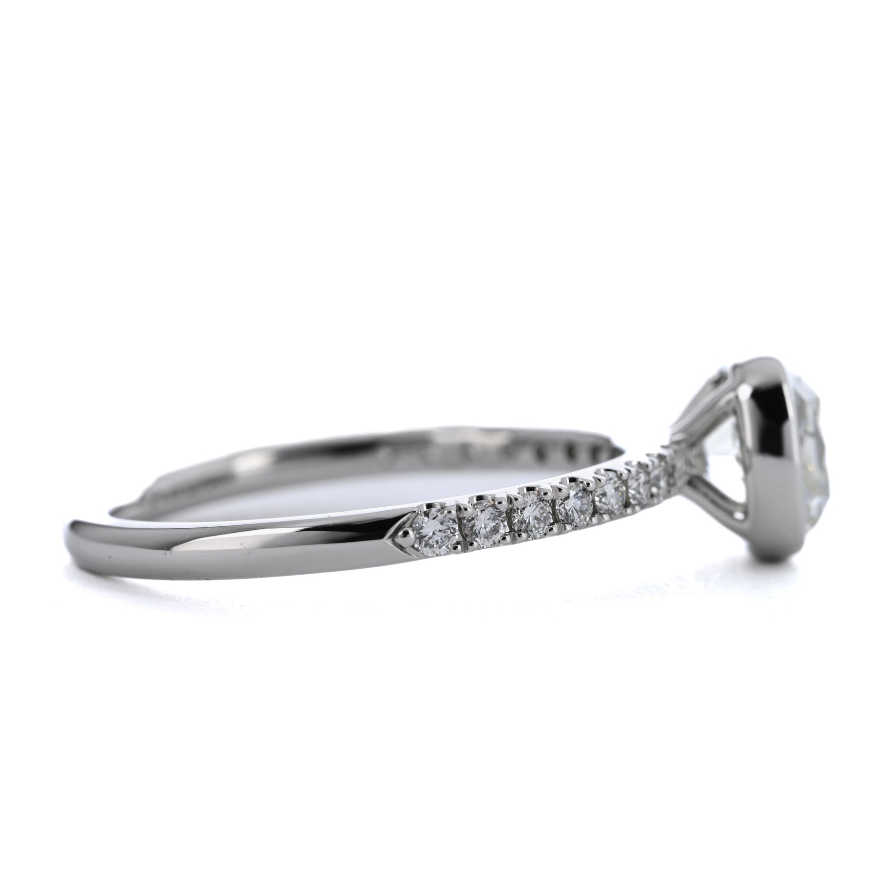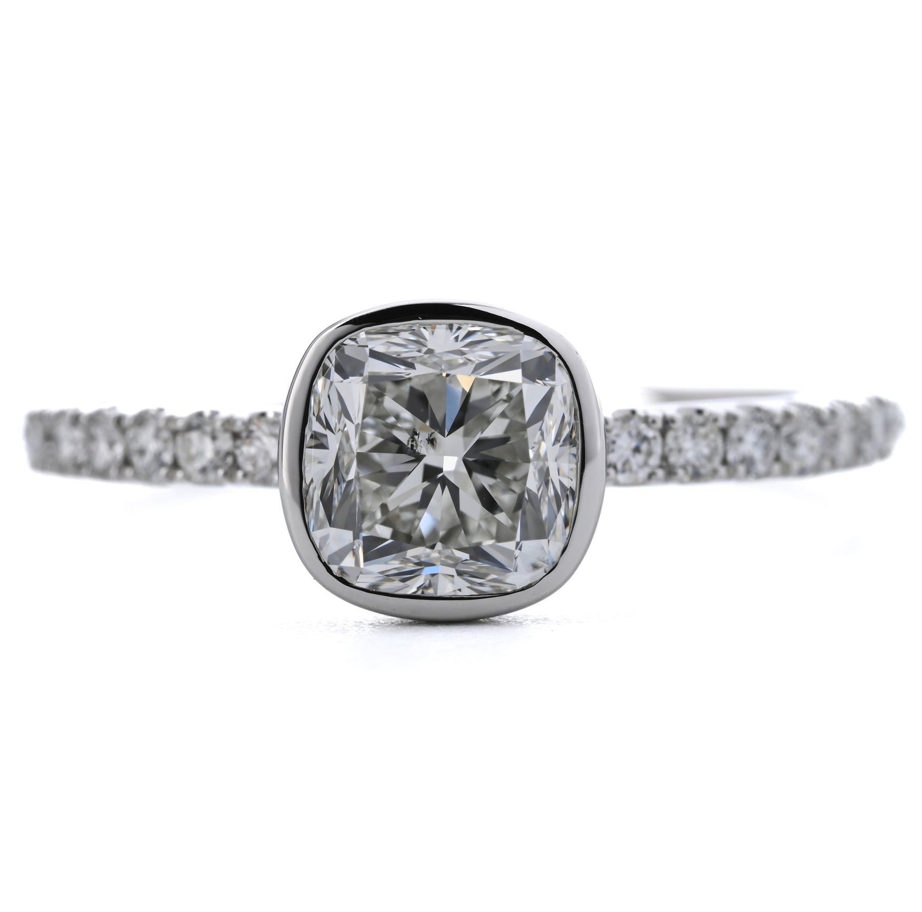 Introducing our 1.81ctw cushion diamond bezel engagement ring crafted in 950 platinum. This ring features a 1.51ct cushion-cut natural diamond with H color and SI2 clarity, securely set in a bezel setting. The diamond pavé band adds an extra touch of diamonds to this natural diamond proposal-ready diamond engagement ring.