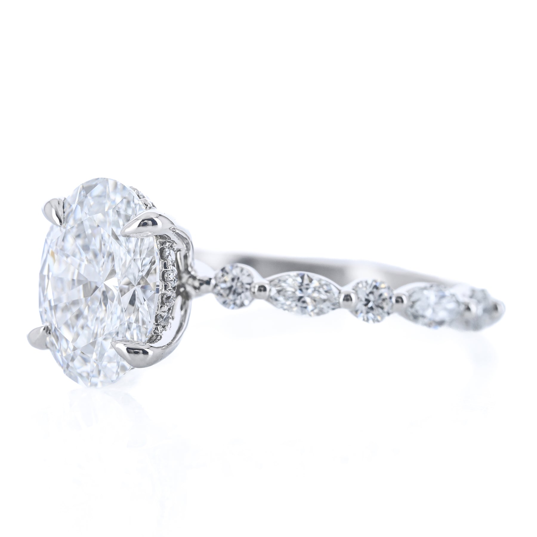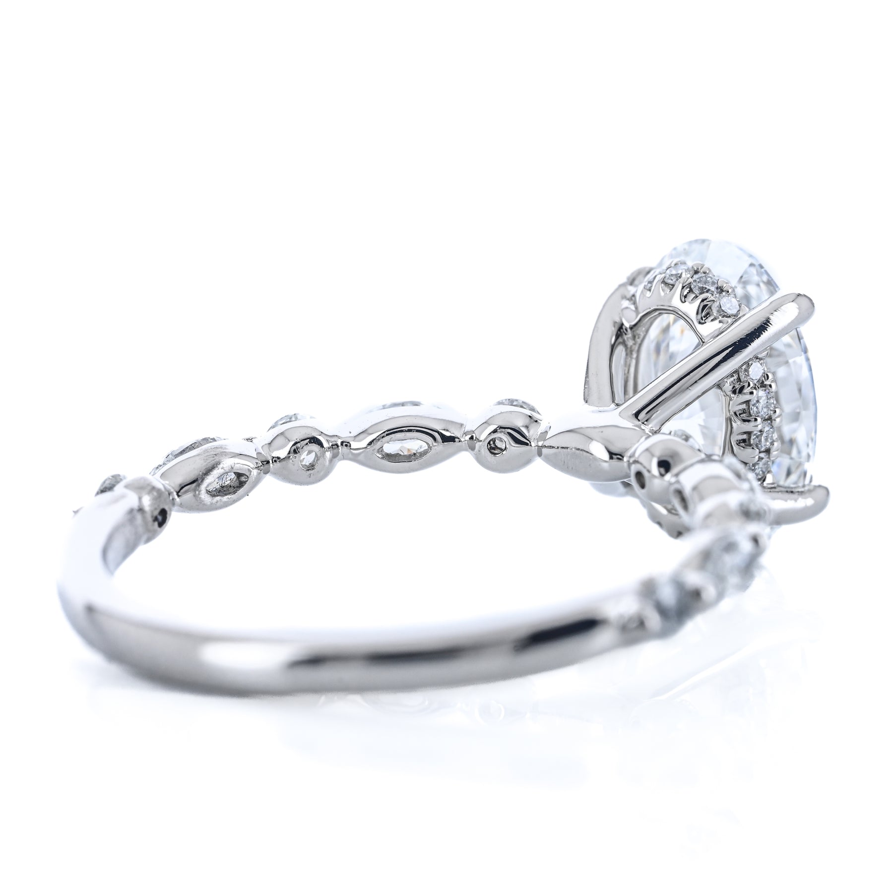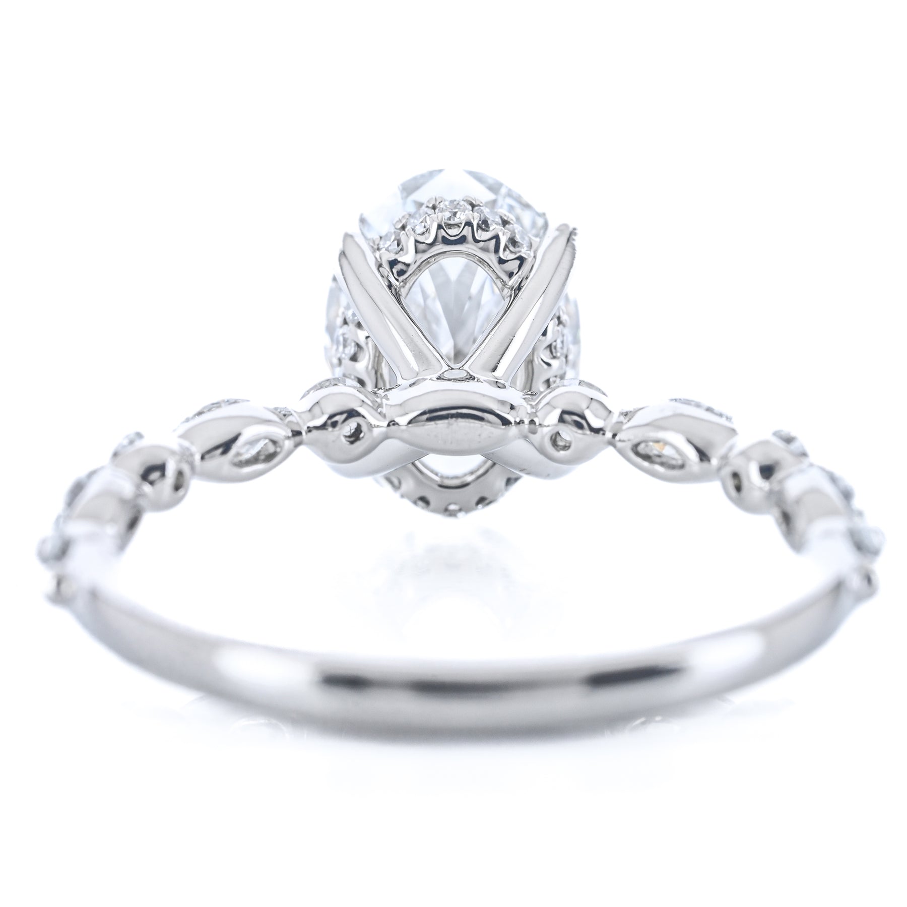 Introducing the 1.85ct Lab Grown Oval Diamond Ring, featuring a stunning hidden halo design with round and marquise diamond accents. Expertly crafted in platinum for a luxurious and timeless finish.