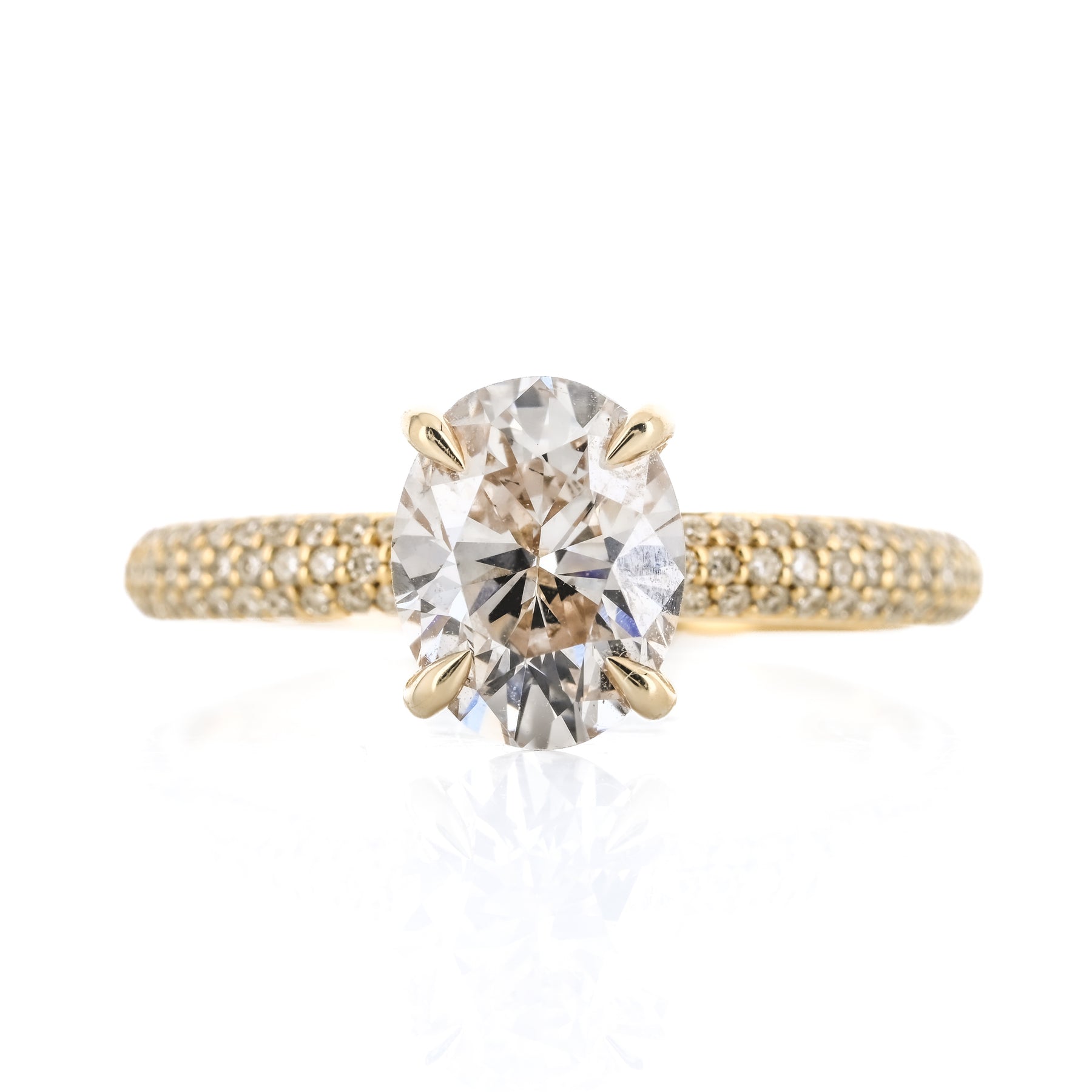 Introducing the 1.98ctw Oval Diamond Pavé Ring, featuring a warm-toned oval center diamond accented by a shimmering pavé setting, all crafted in 14K yellow gold for a classic yet radiant look.