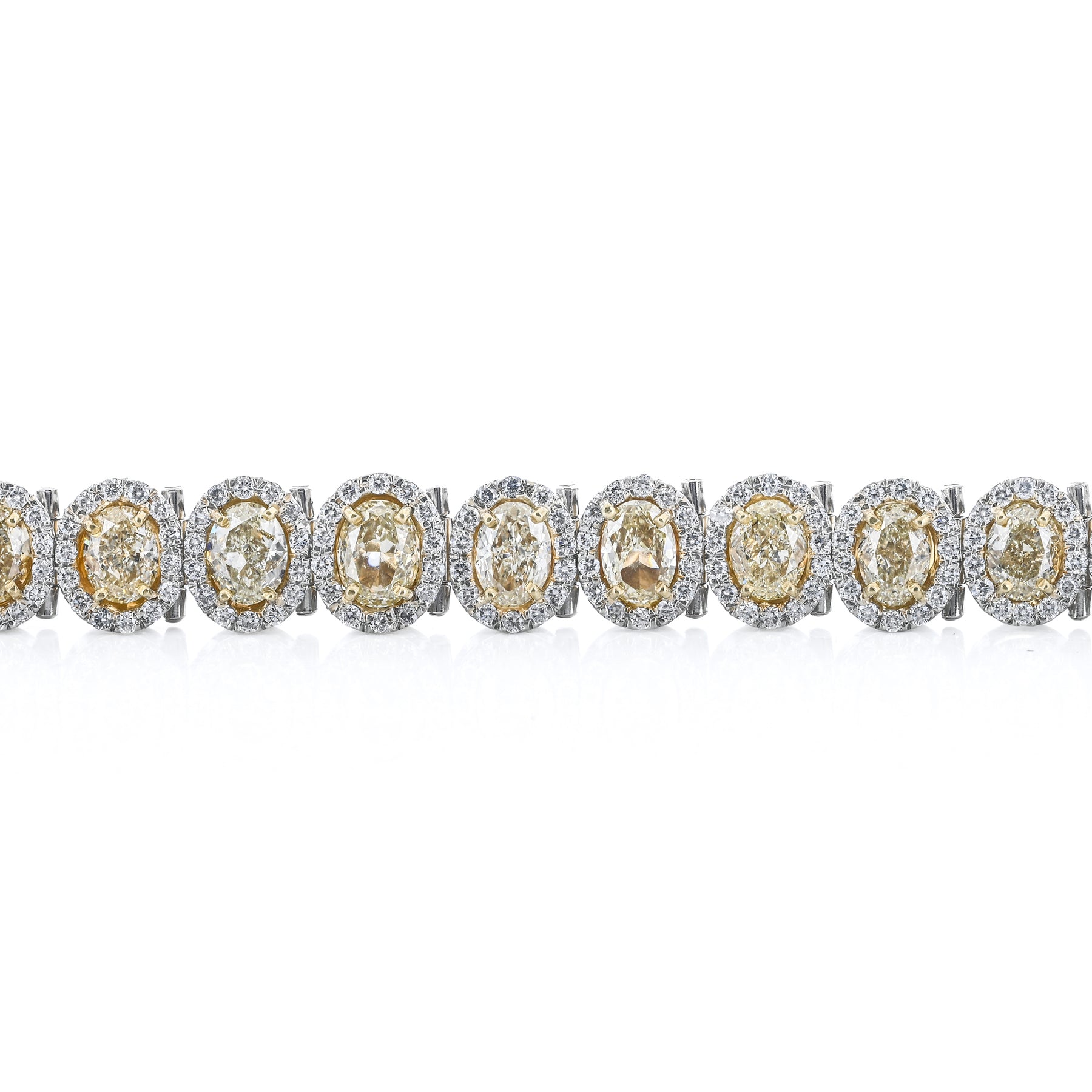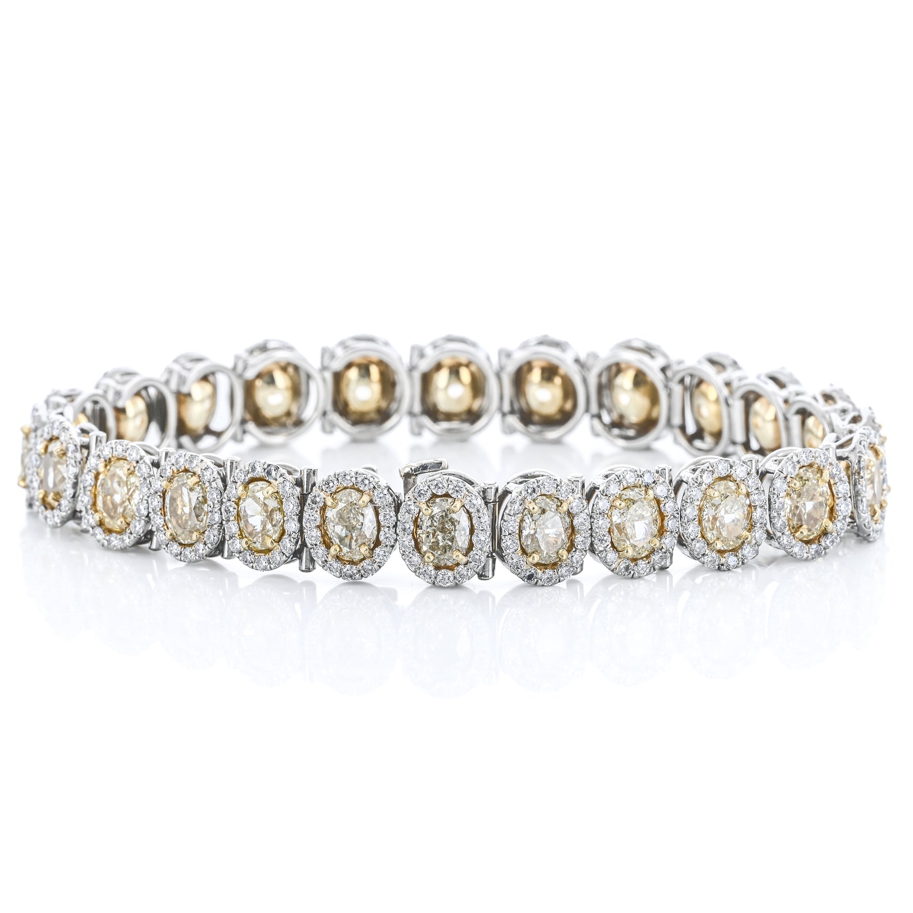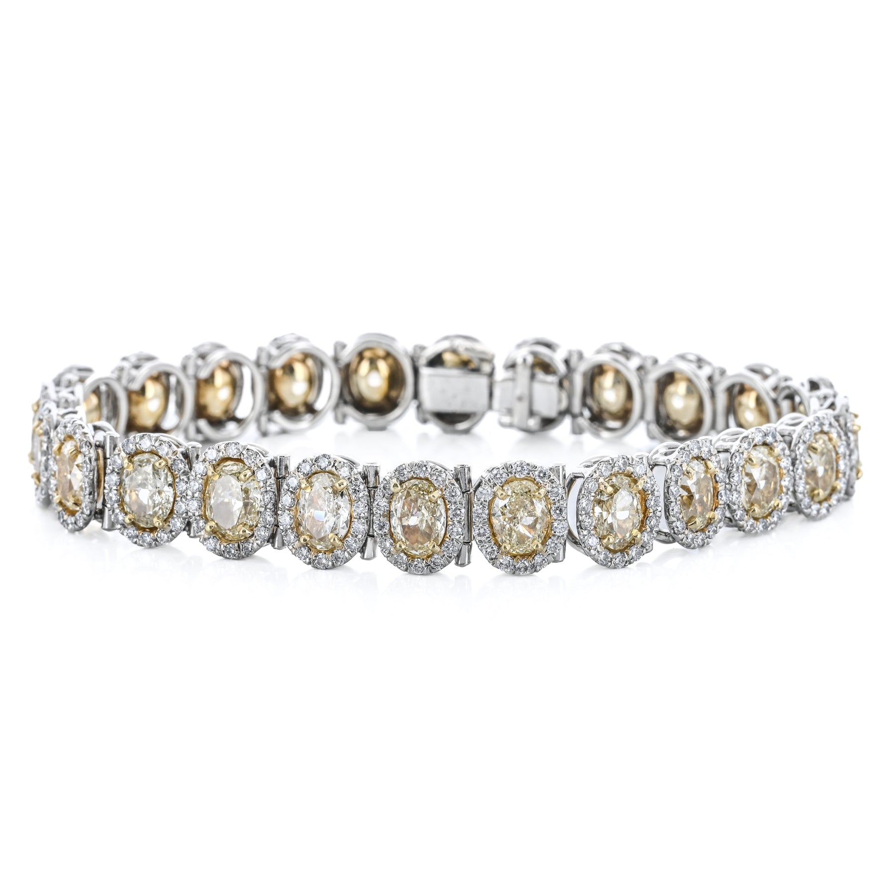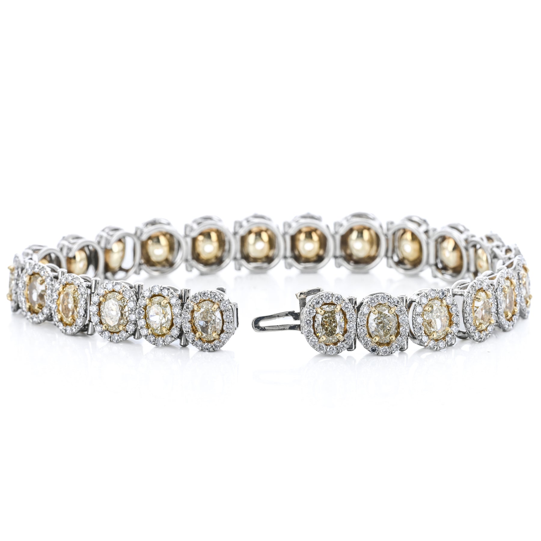 This platinum tennis bracelet features oval and round brilliant cut natural diamonds totaling 13.00 carats, with Fancy Yellow and near-colorless stones in VS–SI clarity. The bracelet measures 7 inches in length.