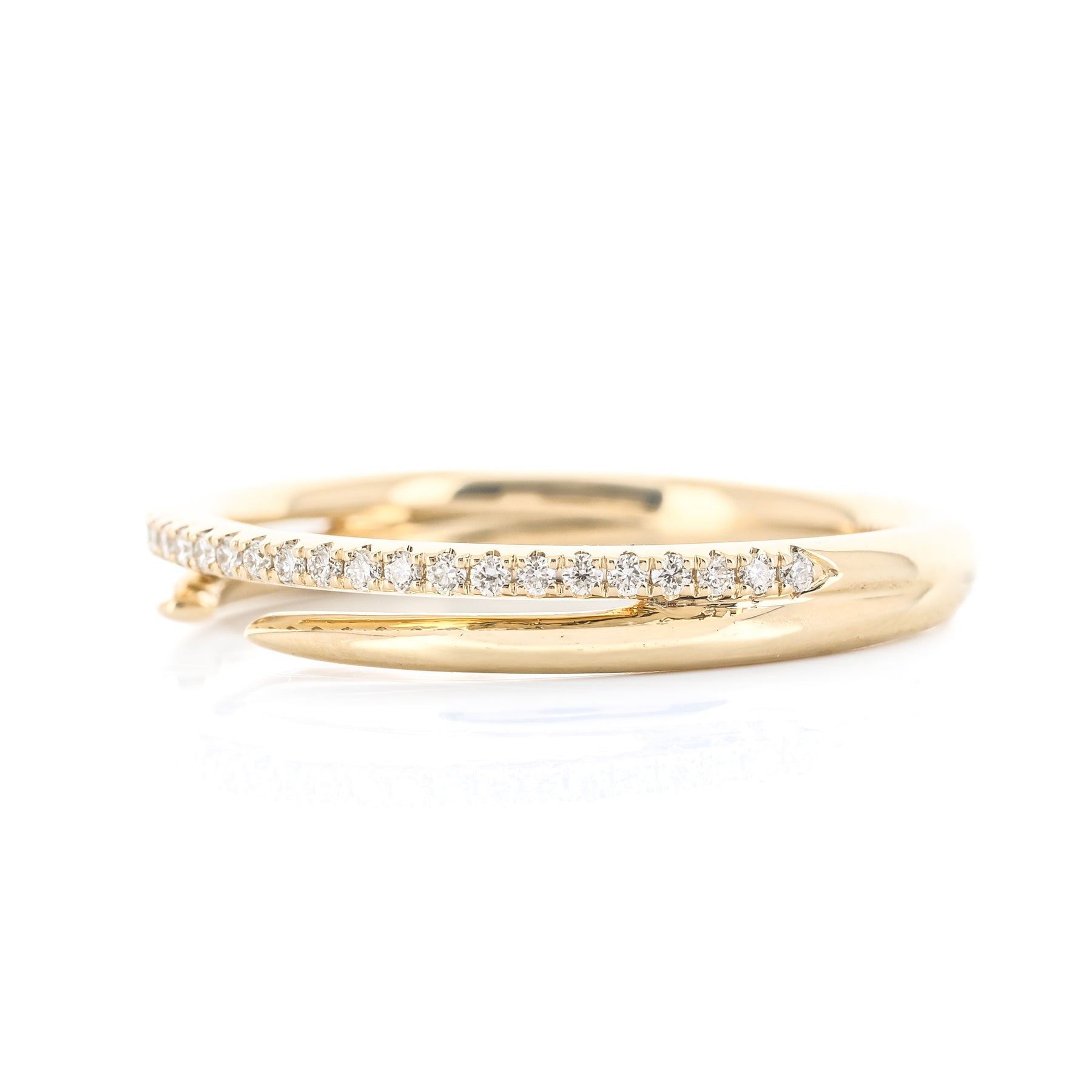 This 14K yellow gold band features an open horseshoe design accented with natural diamonds totaling 0.13 carats. This ring is a size 6.5.