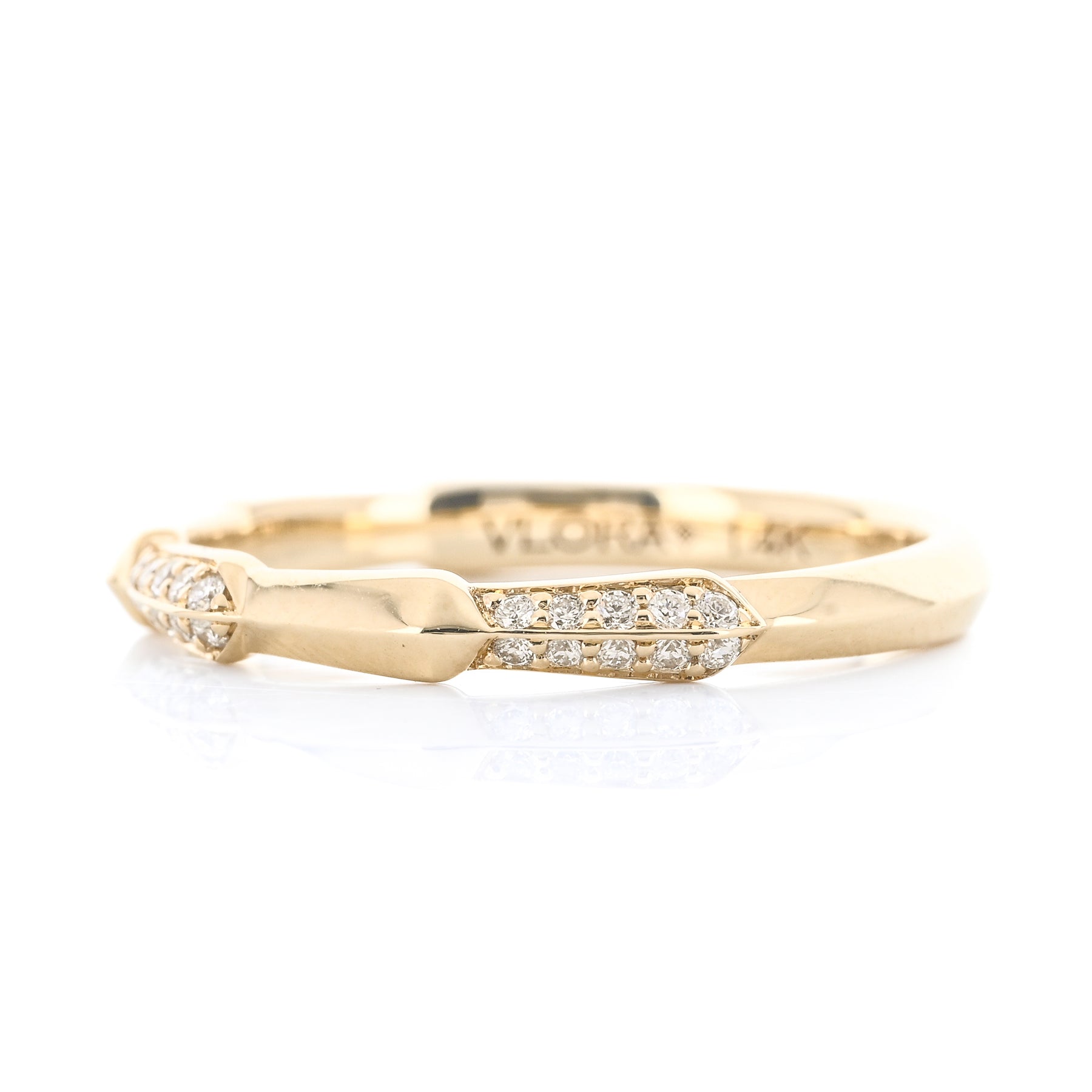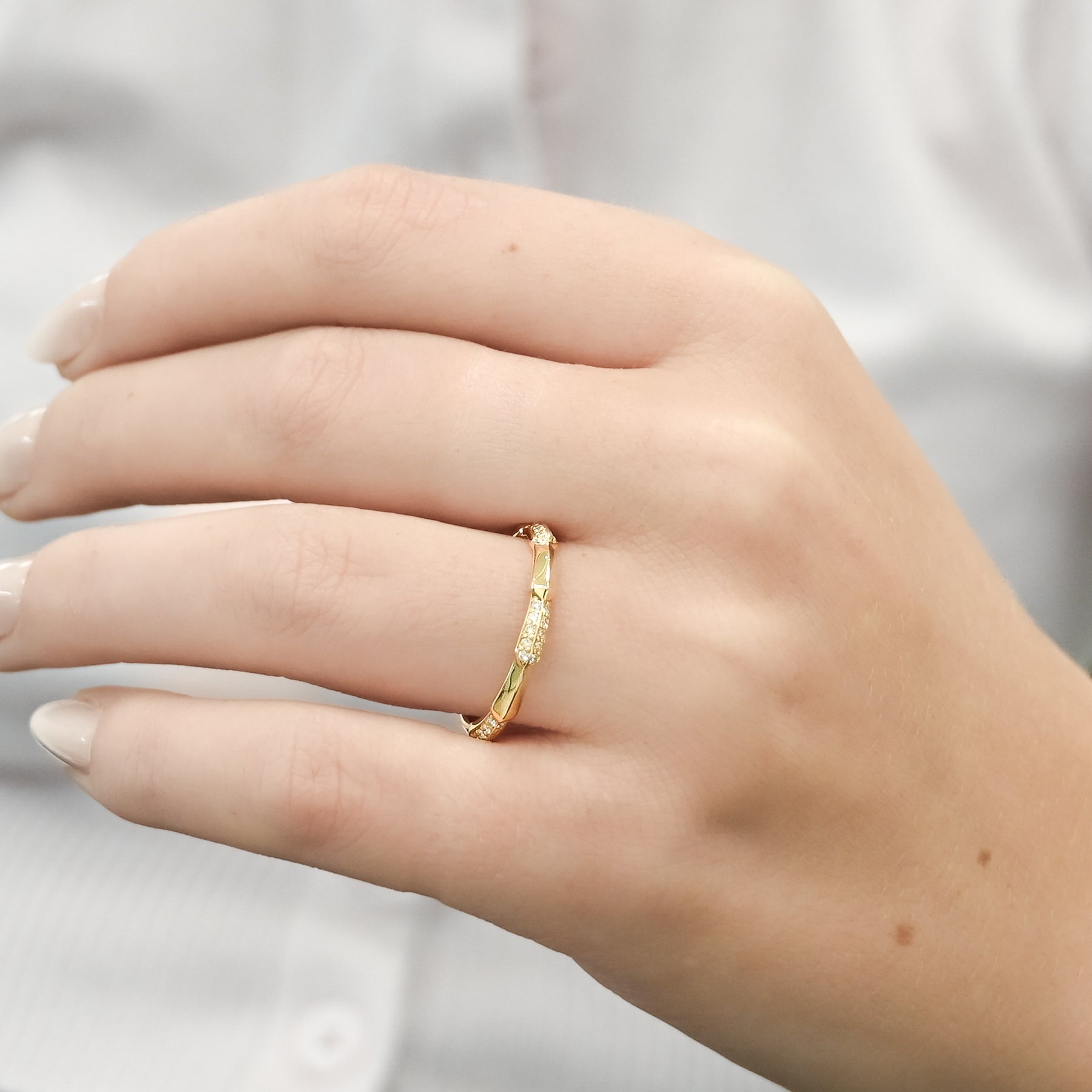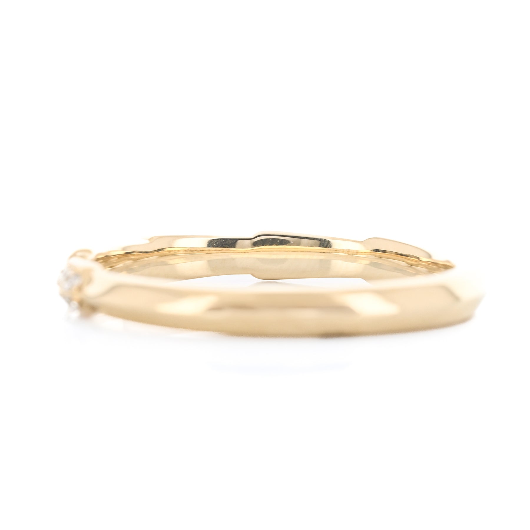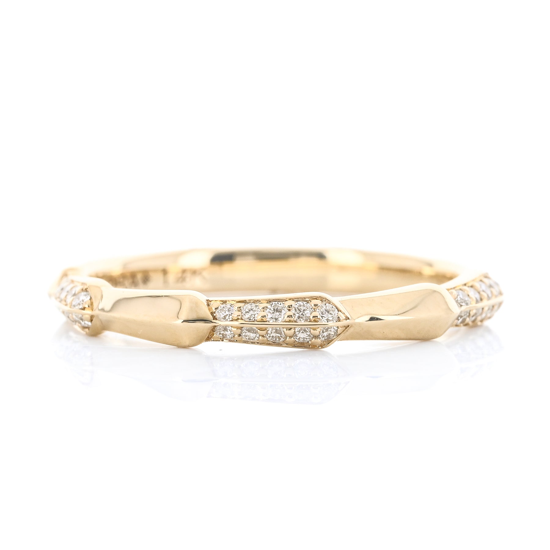 This 14K yellow gold geometric station band features pavé-set natural diamonds totaling 0.14 carats. This ring is a size 6.5.