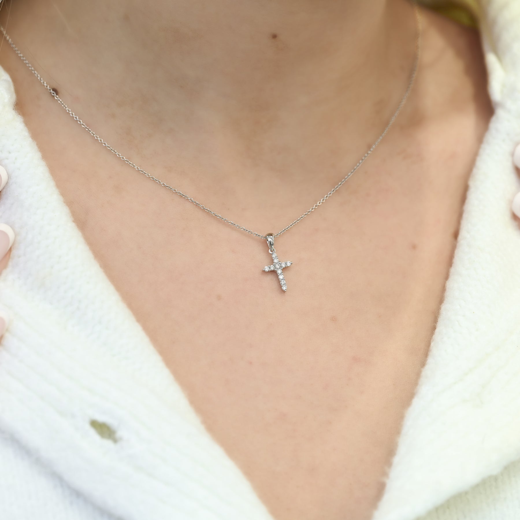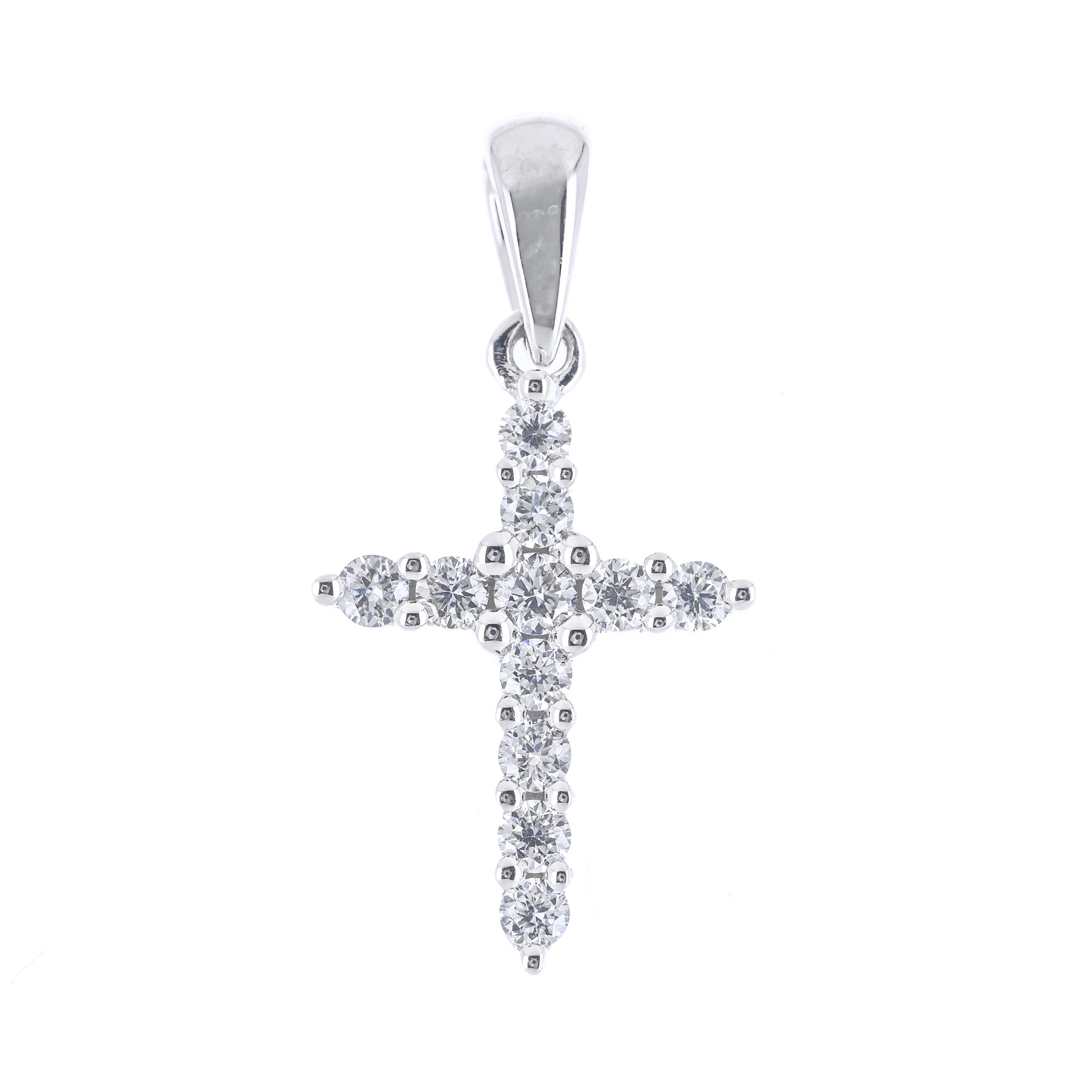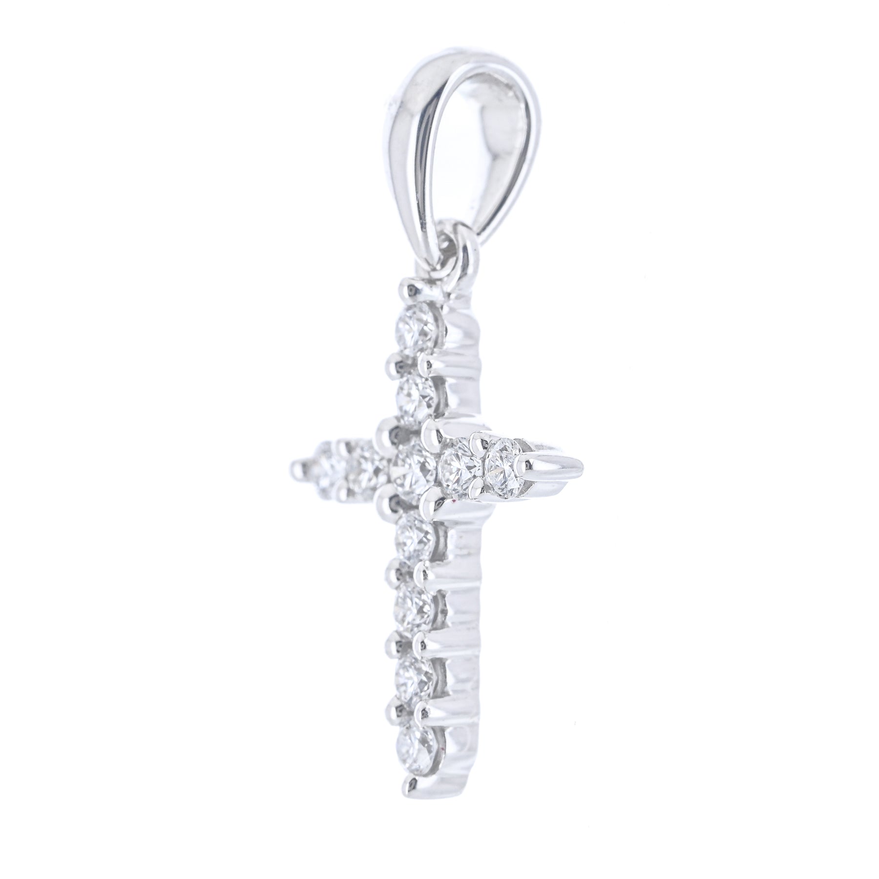 This 14K white gold cross features prong-set natural diamonds totaling 0.15 carats and measures approximately 11 × 6mm.