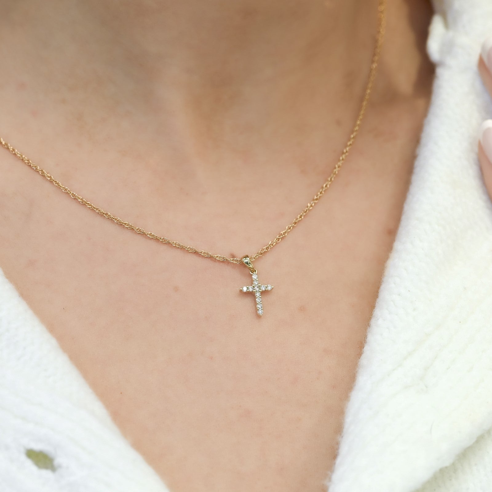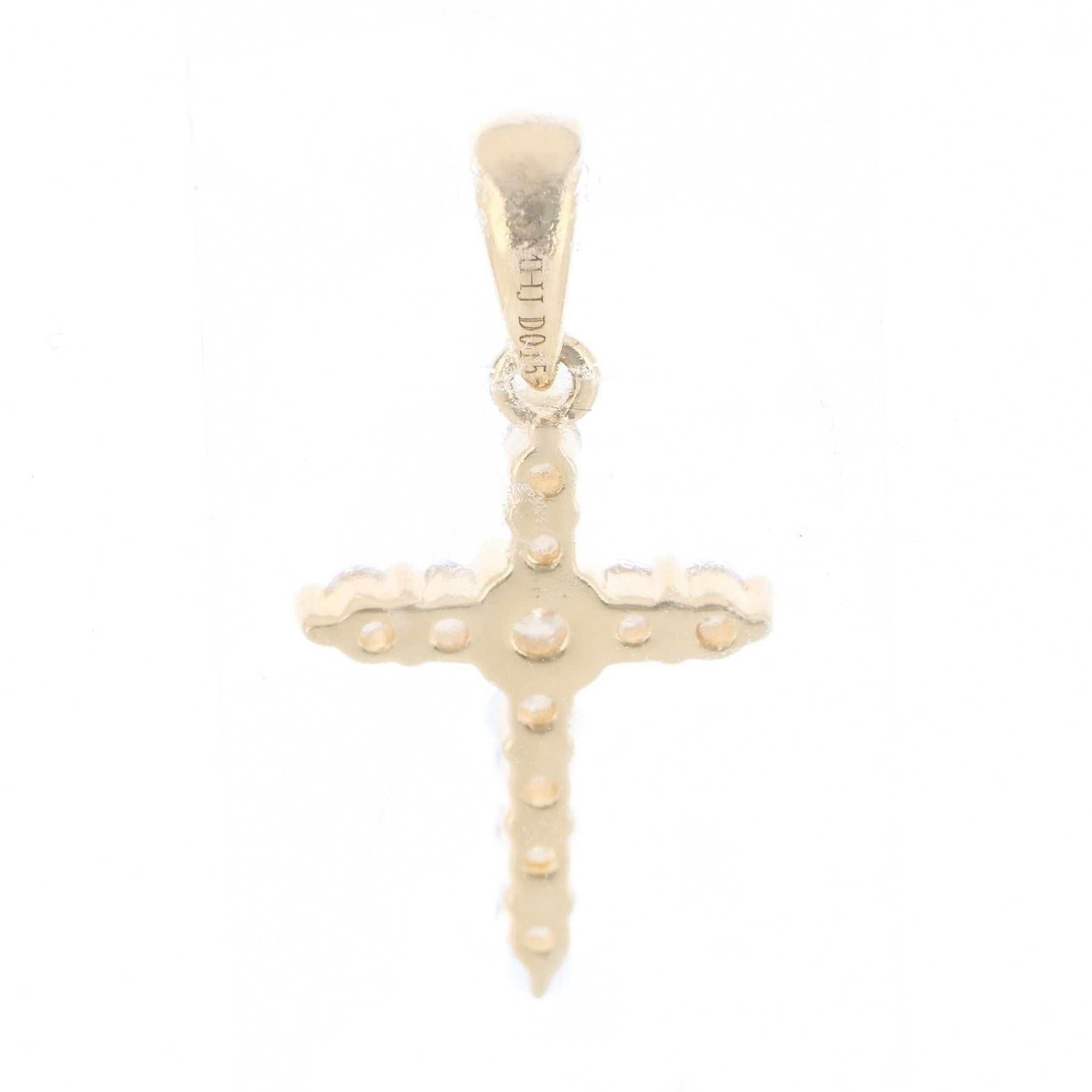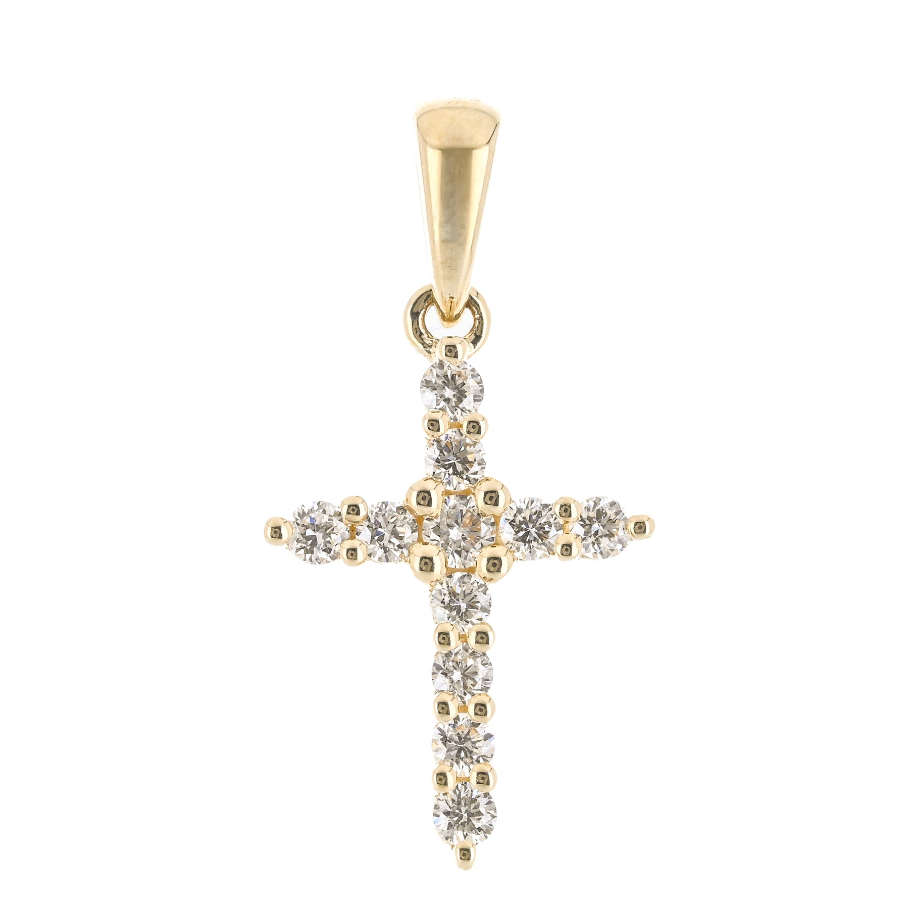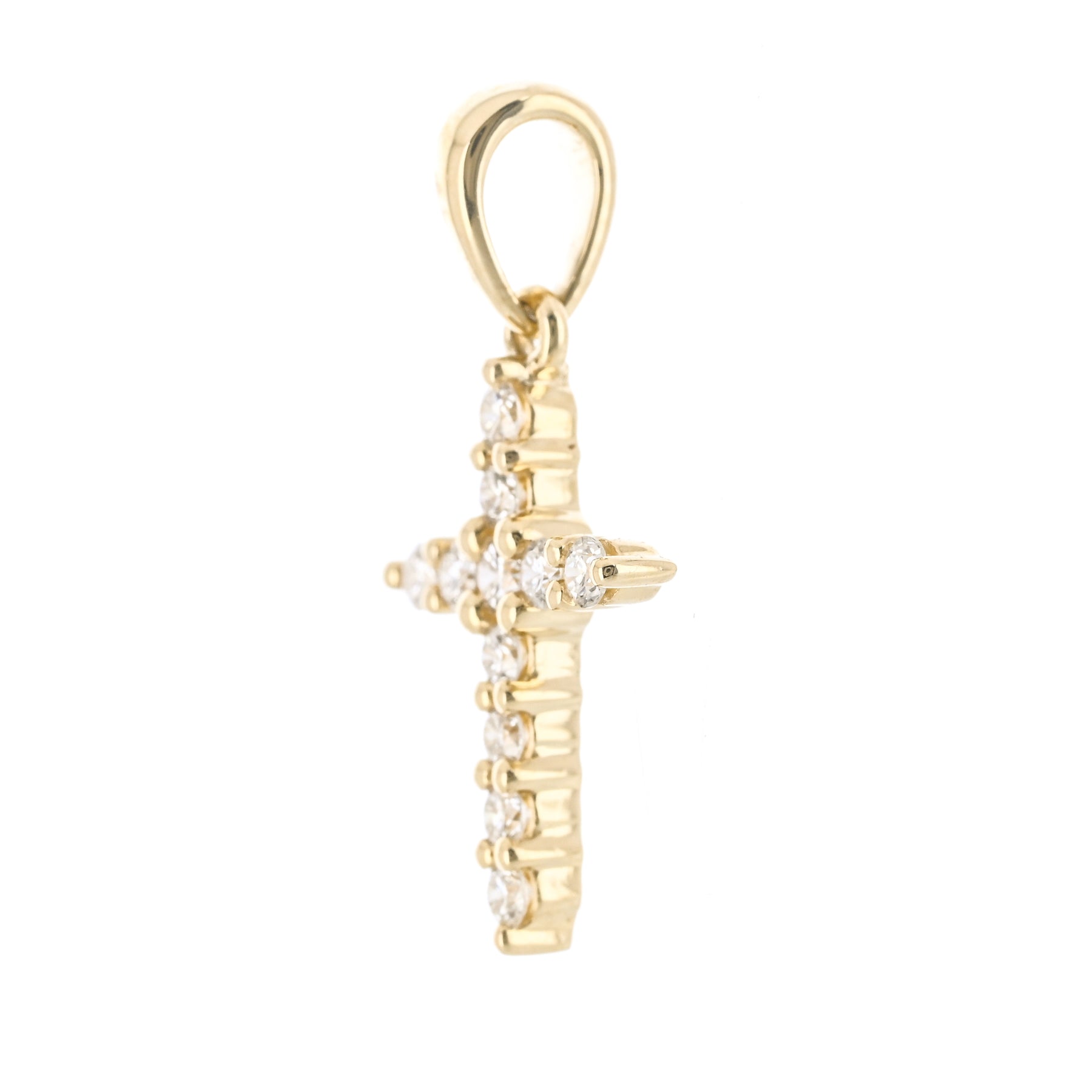 This 14K yellow gold cross features prong-set natural diamonds totaling 0.15 carats and measures approximately 11 × 6mm.