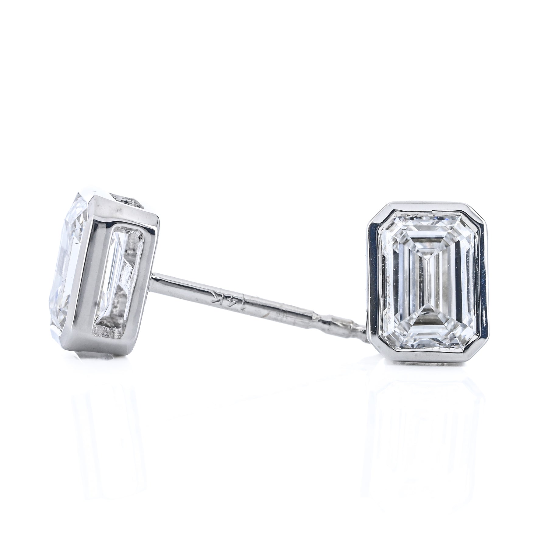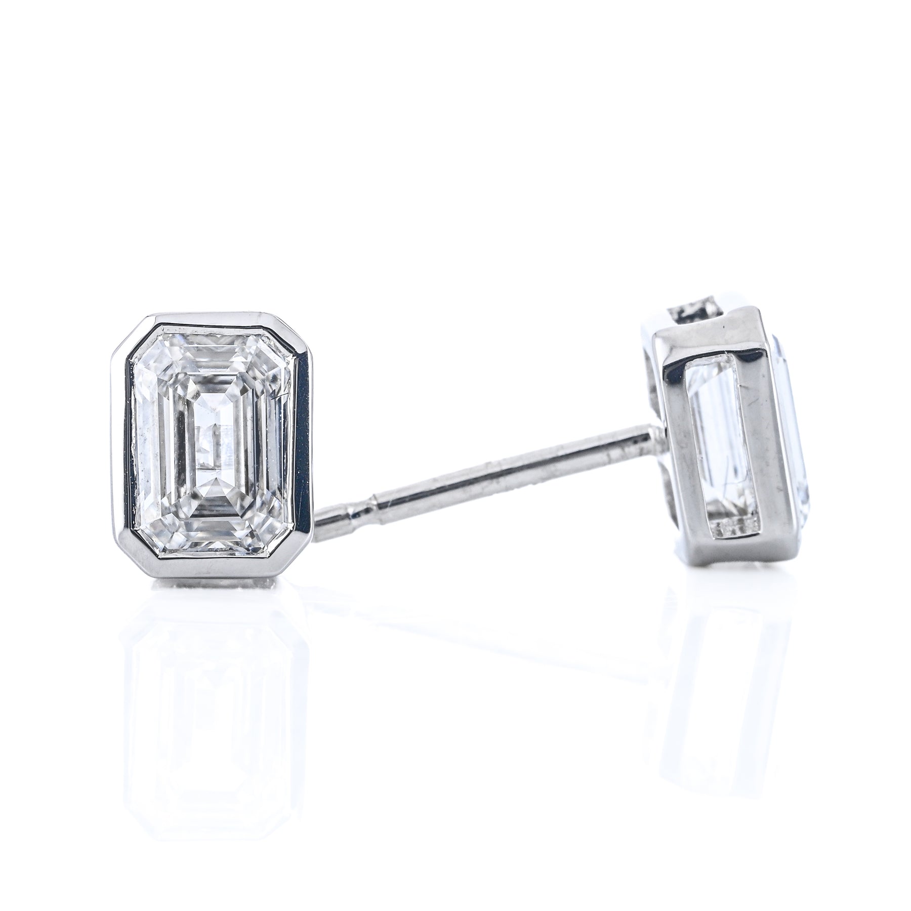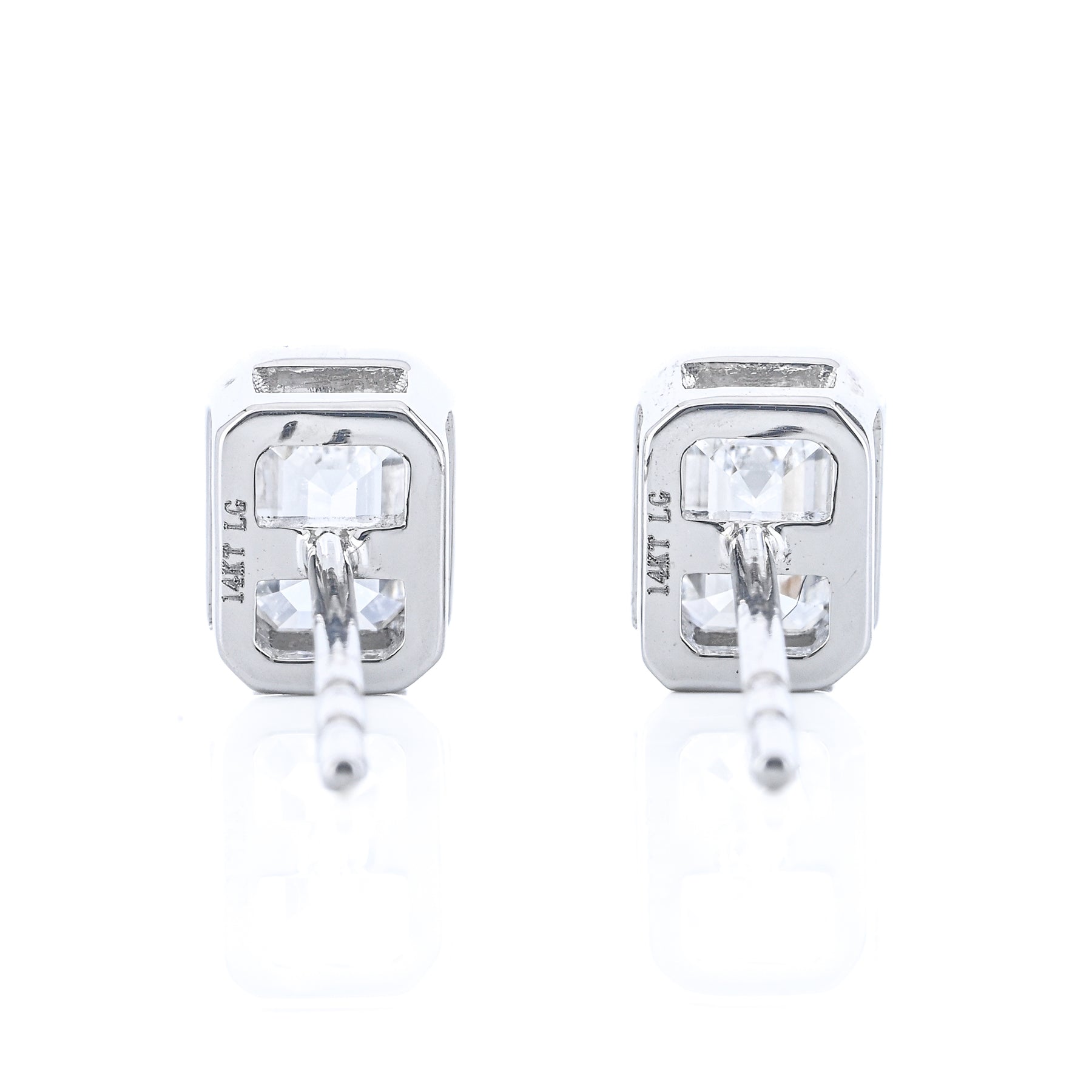 These 14K white gold stud earrings feature lab-grown emerald-cut diamonds totaling 1.00 carat, each set in a bezel and secured with butterfly backs.