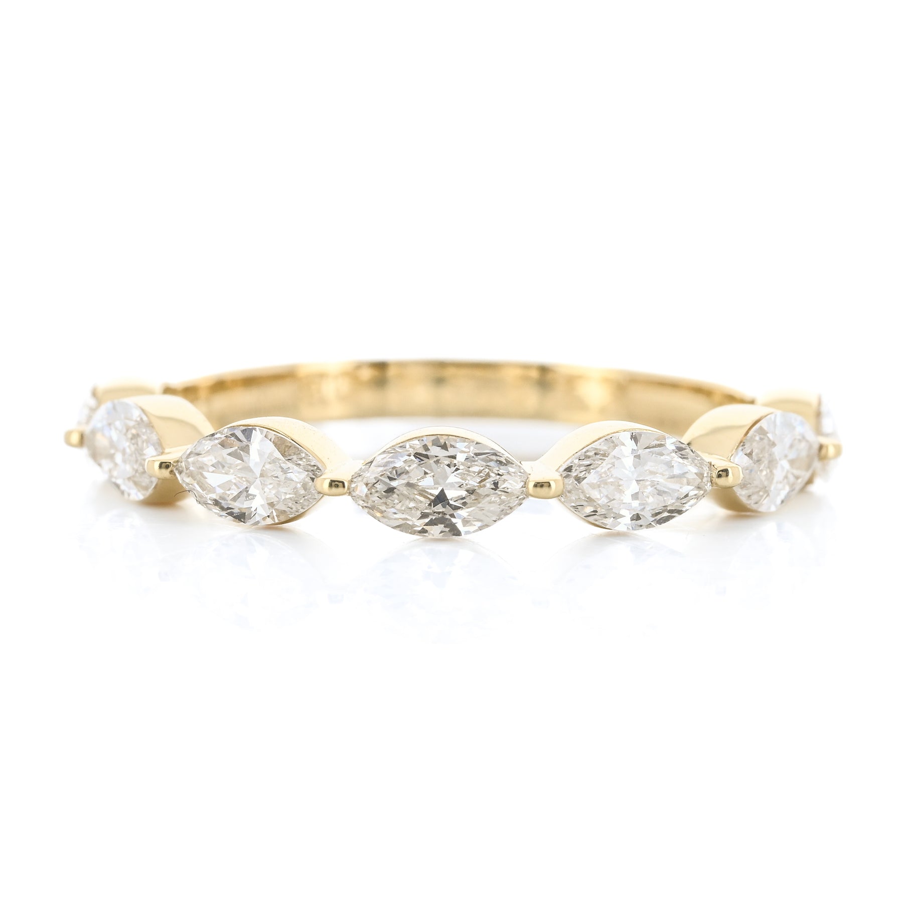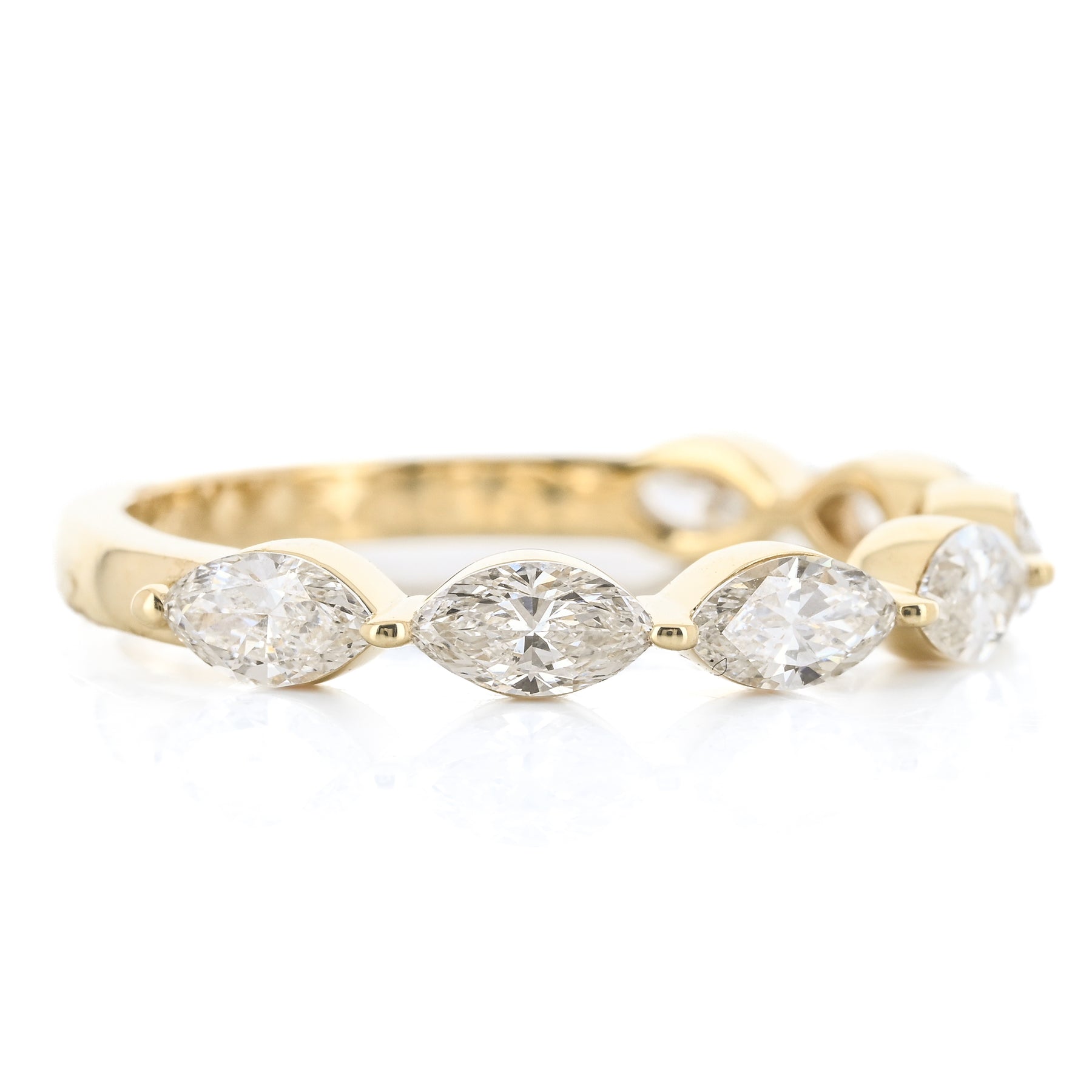 This 14K yellow gold band features east-west set lab-grown marquise diamonds totaling 1.00 carat in a single shared-prong design. This ring is a size 6.5.