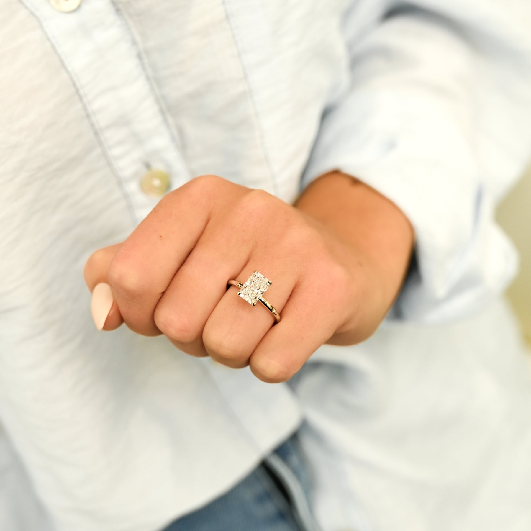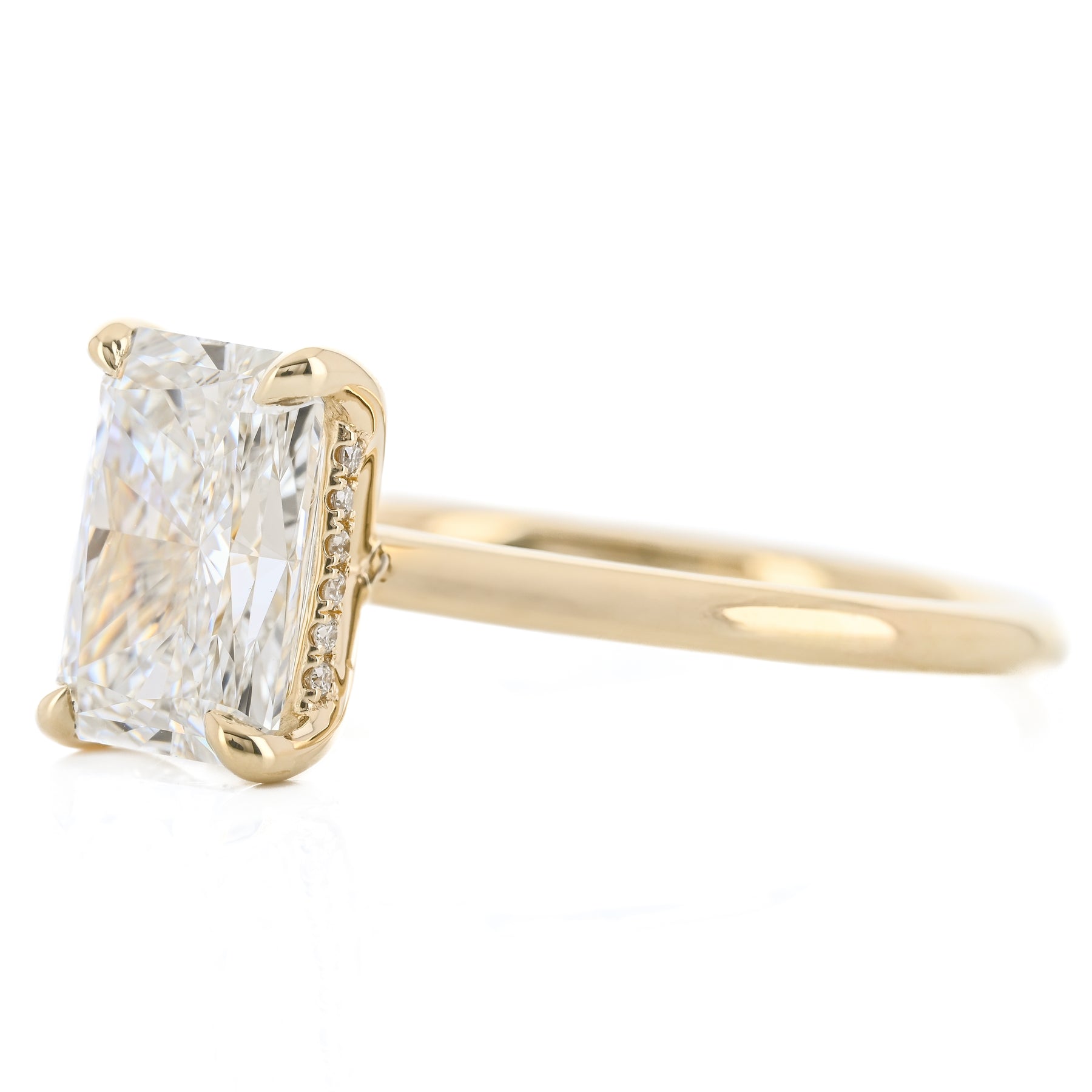 Introducing the 2.07ctw Lab Grown Radiant Cut Diamond Hidden Halo Ring, featuring a stunning 2.01ct center stone. Expertly crafted in 14K yellow gold for timeless elegance.