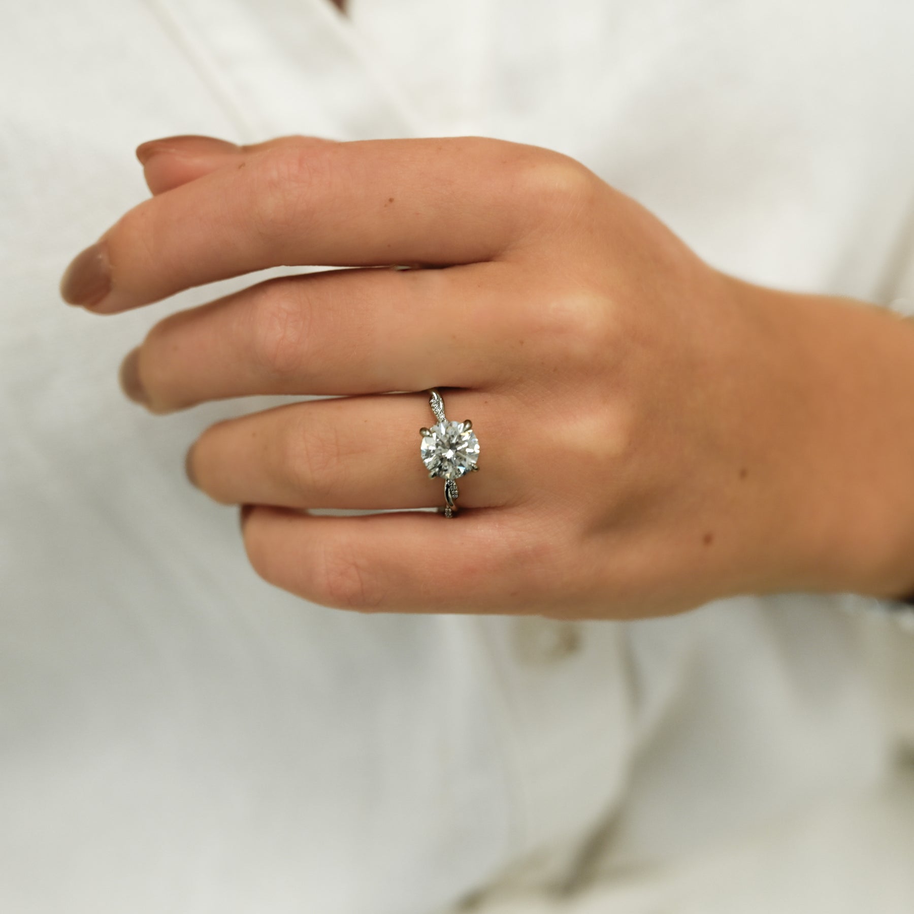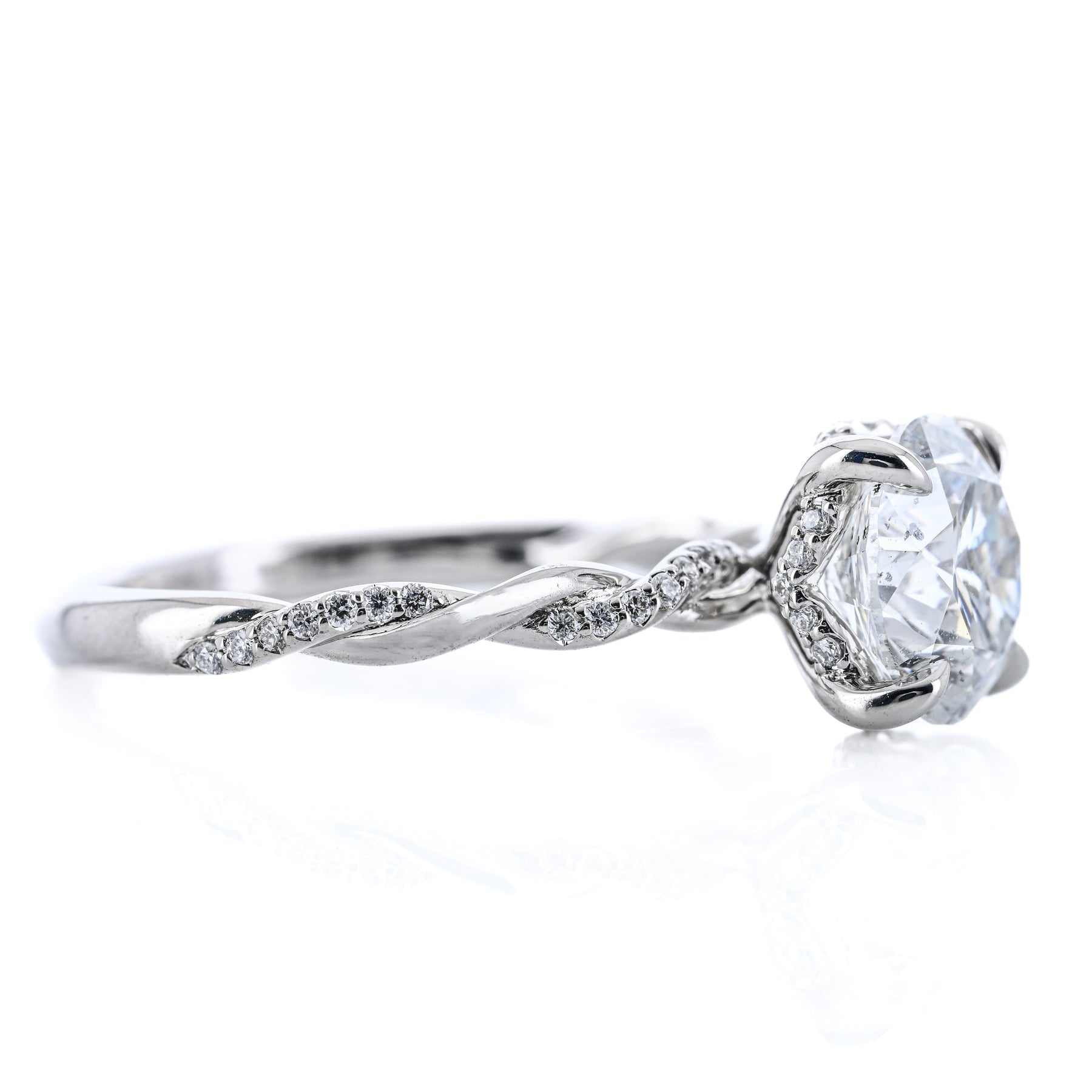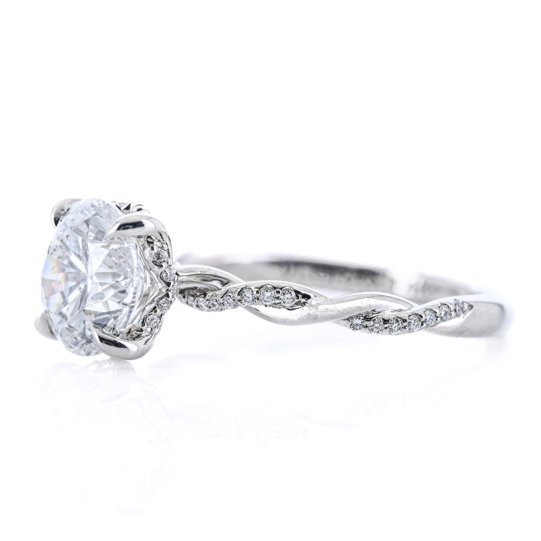 Introducing the 2.12ctw Round Brilliant Cut Natural Diamond Engagement Ring, featuring a twisted diamond shank. Crafted in 14K white gold.