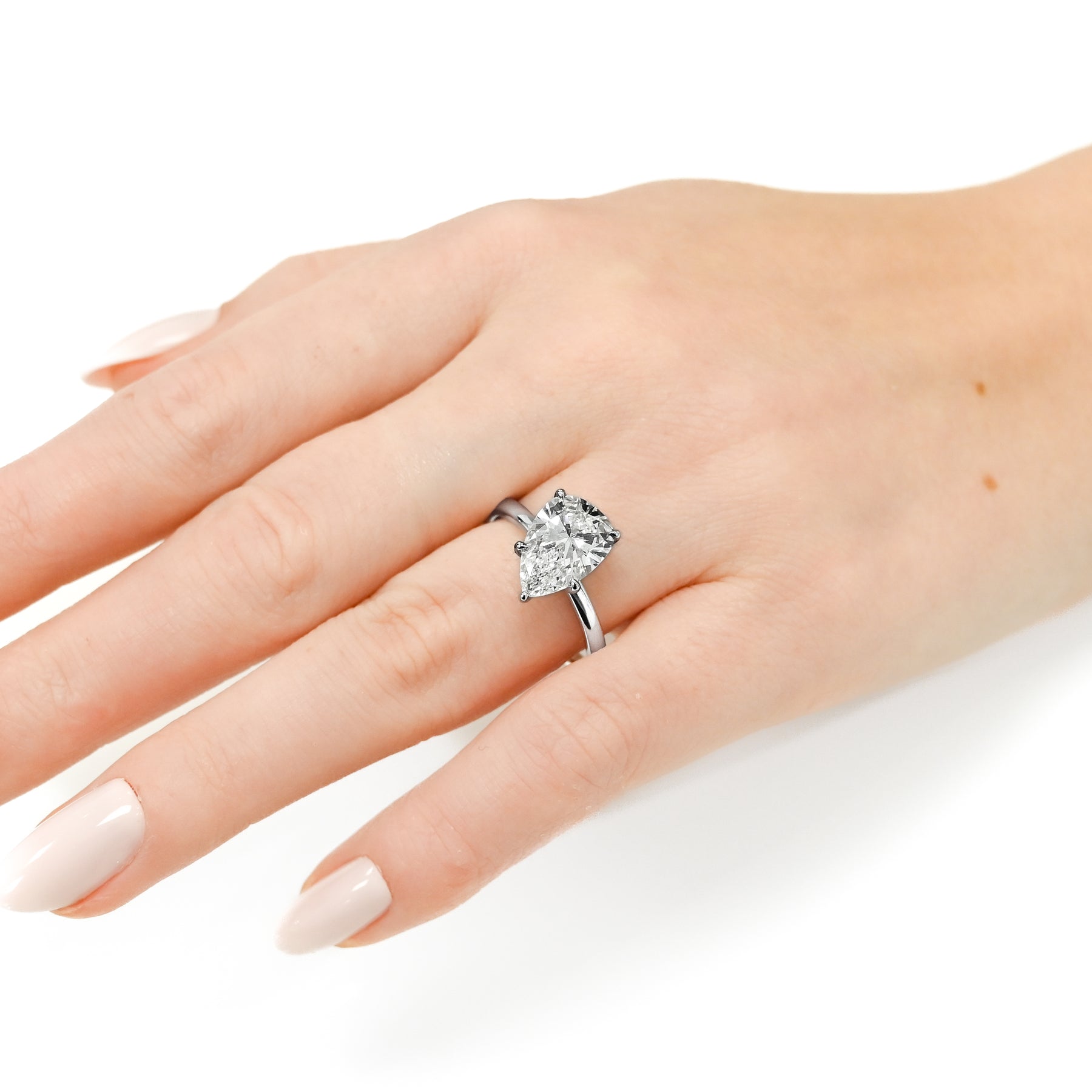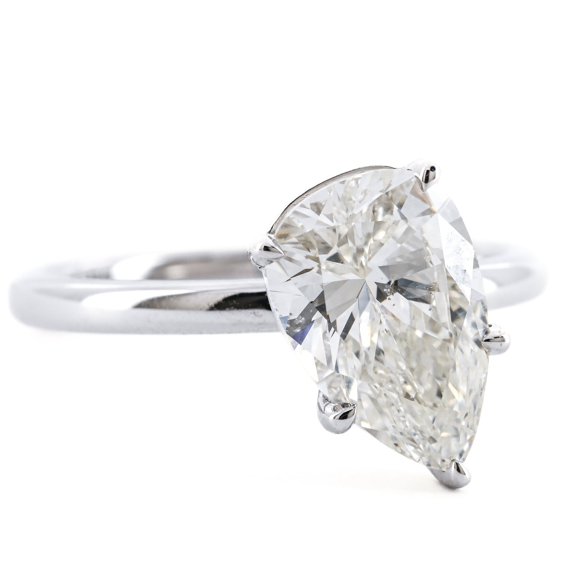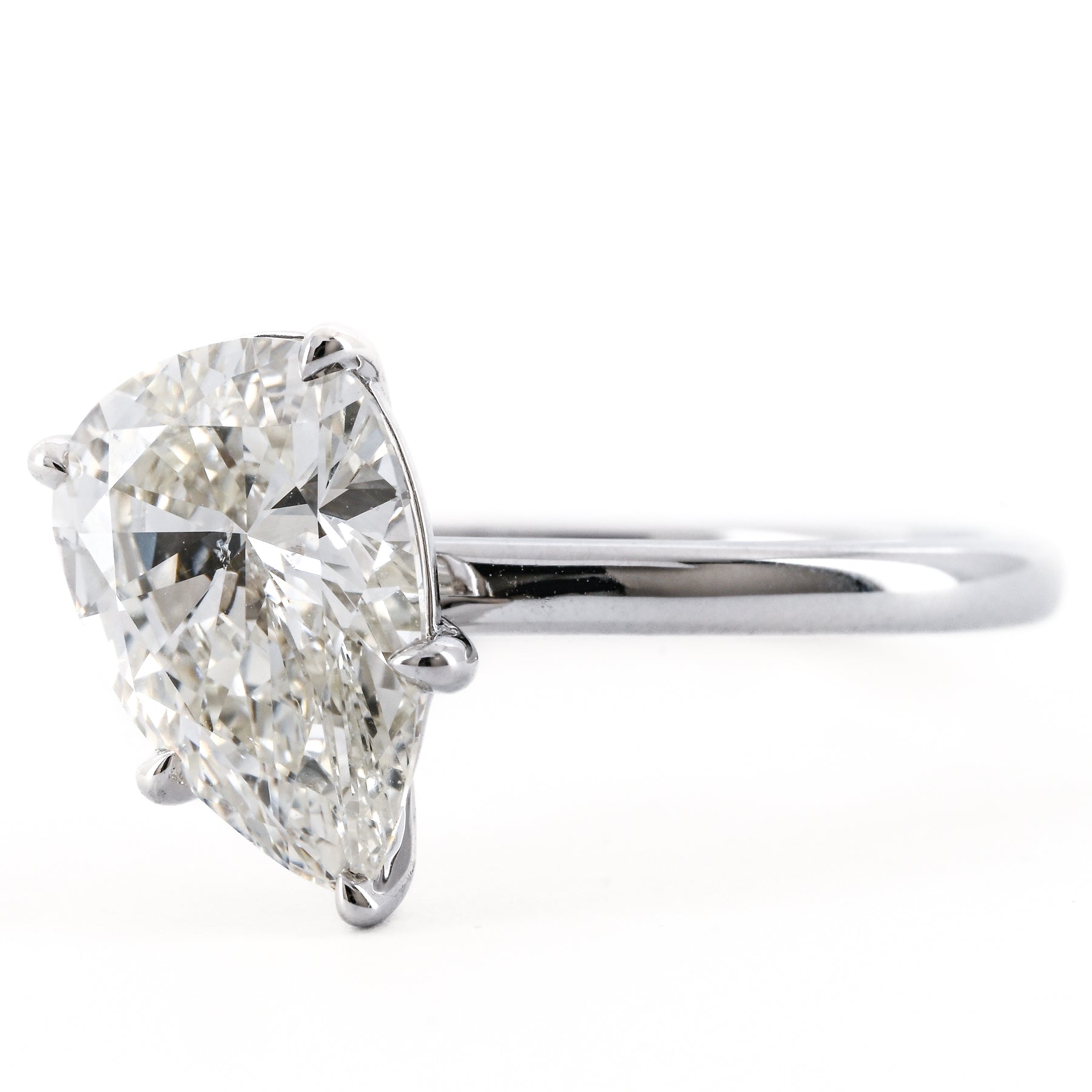 Introducing the 2.48ct Pear Diamond Engagement Ring, featuring a slanted solitaire mounting. Crafted in 14K white gold and a center diamond with faint fluorescence.