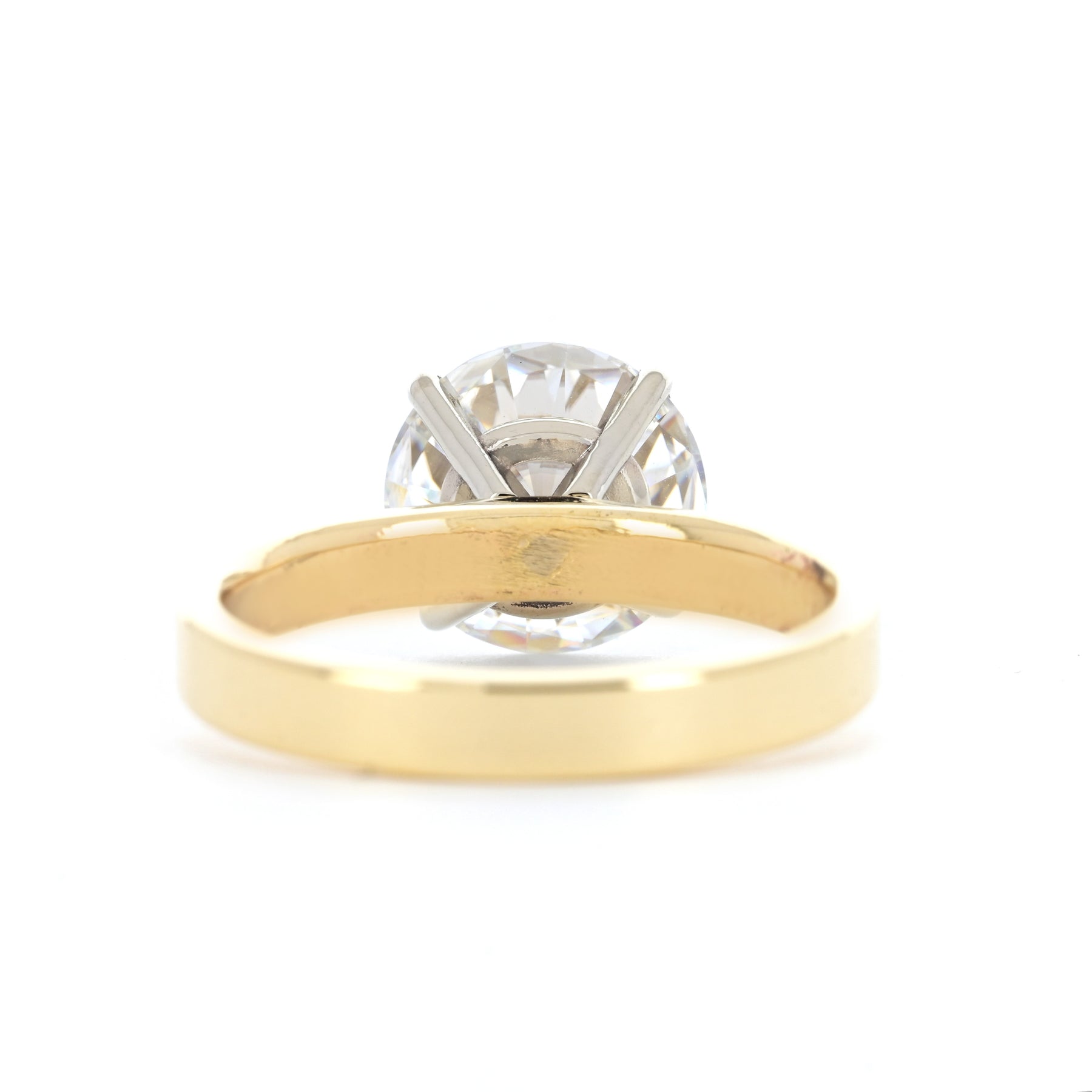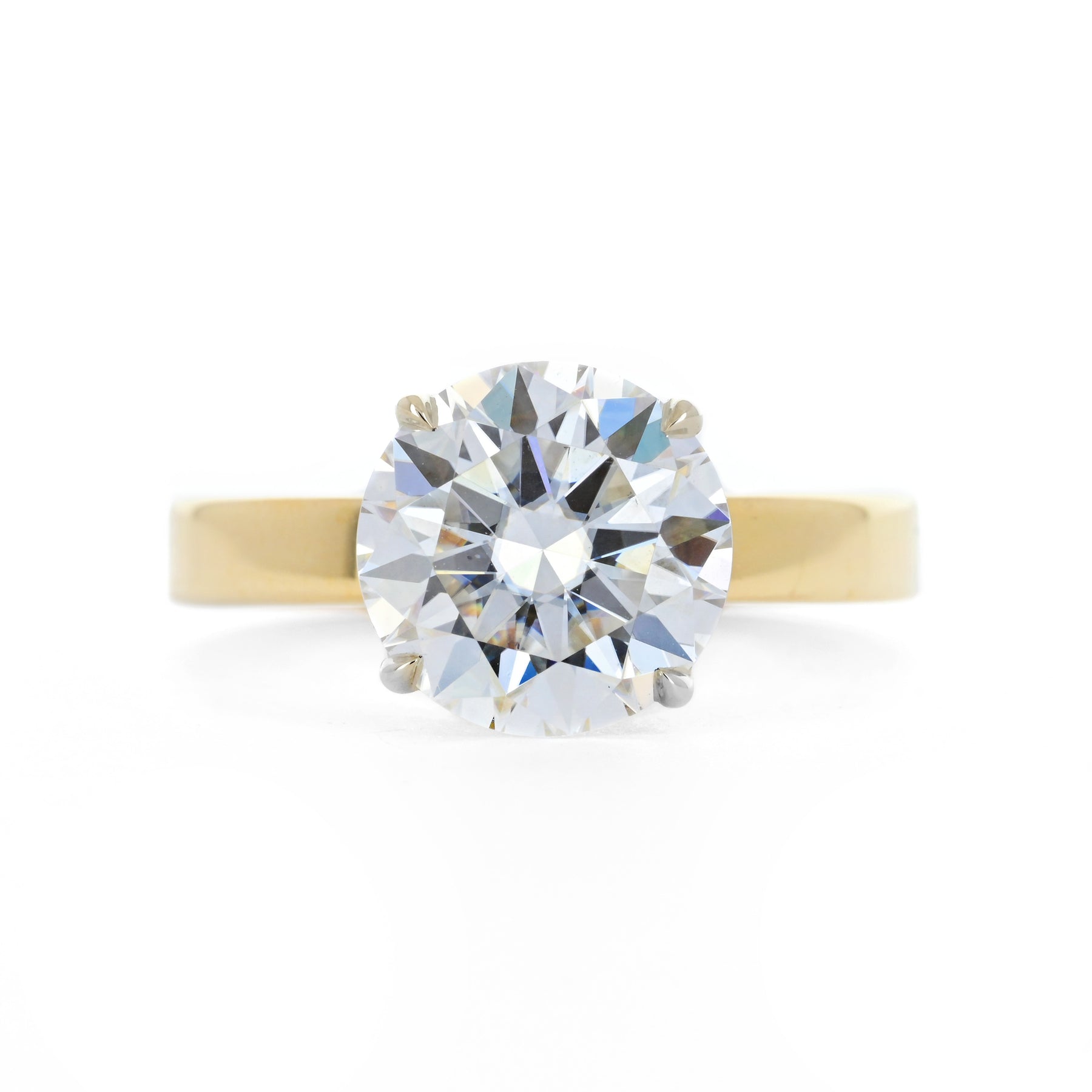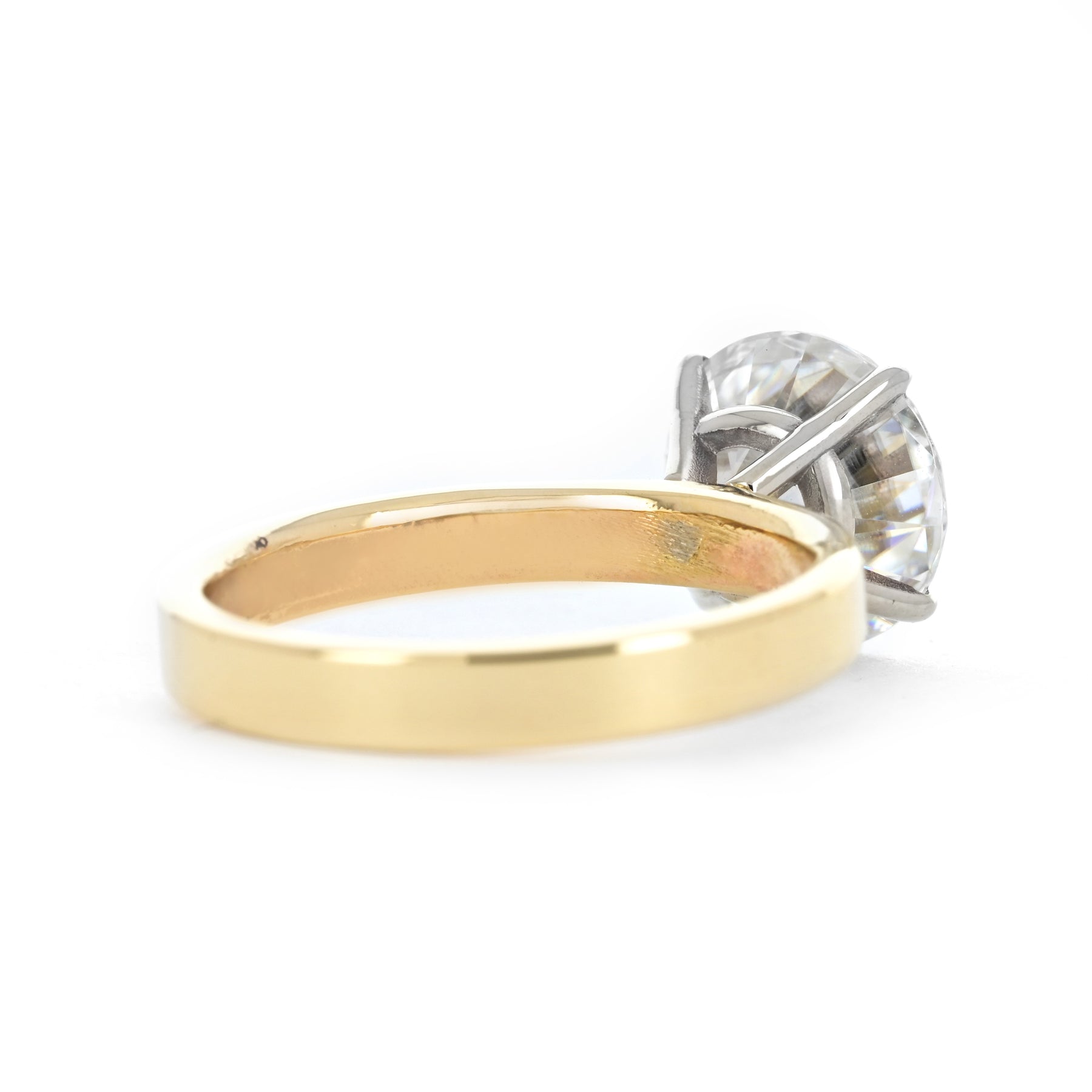 Introducing the timeless 2.95ct round moissanite engagement ring by Buchroeders Jewelers. This classic solitaire features a 2.95ct moissanite center stone, secured by 14k white gold prongs and a 3mm yellow gold band.