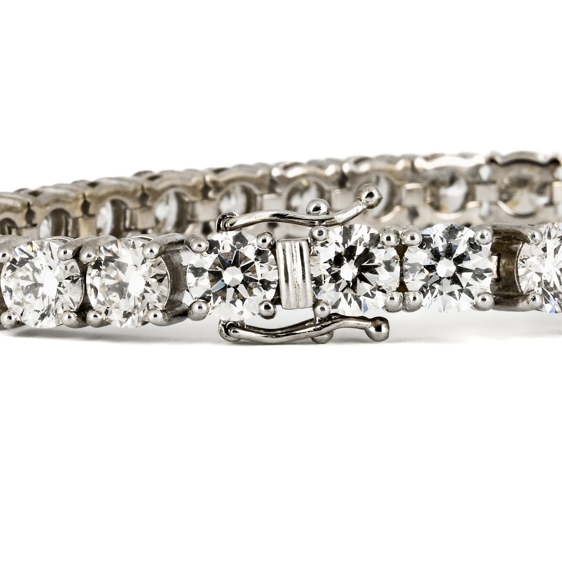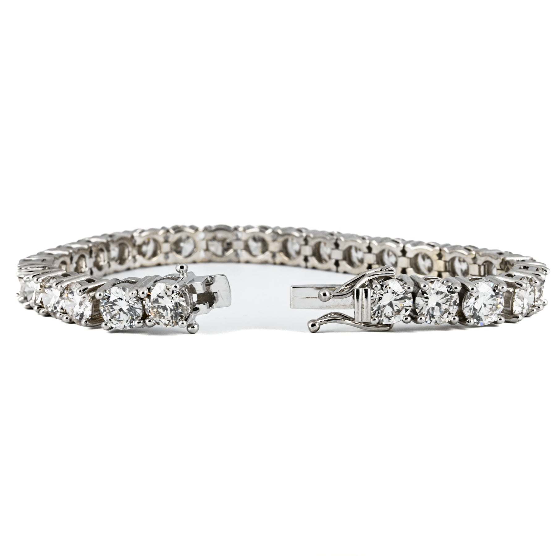 The 28.75ctw Lab-Grown Round Diamond Tennis Bracelet in 14K White Gold features an exquisite row of brilliant round diamonds with K-L color and VS-SI clarity. Measuring 7.5 inches in length, this bracelet is a statement of elegance and sophistication. Regular retail price: $30,000. Available at Buchroeders Jewelers.