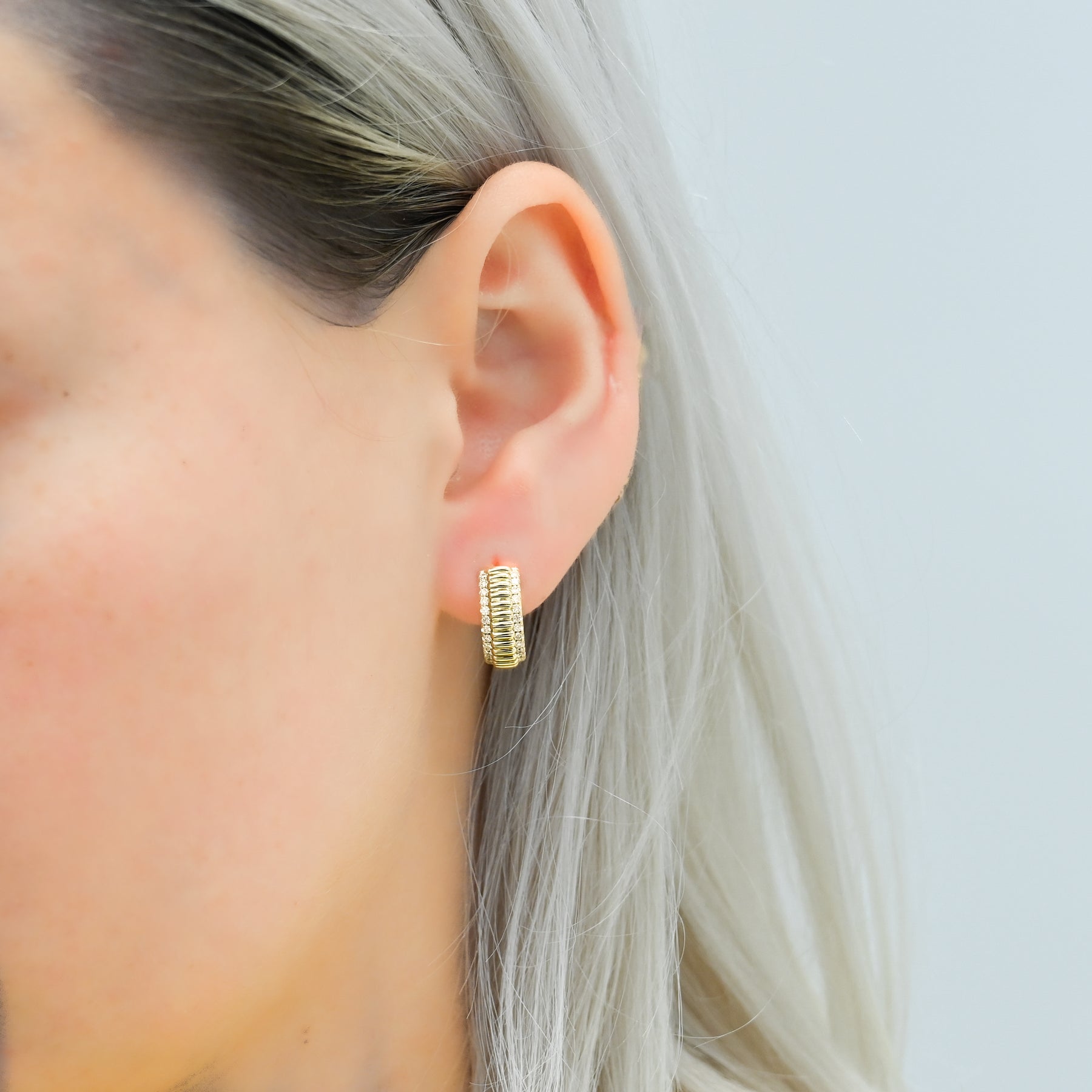 Introducing the .39ctw Diamond Fluted Center Huggie Earrings, crafted in 14K yellow gold.
