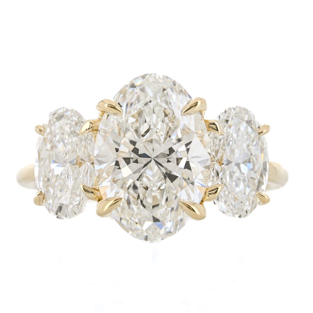 Introducing the 5.02ctw Lab Grown Oval Diamond Three-Stone Ring, featuring a stunning center stone accented by matching oval side stones. Expertly crafted in 14K yellow gold for timeless elegance.