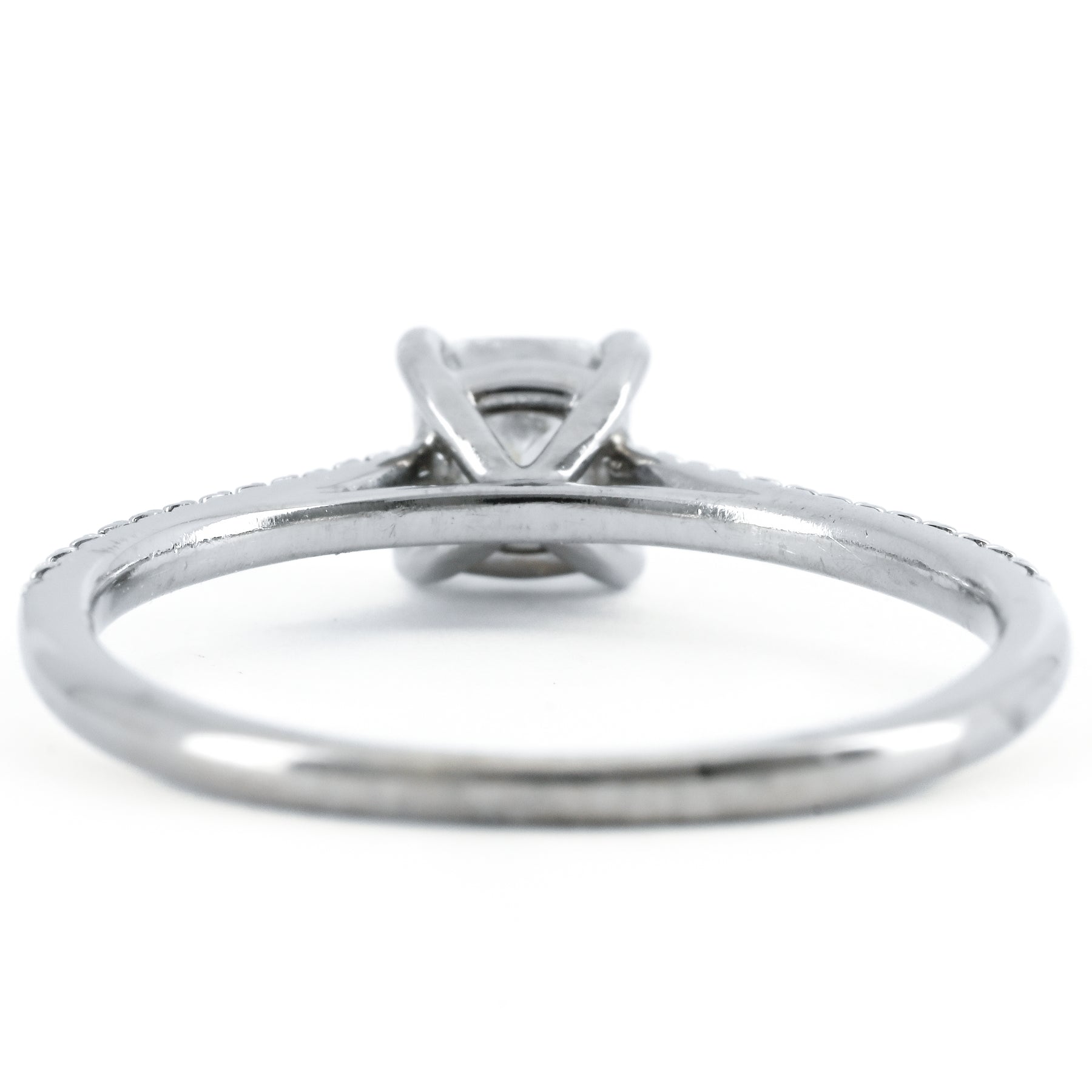 Introducing the .55ctw Cushion Diamond Engagement Ring featuring a cathedral-style gallery, crafted in 14K white gold. This natural diamond engagement ring includes a .48 carat cushion-cut center diamond, graded H/I1.