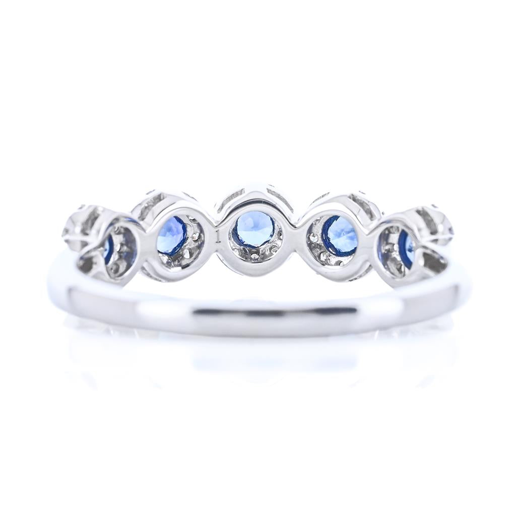 This 14K white gold ring features five round sapphires totaling 0.34 carats, each set in diamond halos with 0.24 carats in total weight. Size 6.5.