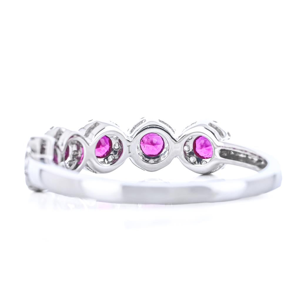 This 14K white gold ring features five round rubies totaling 0.34 carats, each set in diamond halos with 0.25 carats in total weight. Size 6.5.