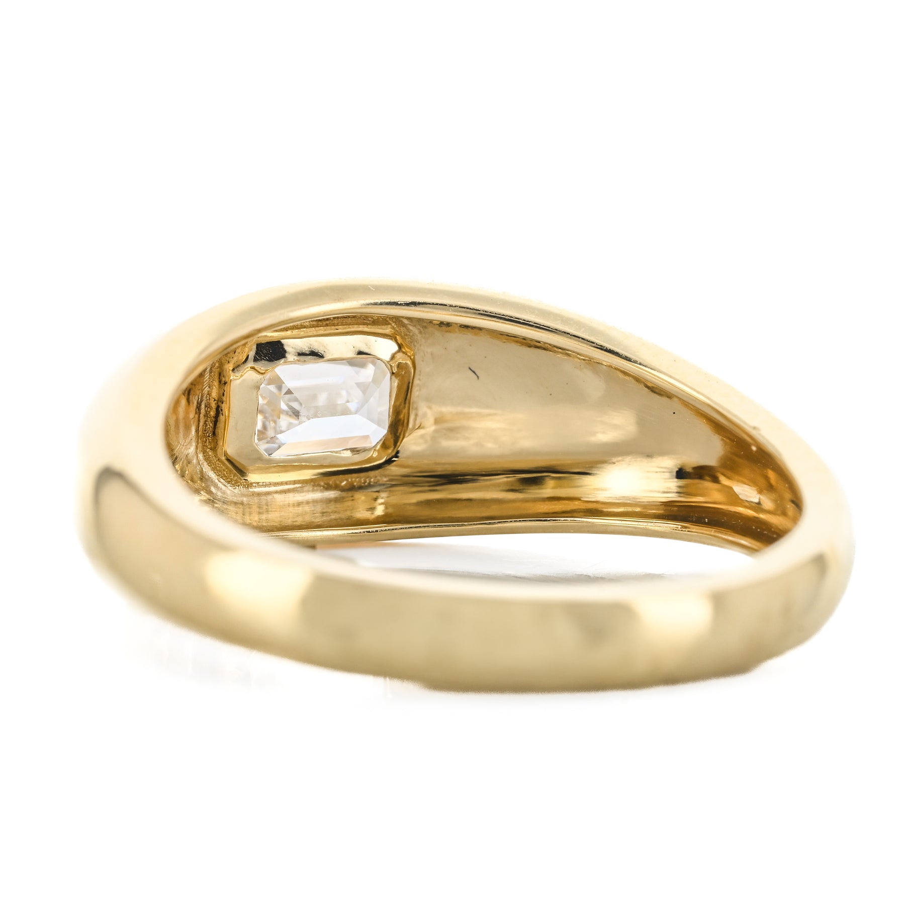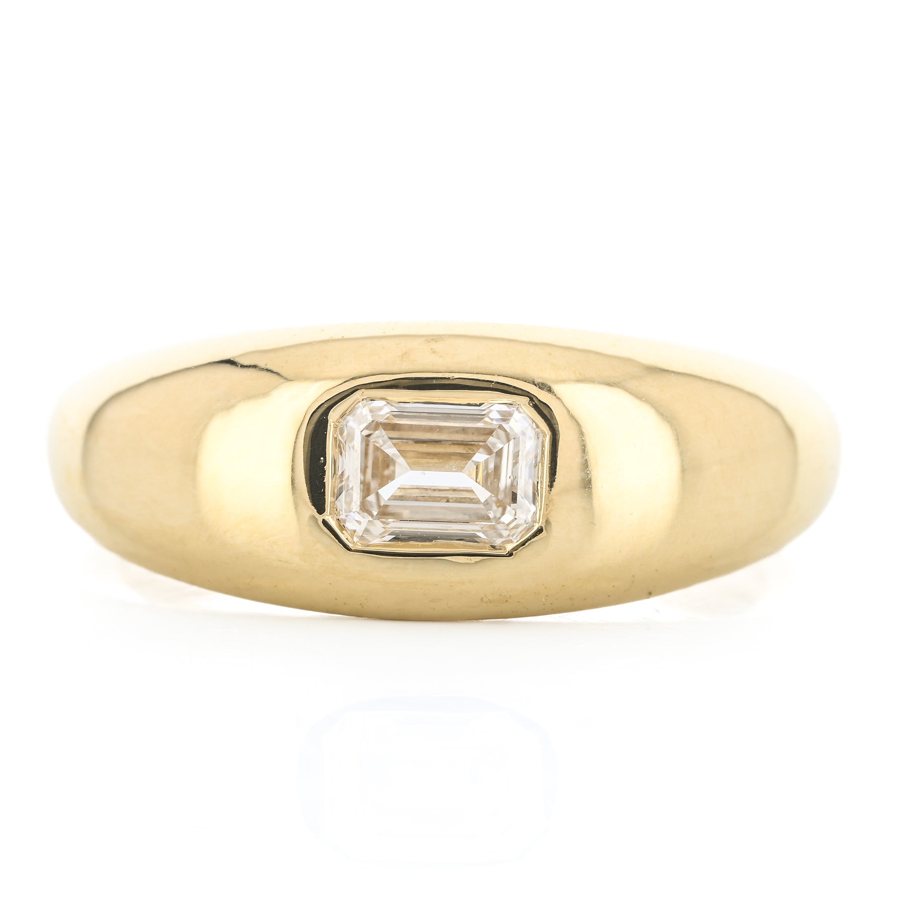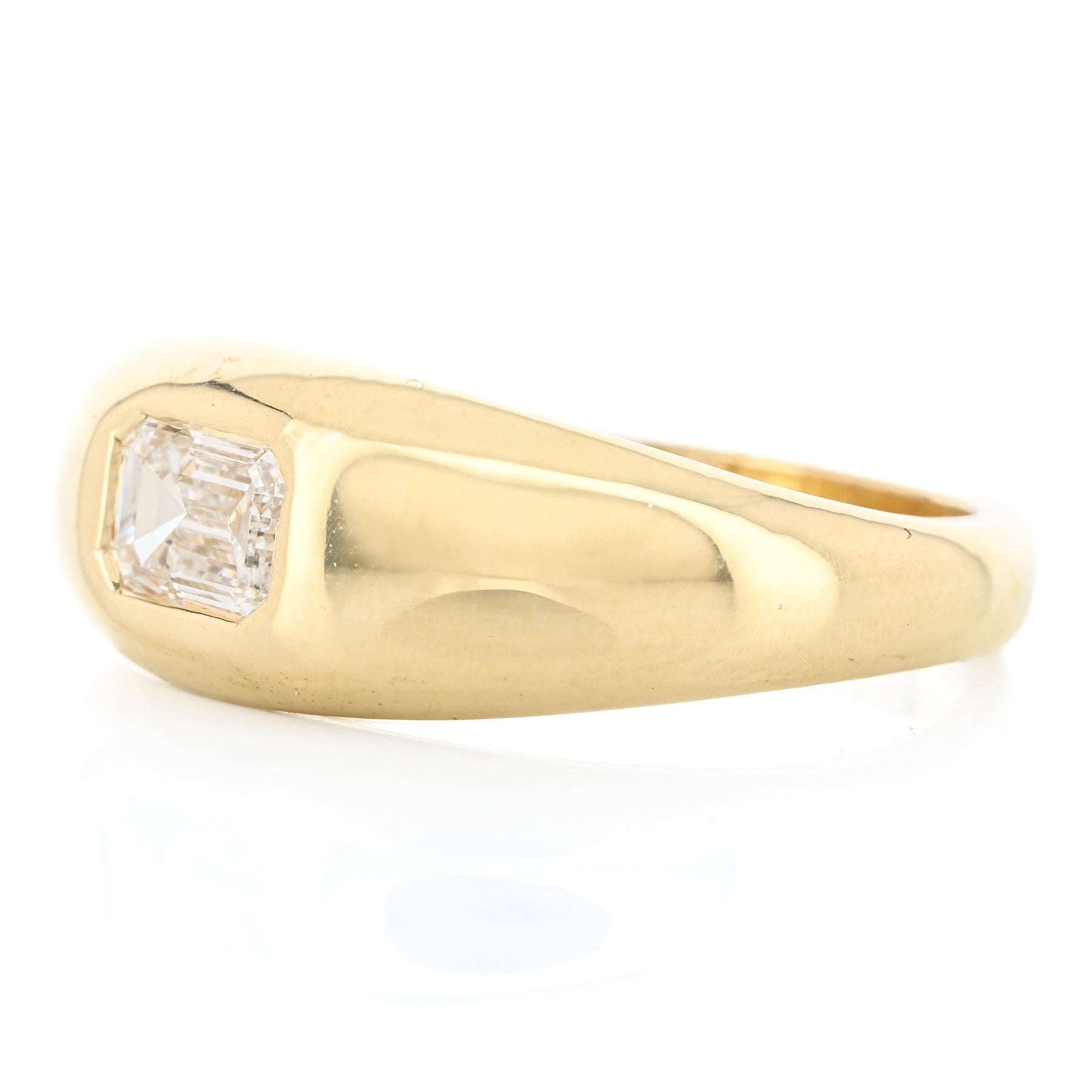 This 14K yellow gold dome band features a flush-set lab-grown emerald-shaped diamond totaling 0.50 carats. This ring is a size 6.5.