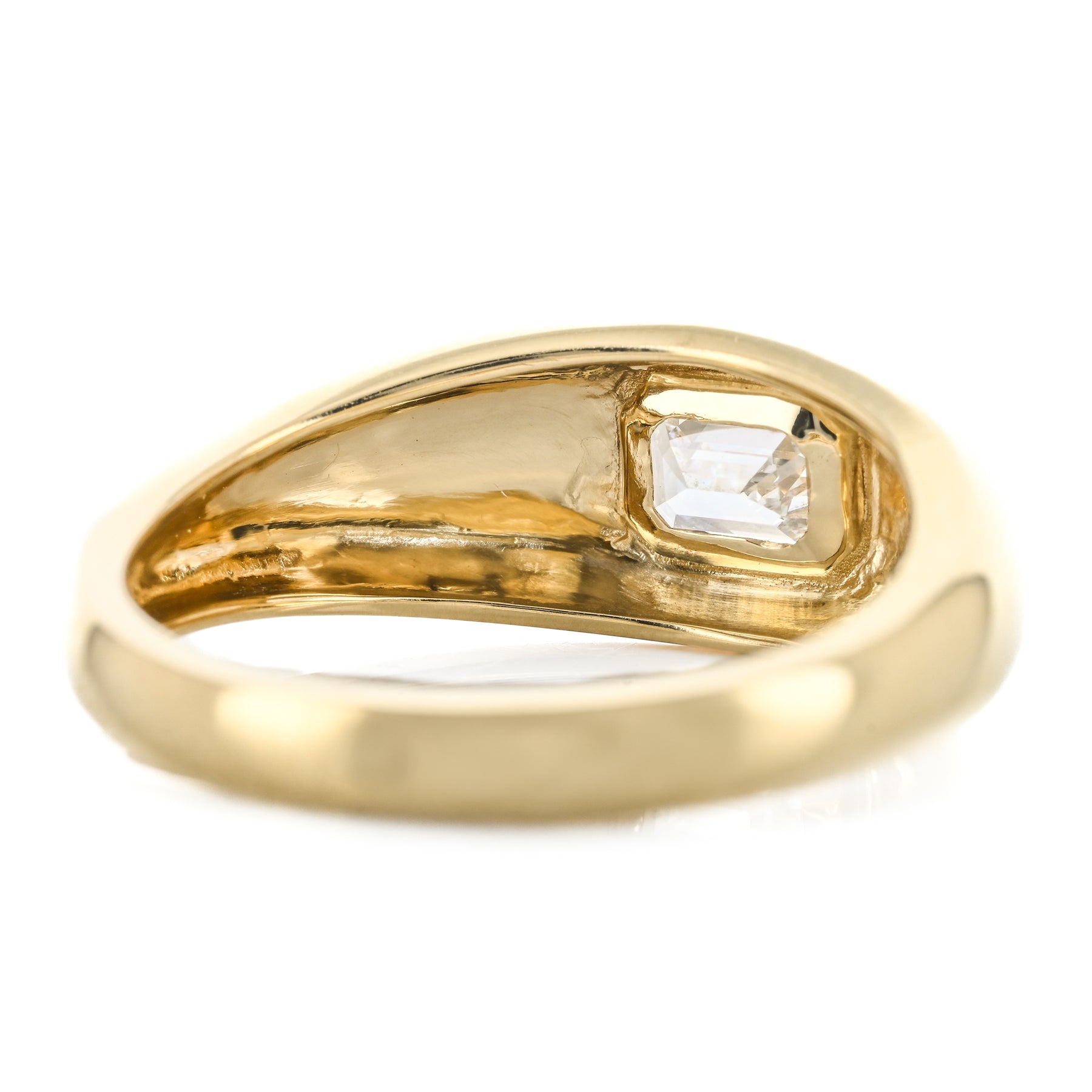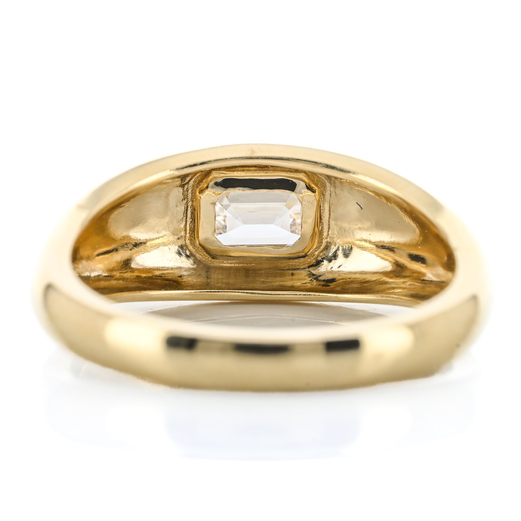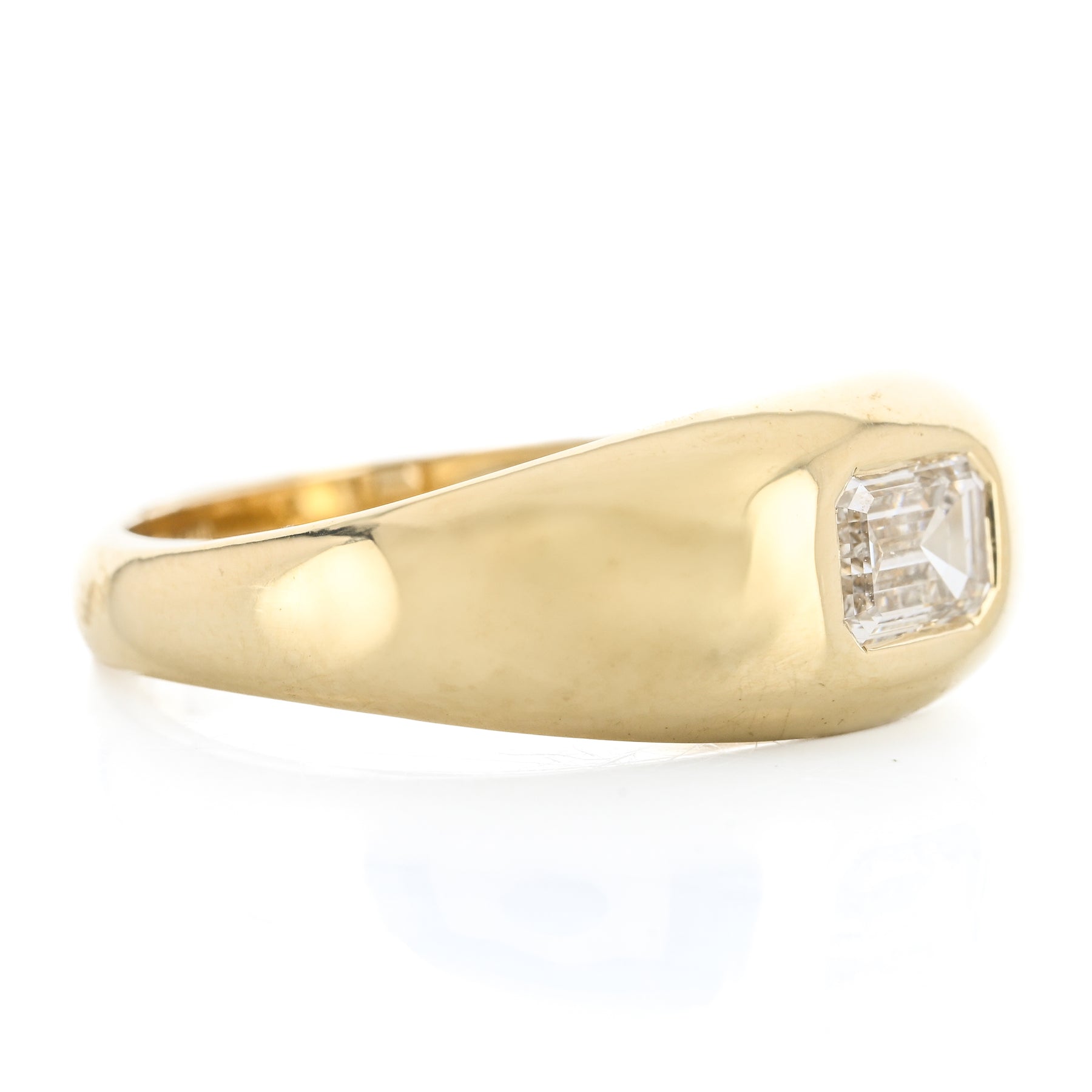This 14K yellow gold dome band features a flush-set lab-grown emerald-shaped diamond totaling 0.50 carats. This ring is a size 6.5.