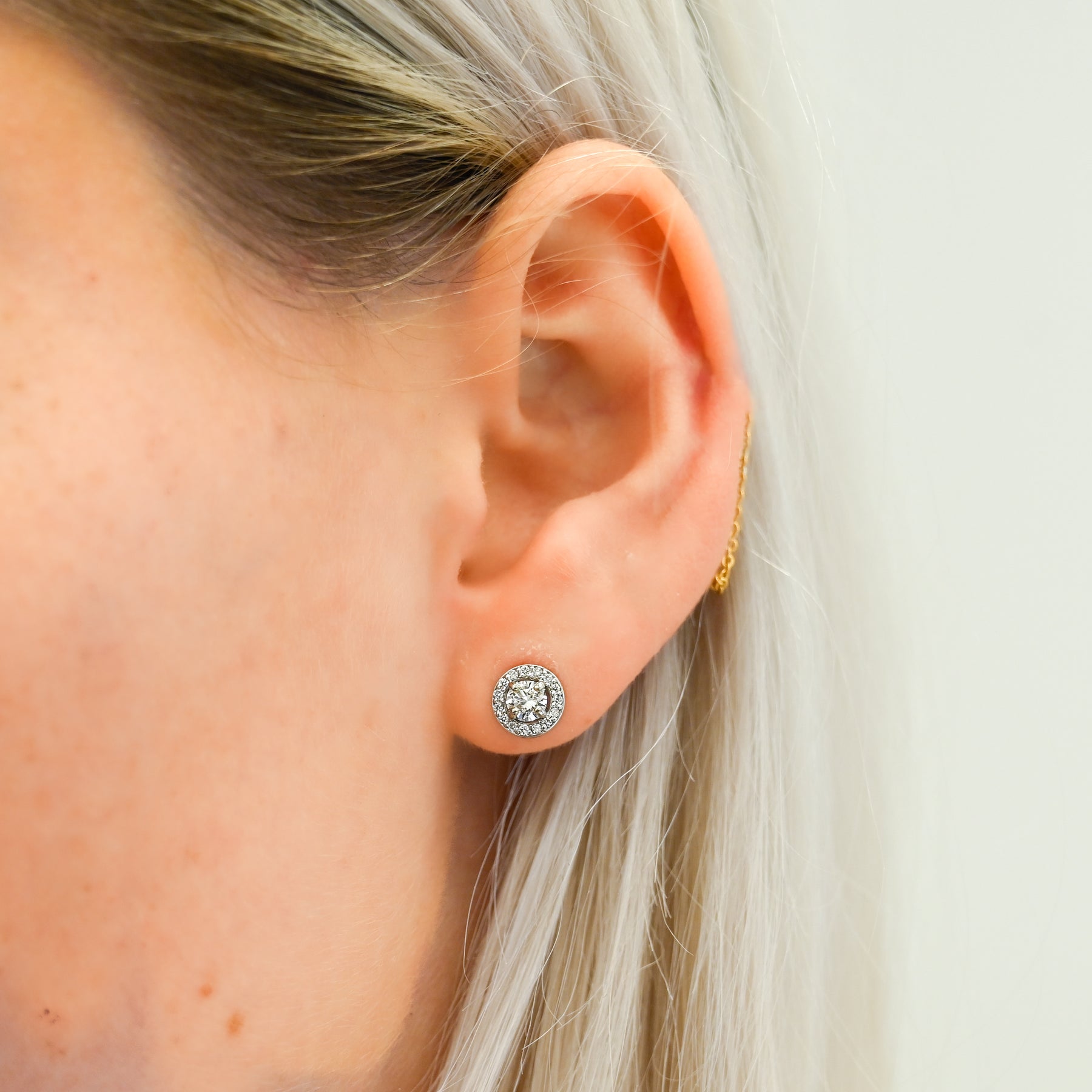 Introducing the .63ctw Round Diamond Halo Stud Earrings, featuring .50ct center diamonds graded IJ/VS2, crafted in 14K white gold.