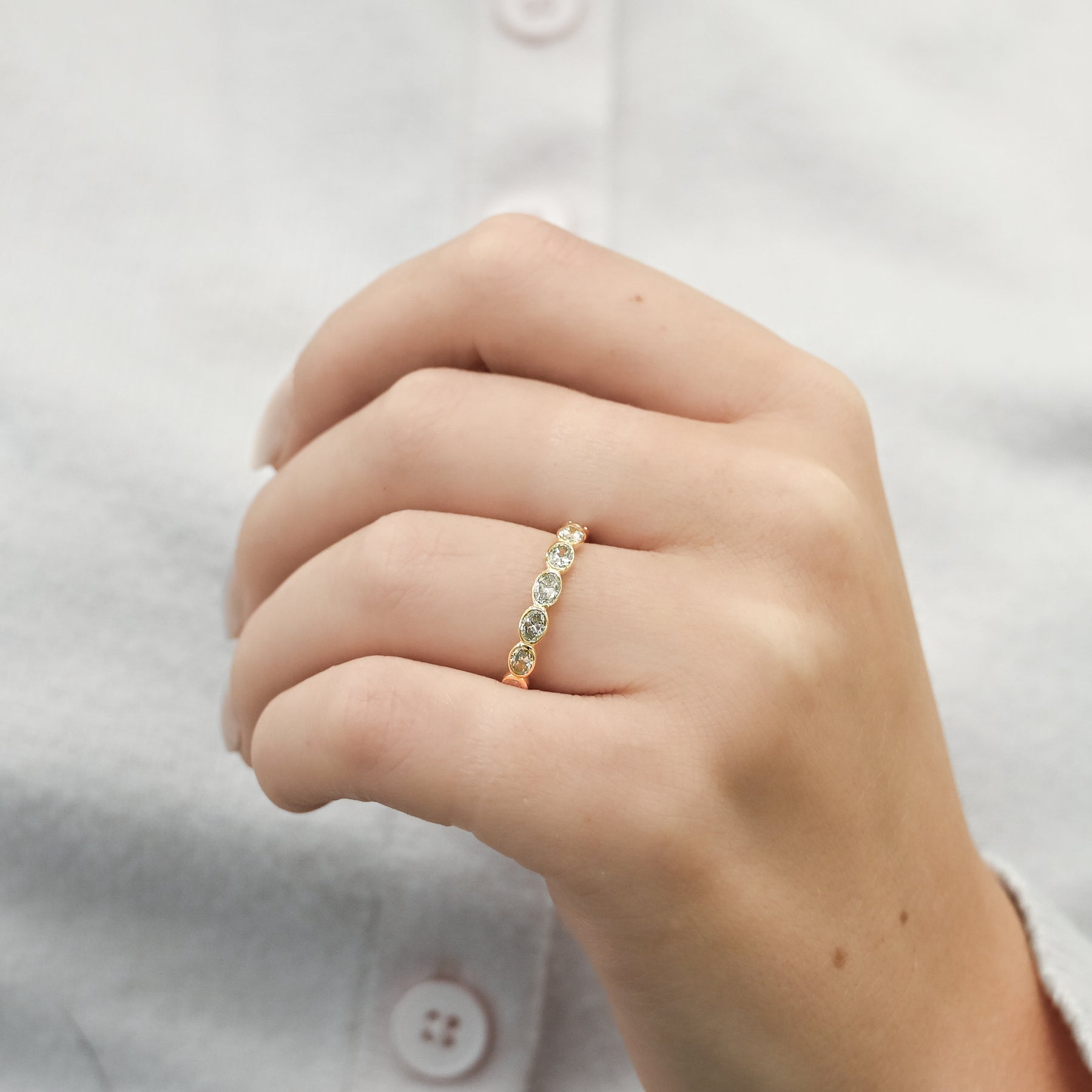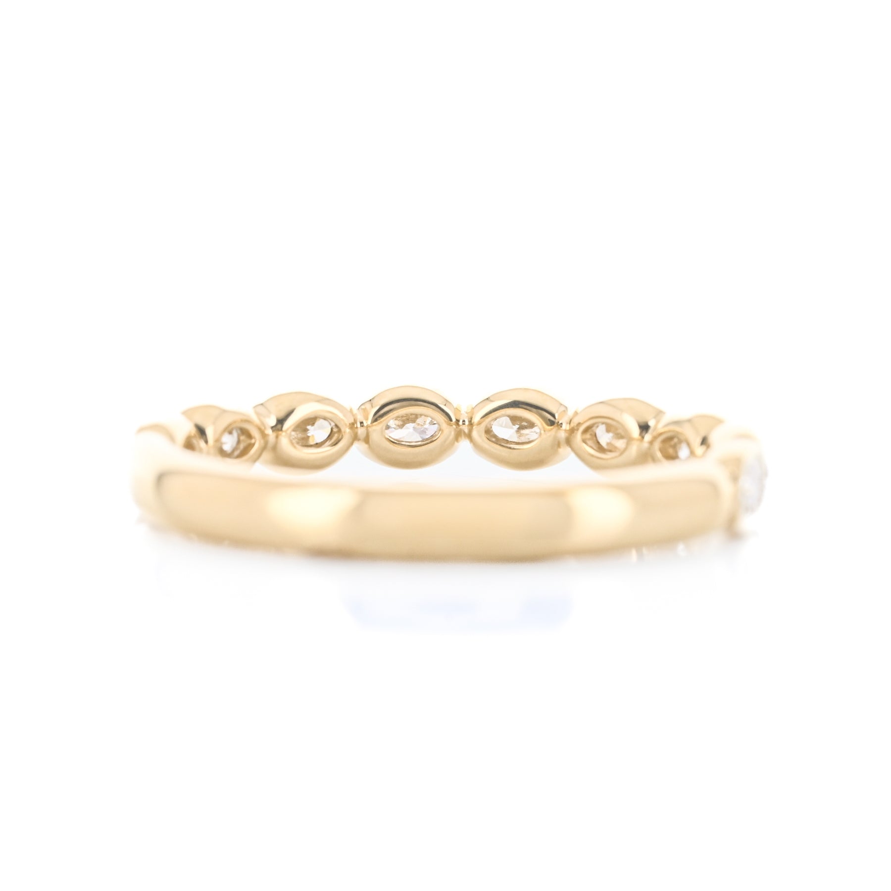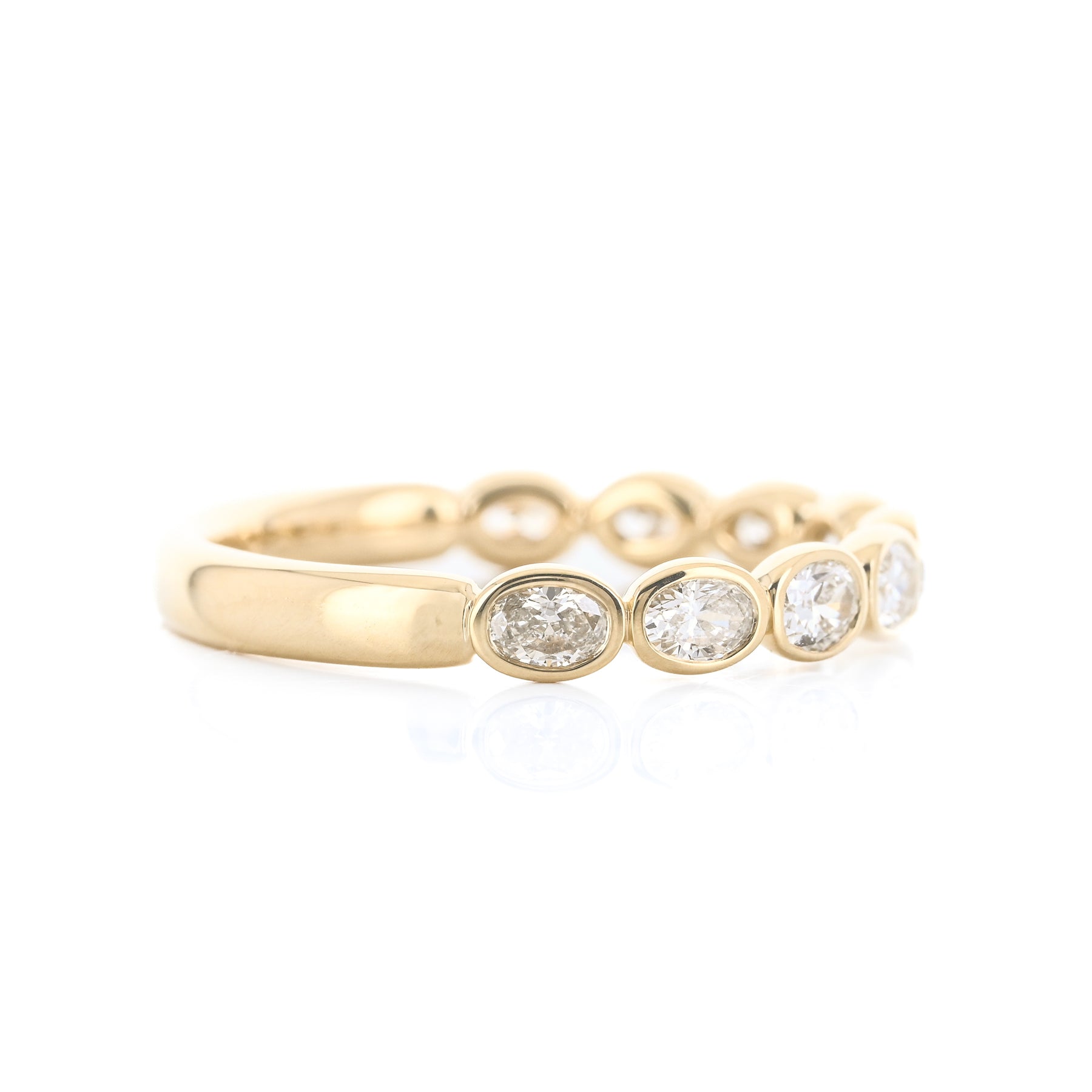 This 14K yellow gold band features east-west bezel-set oval natural diamonds totaling 0.73 carats. This ring is a size 6.5.