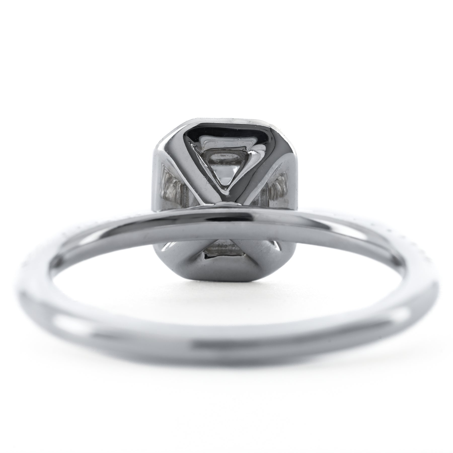 Introducing the .77ctw Emerald Diamond Engagement Ring featuring a halo, crafted in 14K white gold. This natural diamond engagement ring includes a .53 carat emerald-cut center diamond, graded E/SI1.