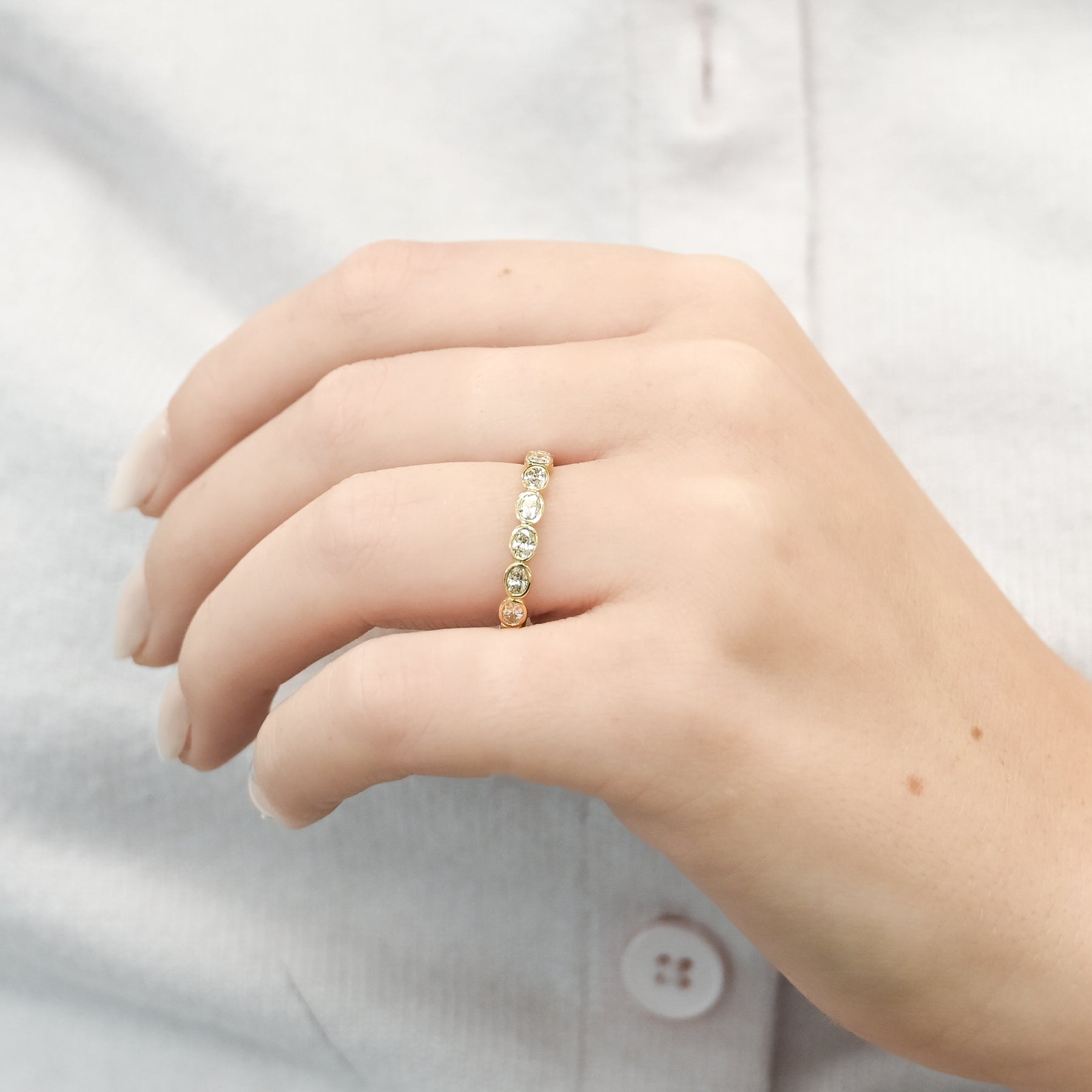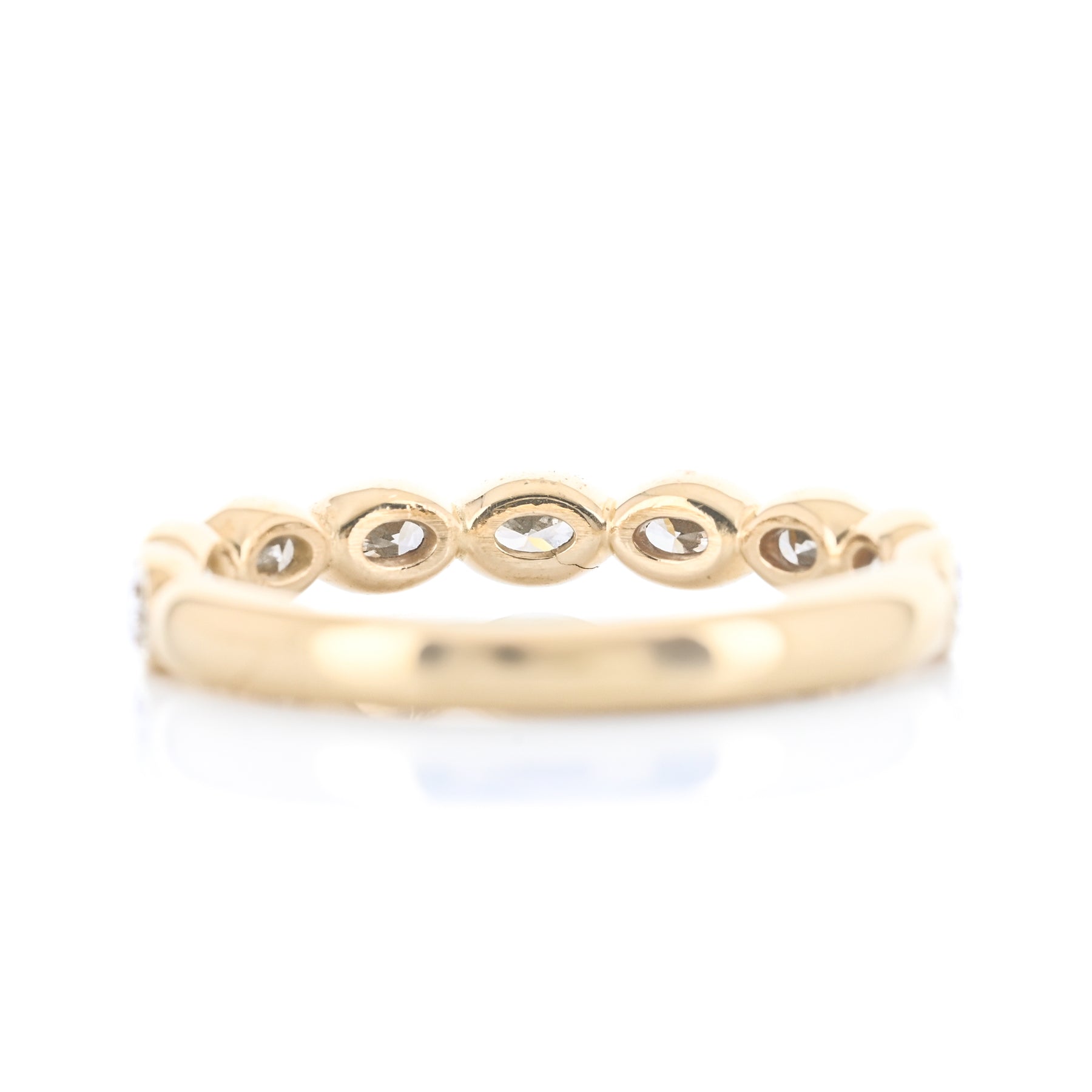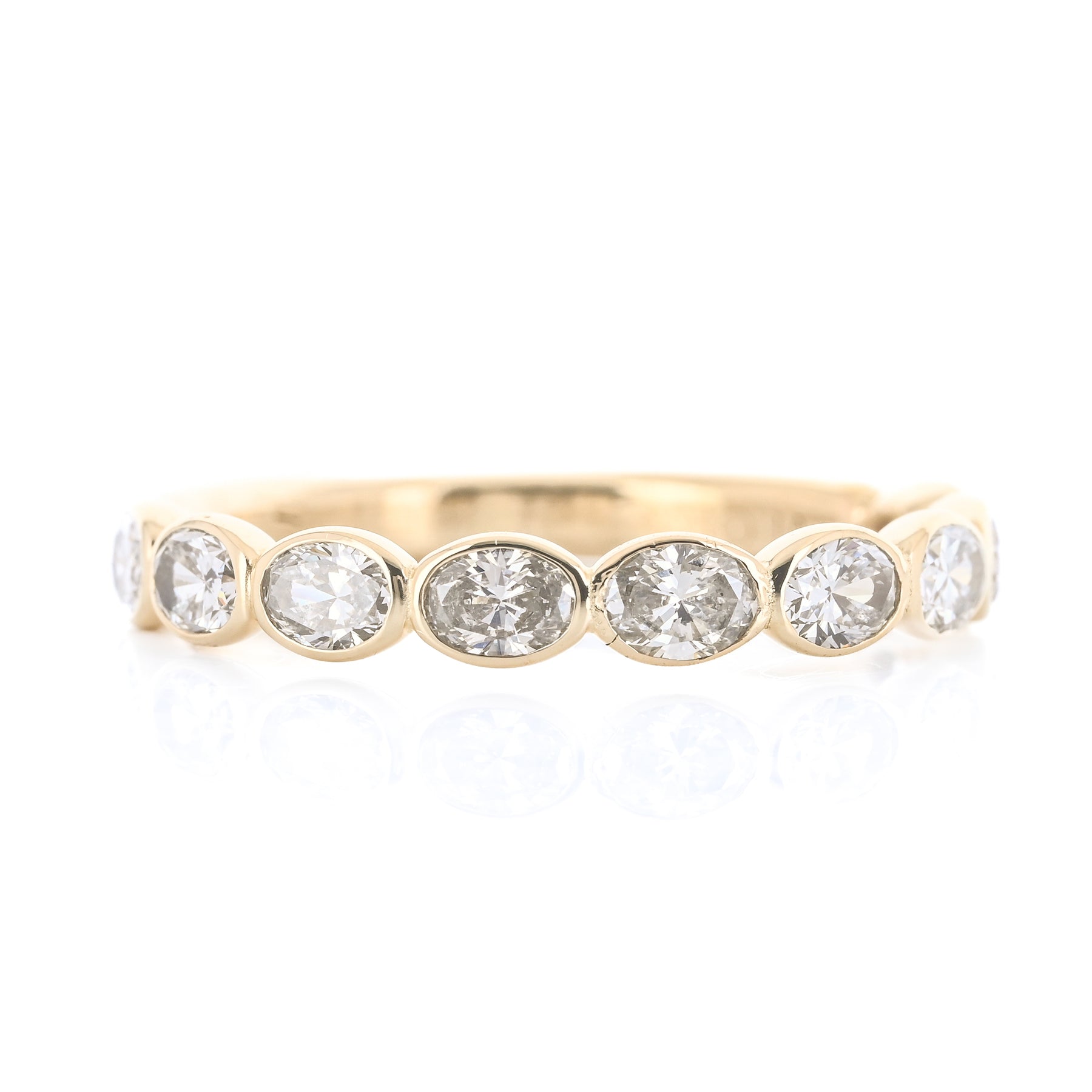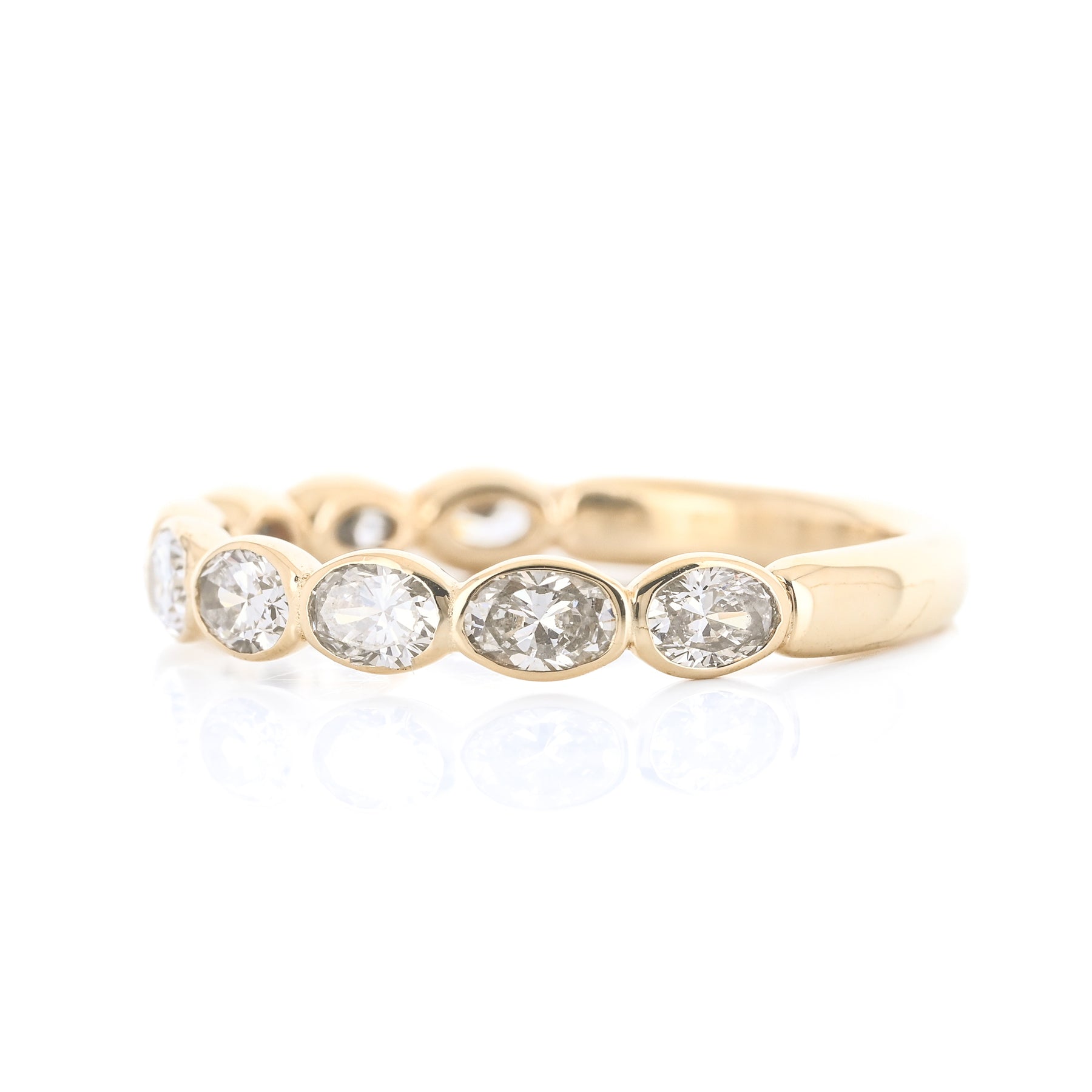 This 14K yellow gold stackable band features bezel-set lab-grown oval diamonds totaling 0.85 carats. This ring is a size 7.5.