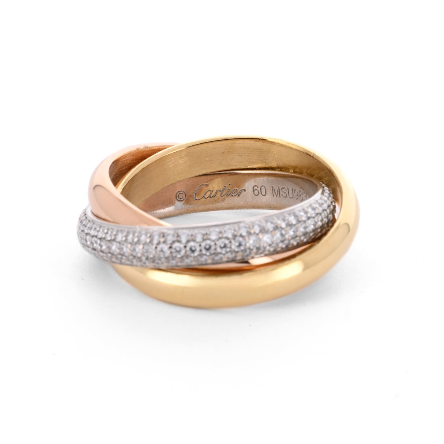 Introducing the pre-owned 0.64ctw Cartier Classic Trinity Ring, expertly crafted in 18k yellow gold, rose gold, and white gold. This ring is composed of three interlinked bands in white gold, rose gold, and yellow gold. Embellished with 156 natural diamonds totaling 0.64ctw.
