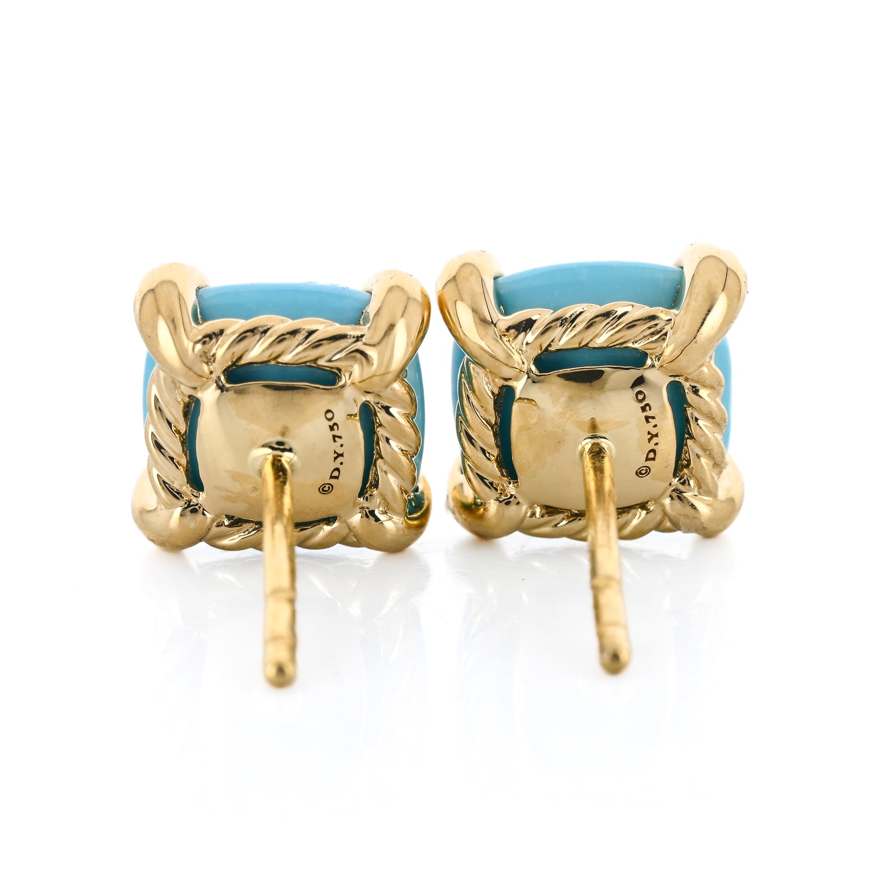 These estate David Yurman Châtelaine stud earrings are crafted in 18K yellow gold and feature vibrant turquoise centers accented by .06ctw of natural round brilliant diamonds. Elegant and timeless, they showcase Yurman’s iconic Châtelaine design with a refined pop of color.