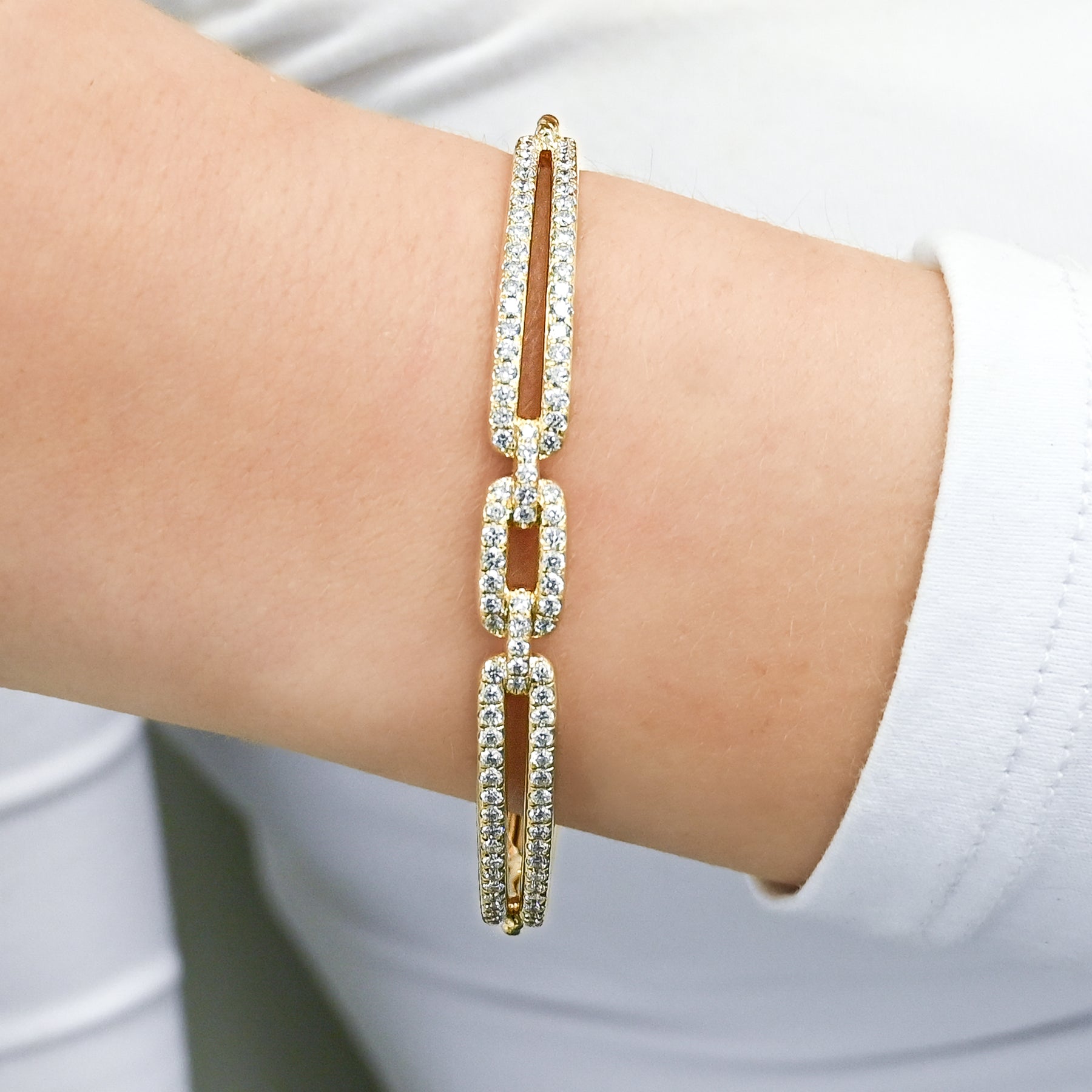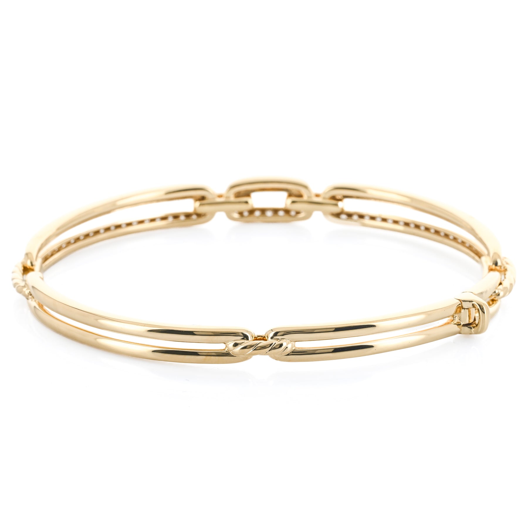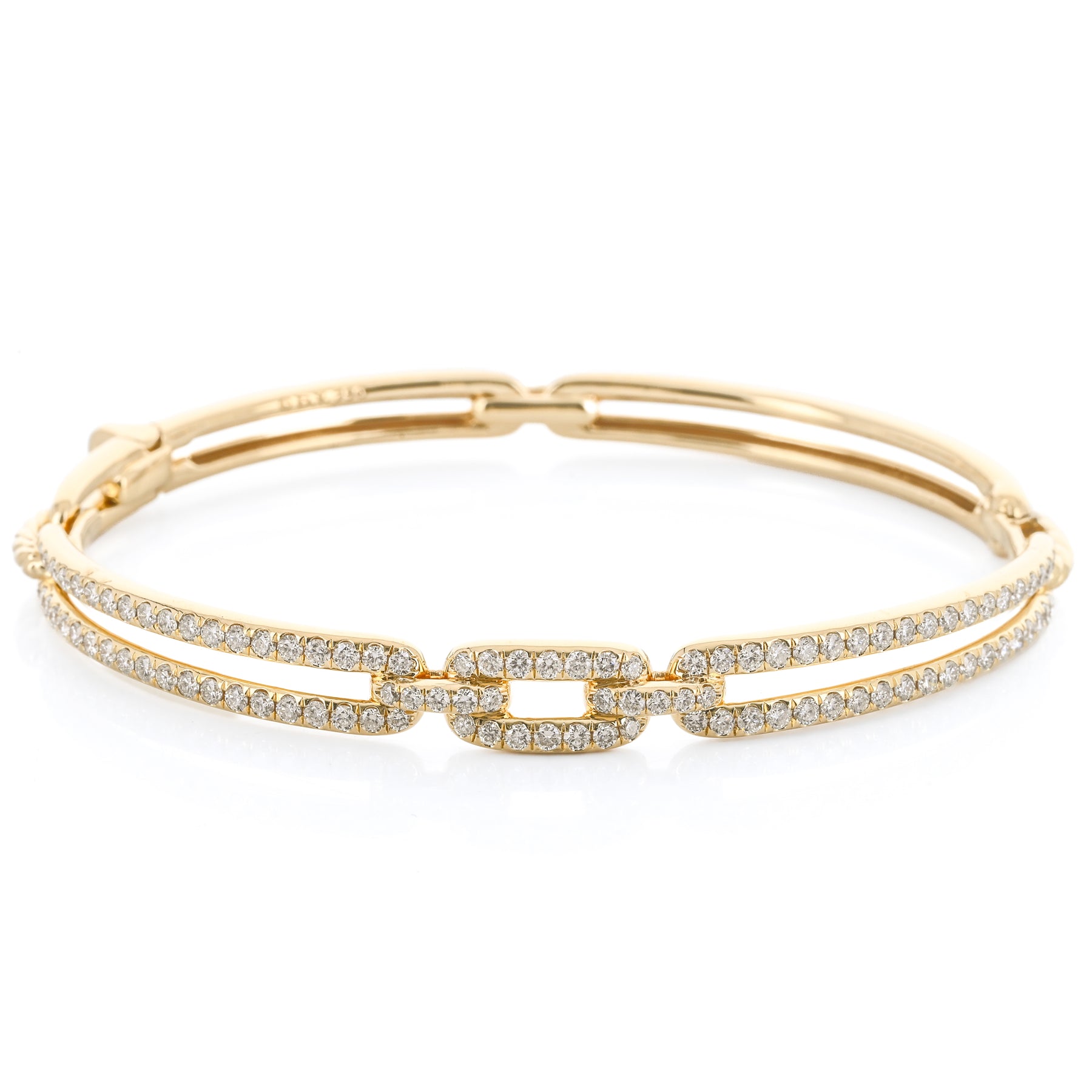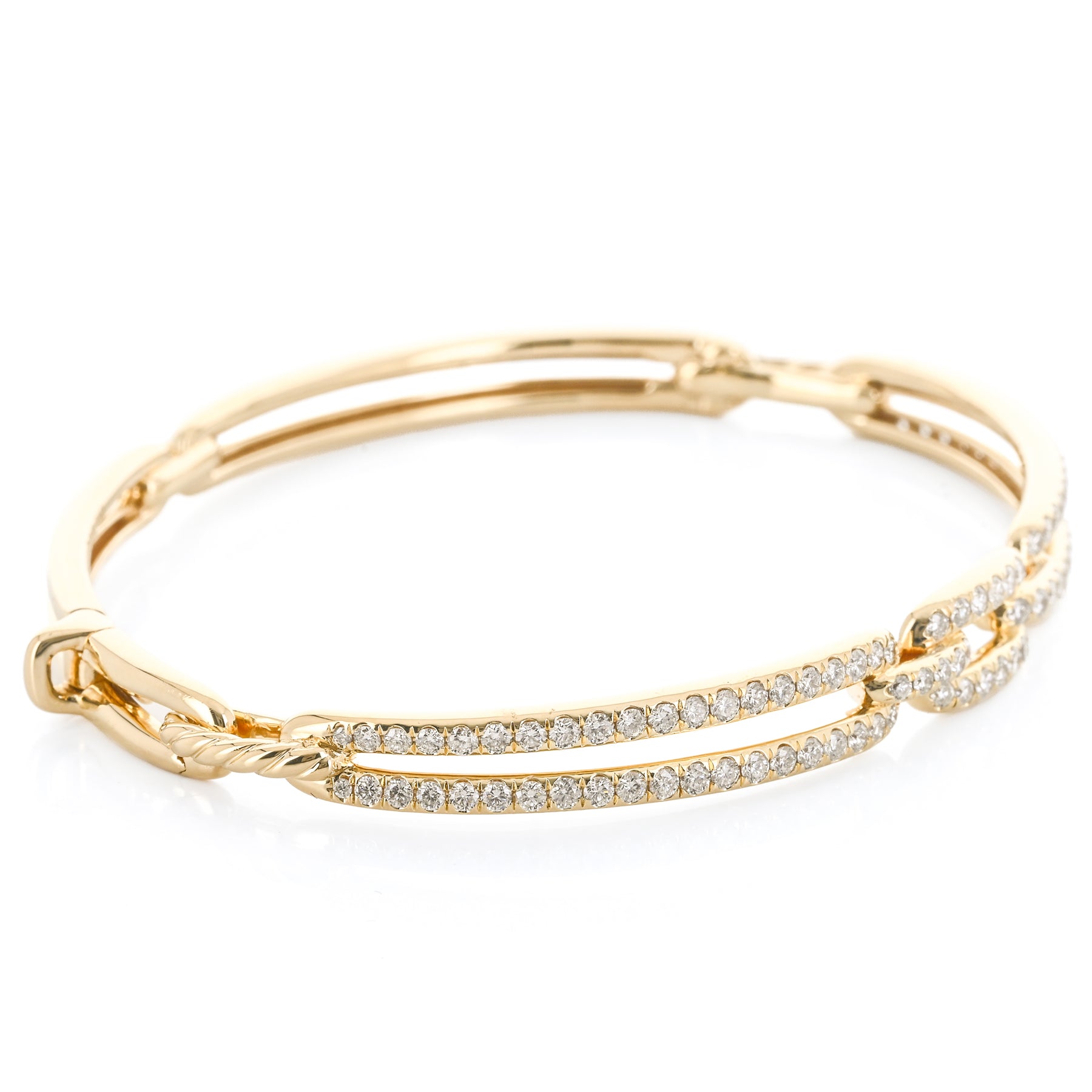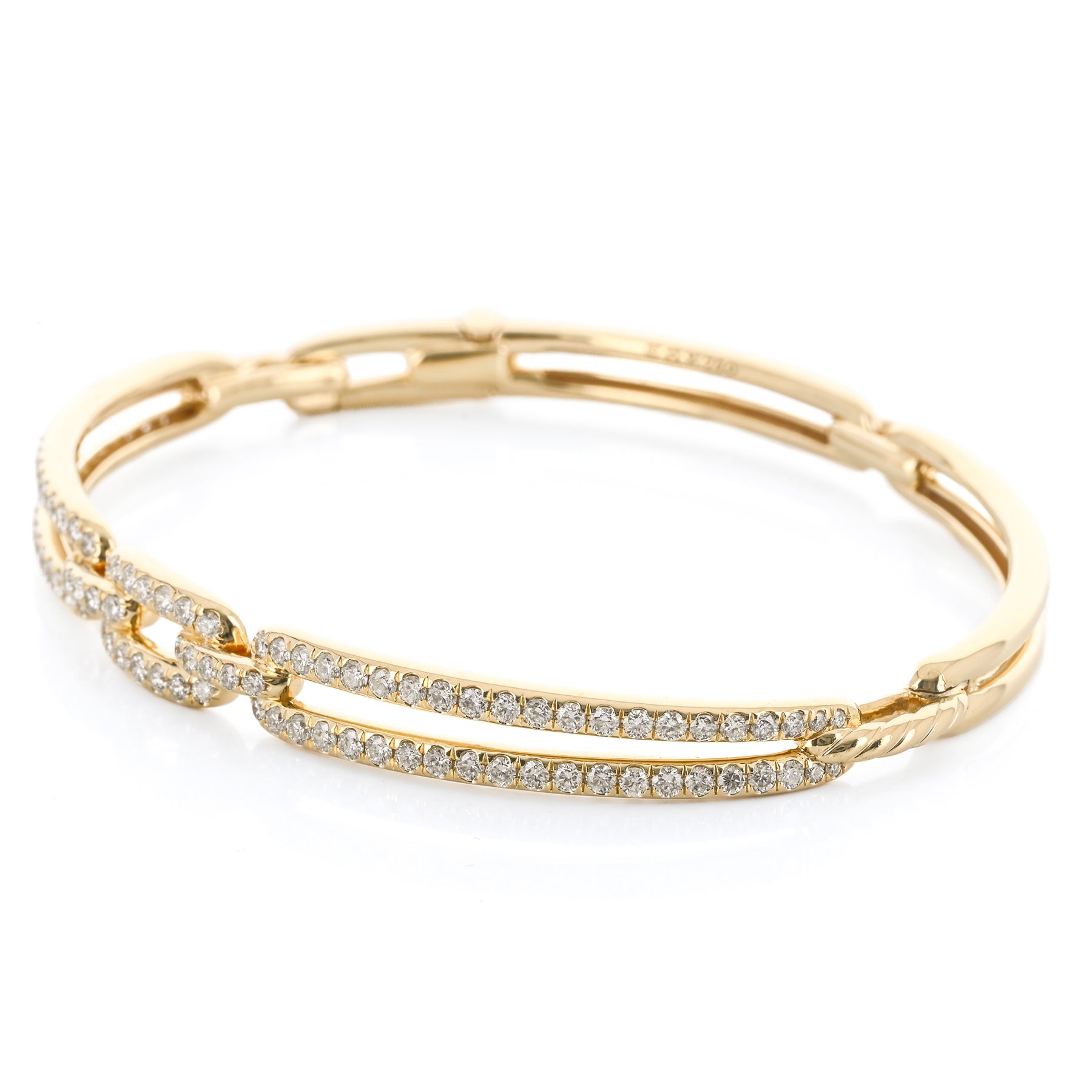 This estate David Yurman Stax Link bangle is crafted in 18K yellow gold and showcases 1.56ctw of round brilliant GH/VS diamonds. Measuring 6.5”, it features the bold, architectural Stax design with Yurman’s signature blend of luxury and texture.