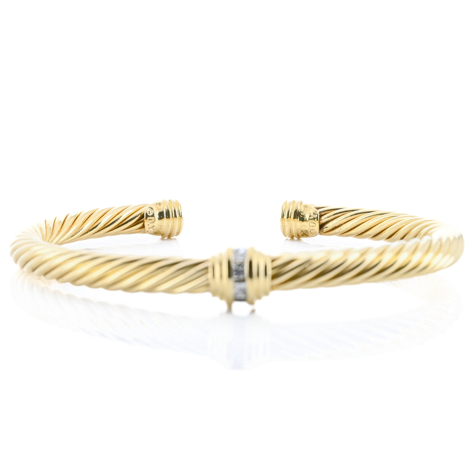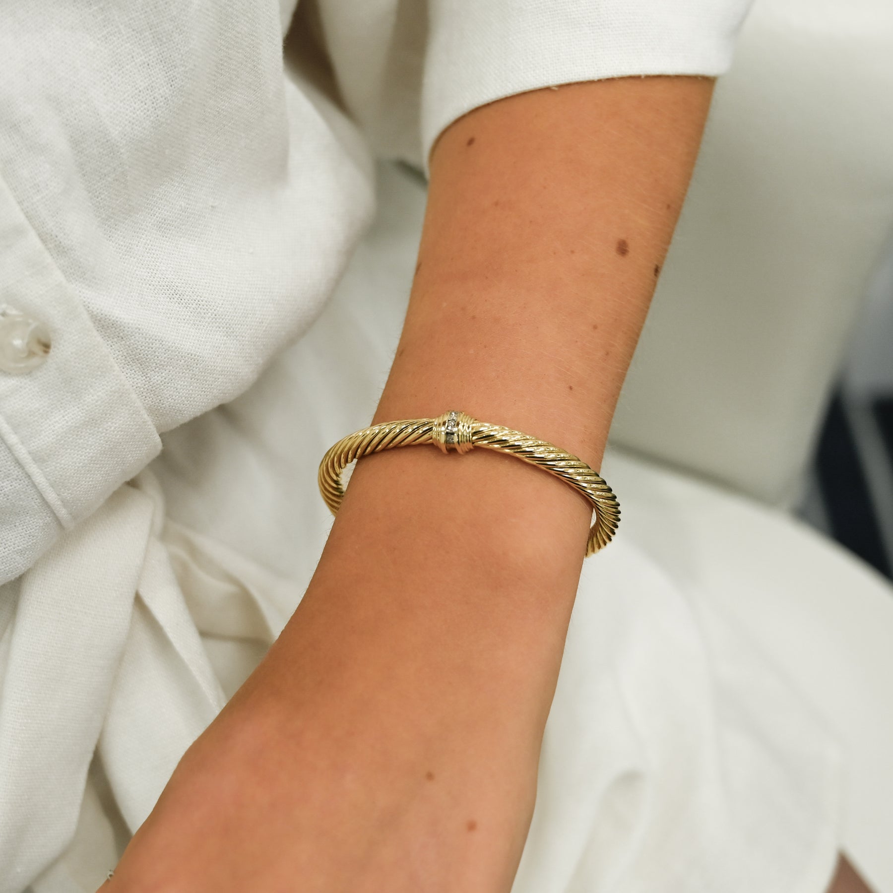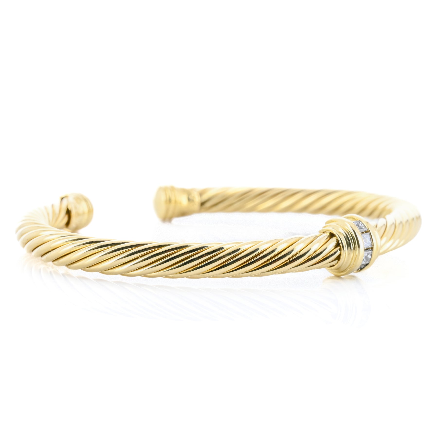 This estate piece, David Yurman CableSpira Bangle, features .33ctw princess cut diamonds, crafted in 18K yellow gold with 5mm width and 6.75-inch length.