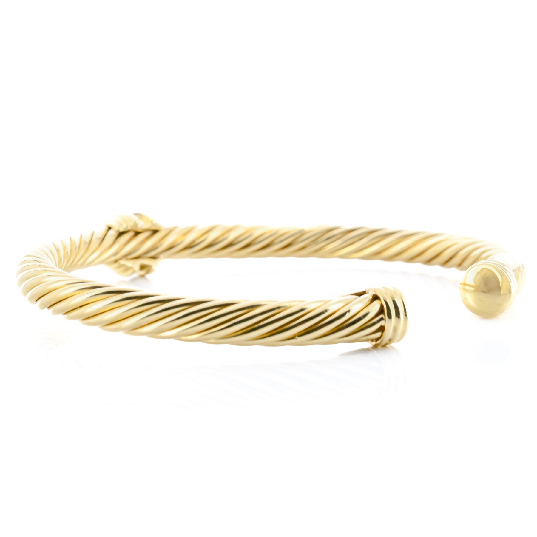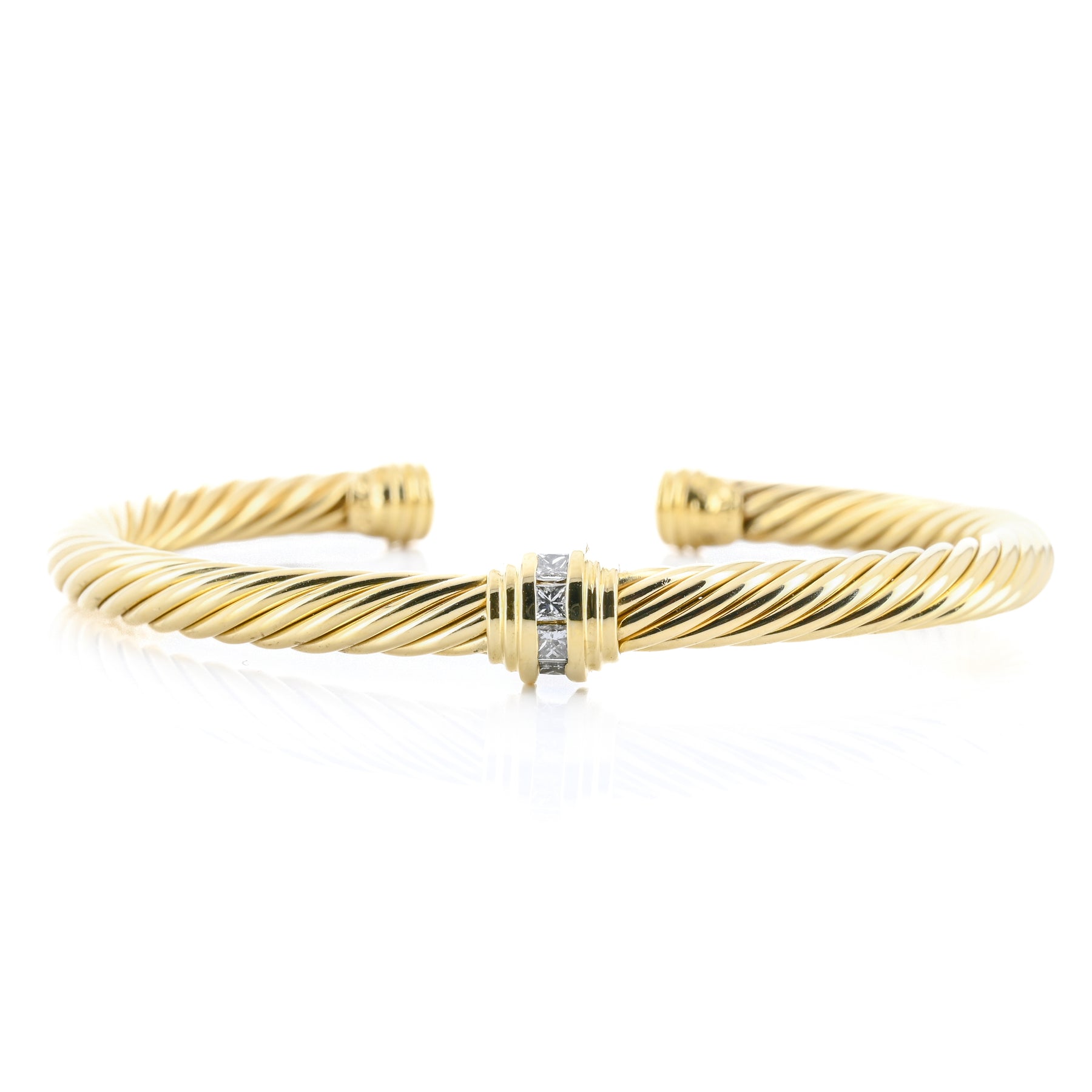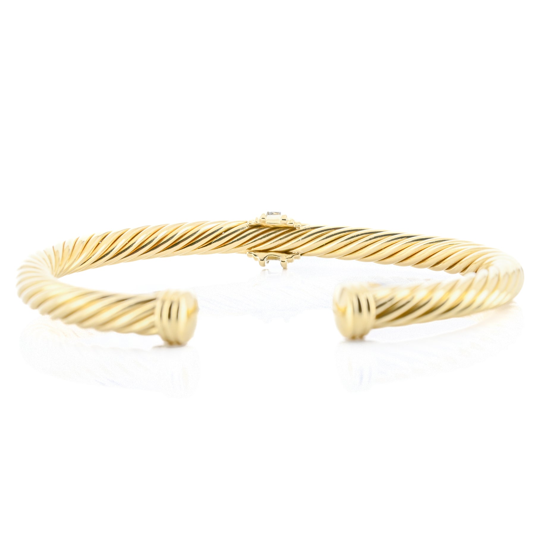 This estate piece, David Yurman CableSpira Bangle, features .33ctw princess cut diamonds, crafted in 18K yellow gold with 5mm width and 6.75-inch length.